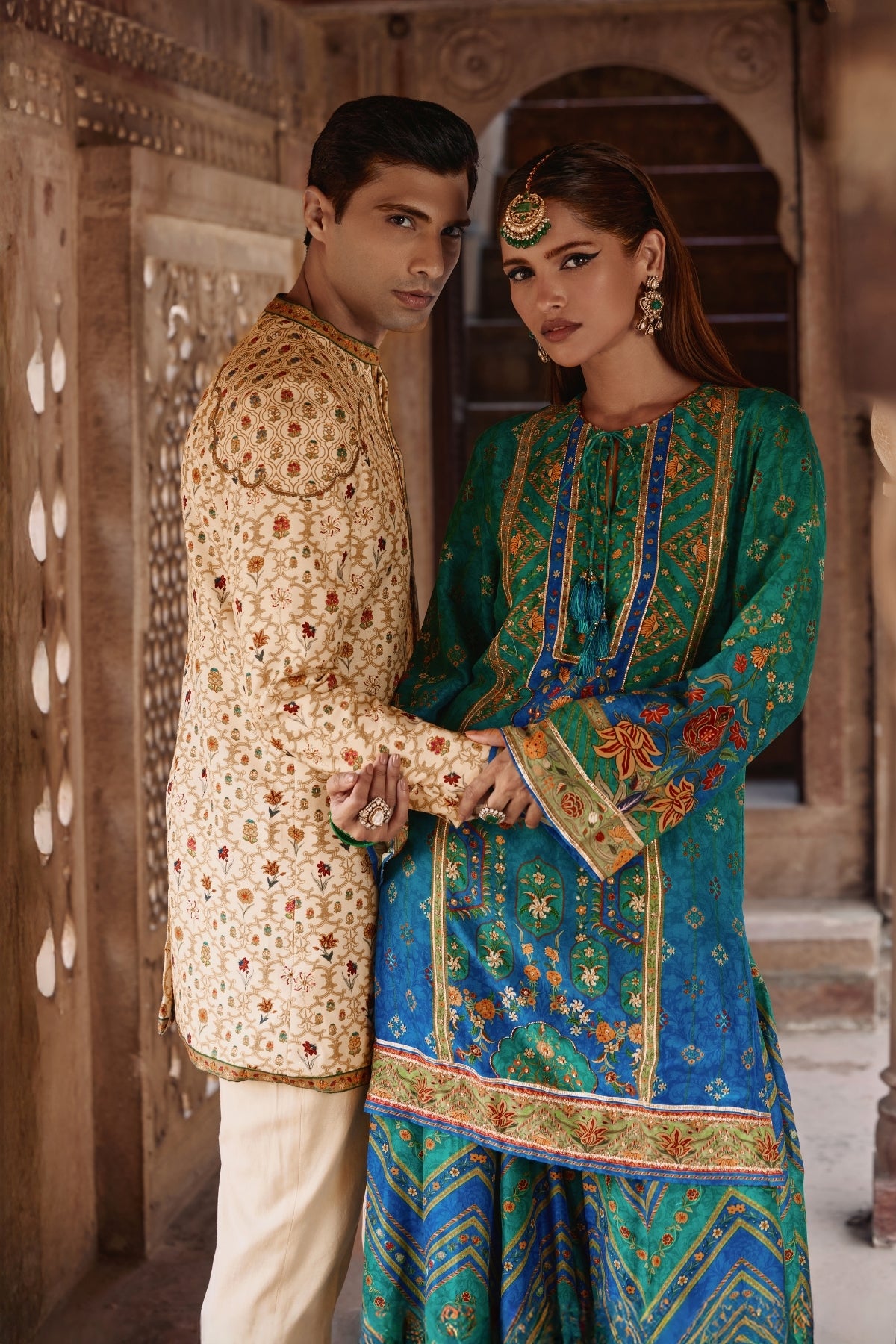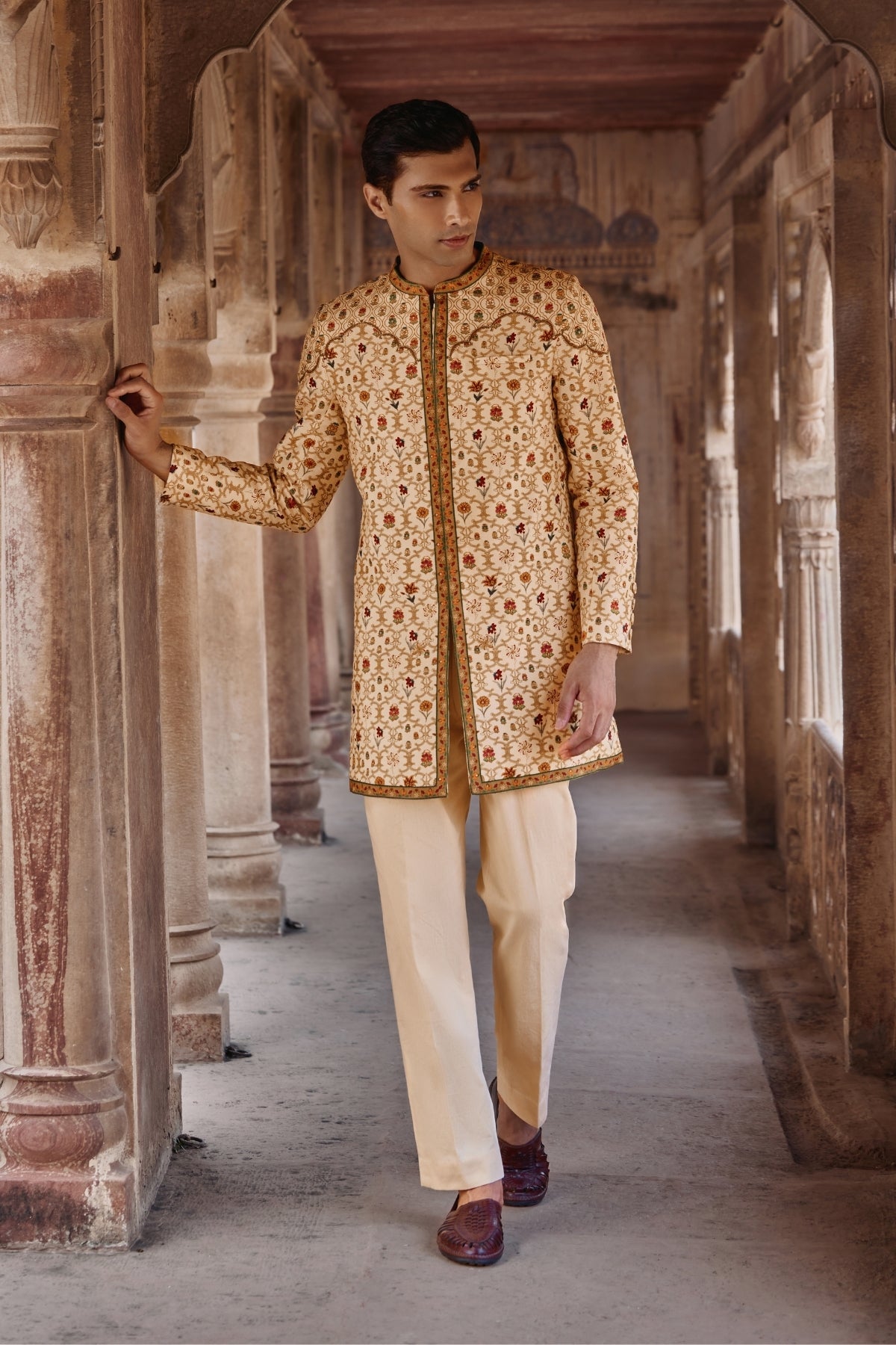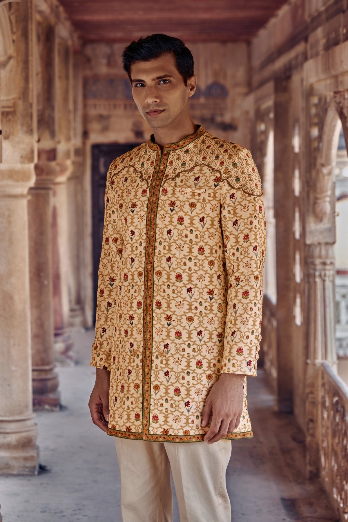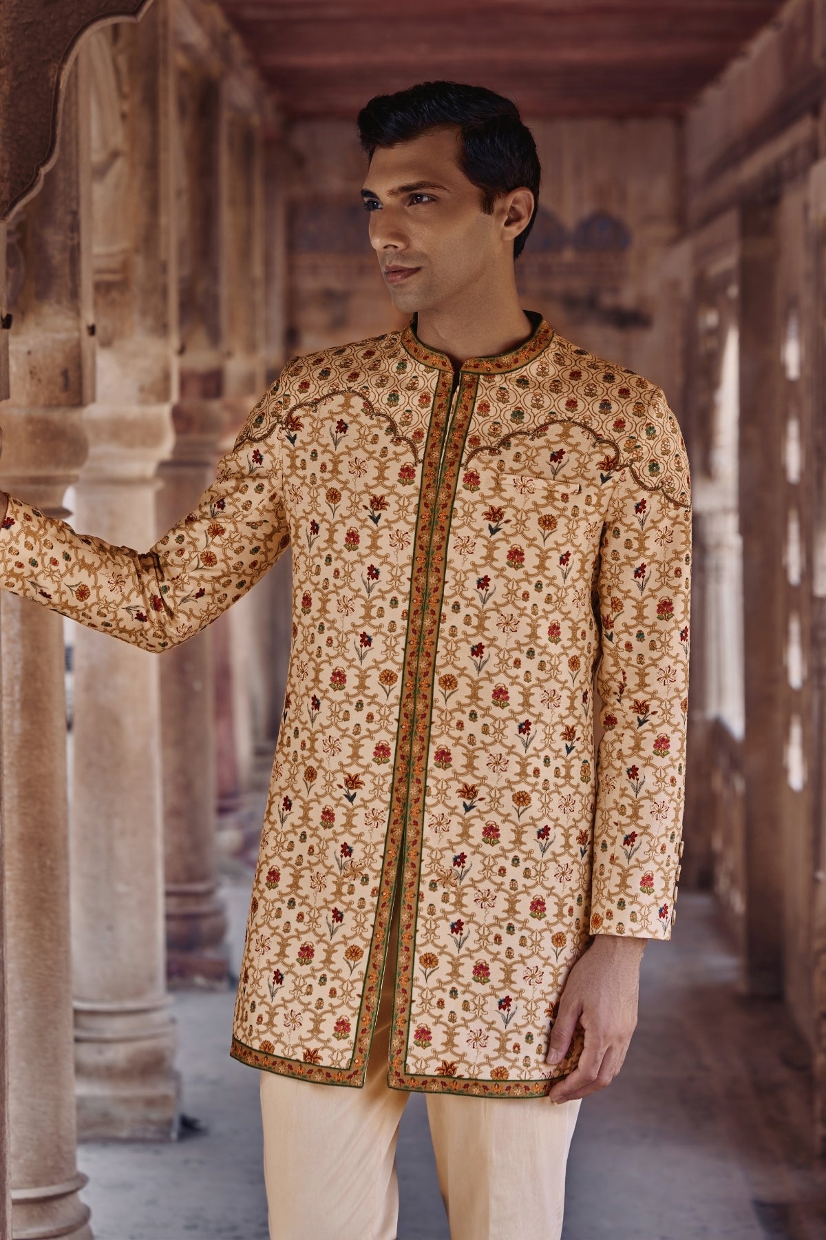 Indulge in elegance in our classic Amir achkan Set. Classic vintage paisley design all over.Embrased with neck band and placket perfect for that contemporary Indian look.