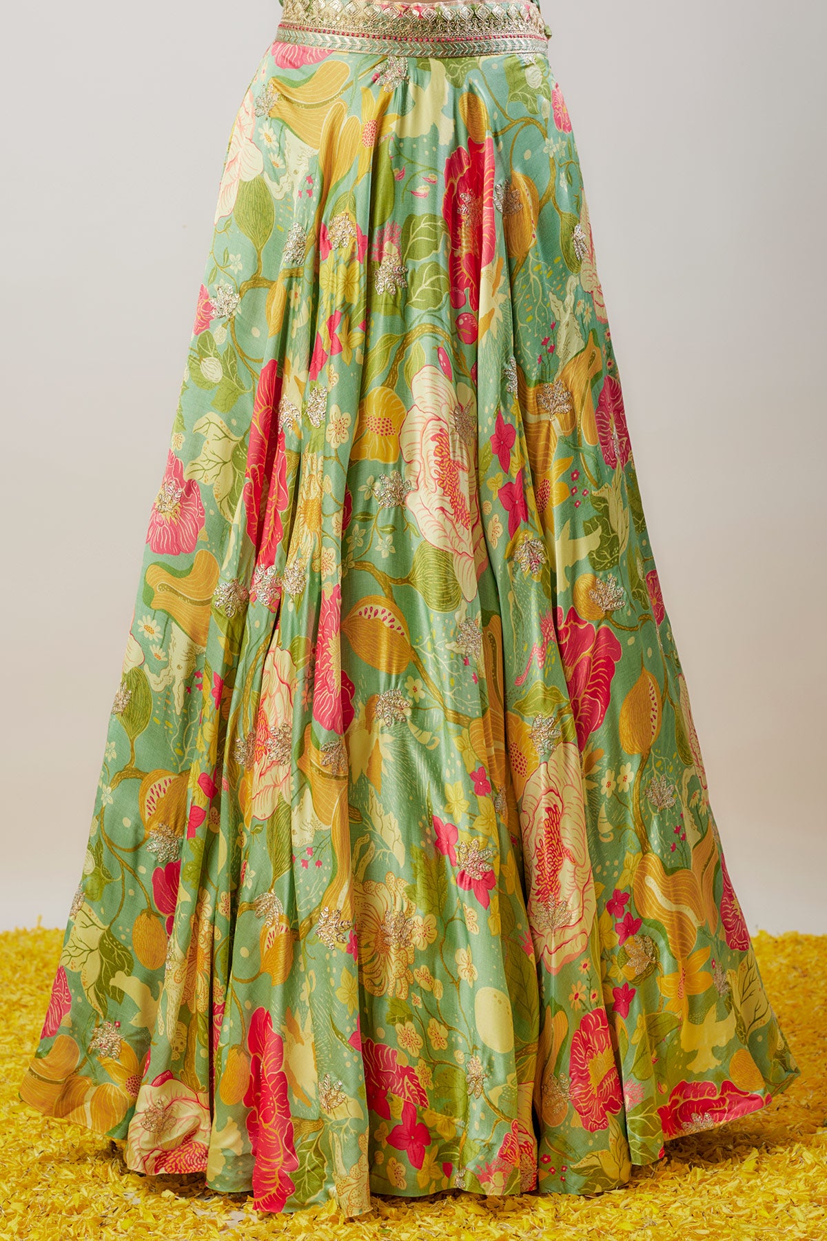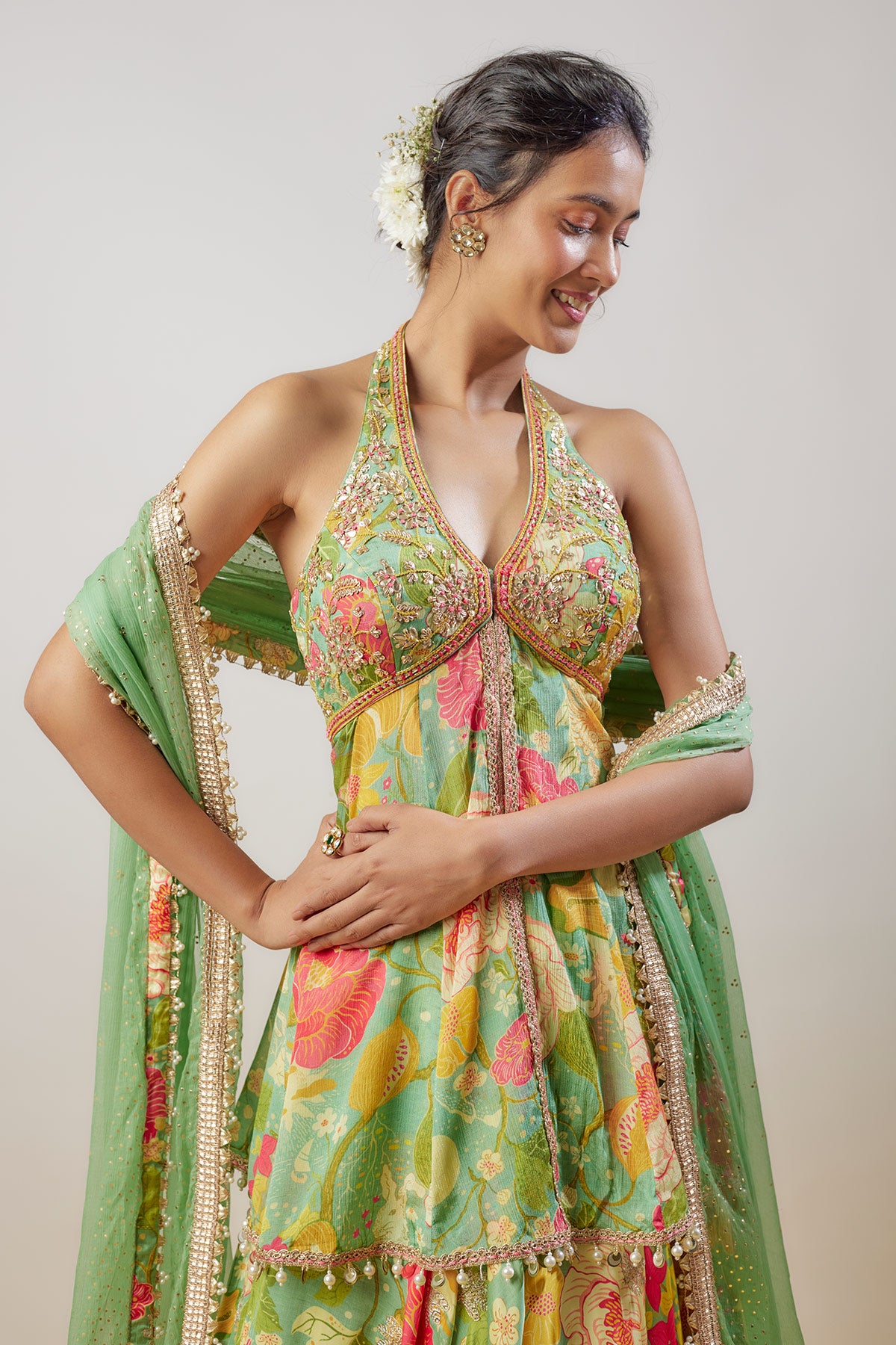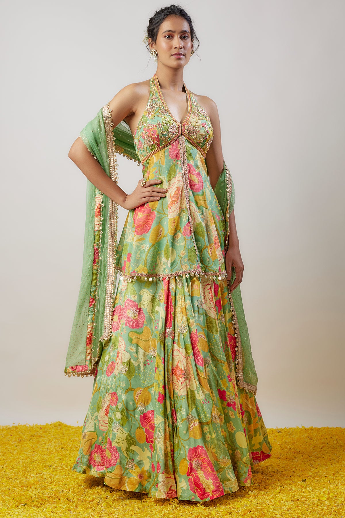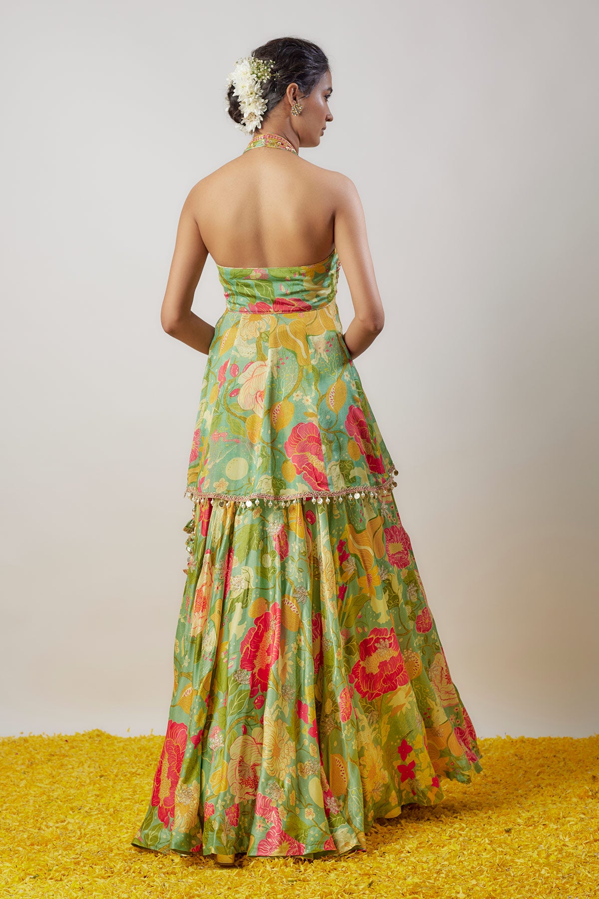 This halter neck floral-printed peplum top is paired with a voluminous Victorian-style skirt, creating a fusion of contemporary charm and vintage elegance. A statement outfit perfect for making a bold and graceful impression at any event.