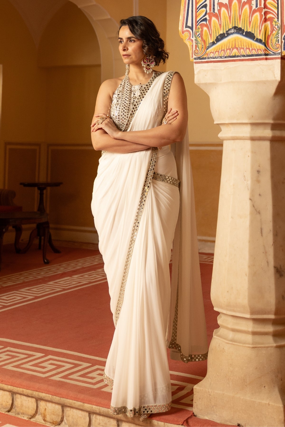 Description: A perfect blend of modern glamour and traditional artistry, this ensemble features a fully mirror hand-embroidered halter neck blouse, designed to make a striking statement with its intricate craftsmanship and contemporary silhouette. The reflective mirror work adds radiant shimmer, elevating the blouse with refined elegance. Paired with a solid ivory georgette pre-stitched saree, the look flows effortlessly while offering ease and comfort. The saree is beautifully finished with a broad mirror hand-embroidered edge running all over, adding richness and visual depth to the ensemble. Ideal for weddings, festive soirées, and evening celebrations, this set embodies sophisticated charm with a fashion-forward edge.