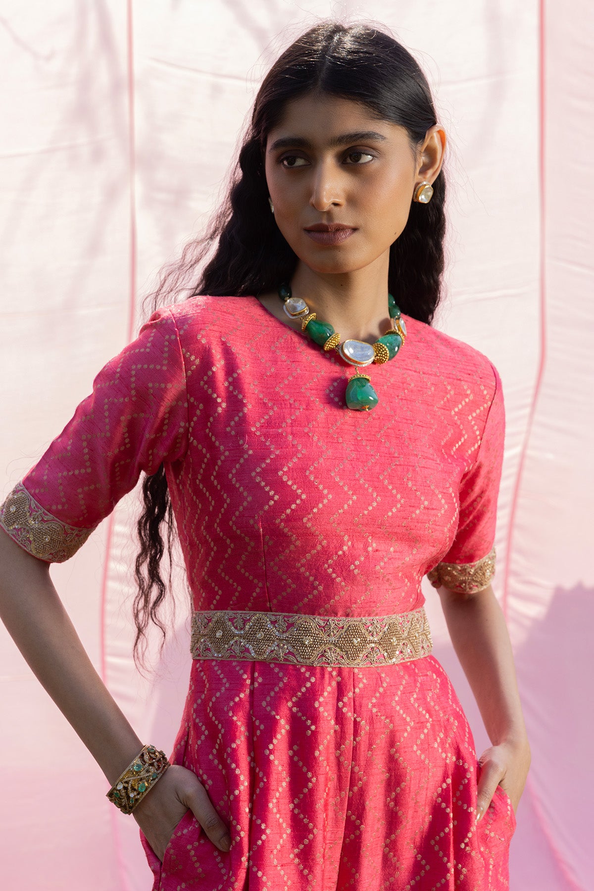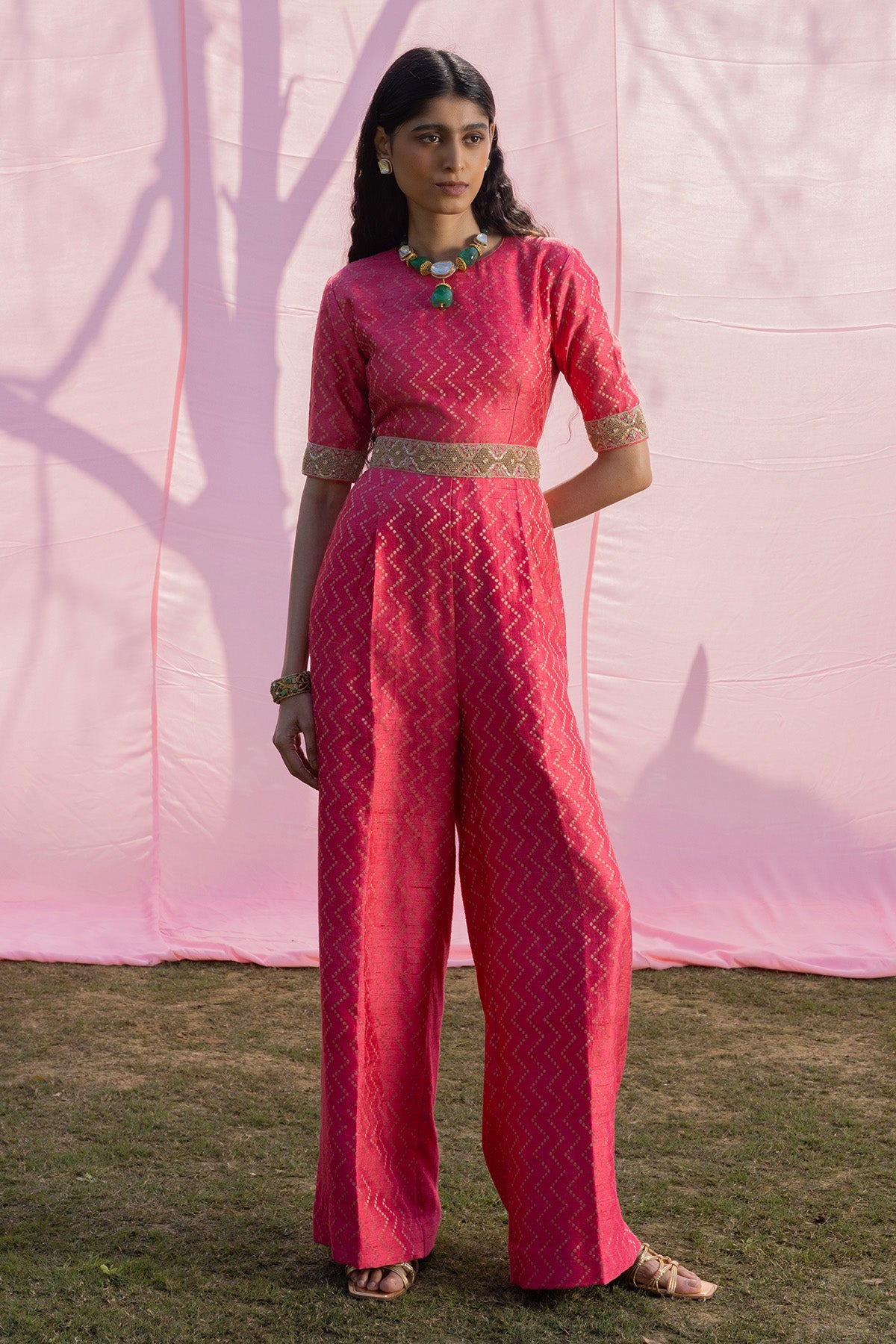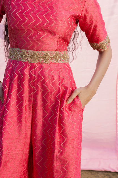 Moonga Colour Banarasi Silk Jumpsuit With Richness of Zardozi Embroidery and Back Cut Out Shape