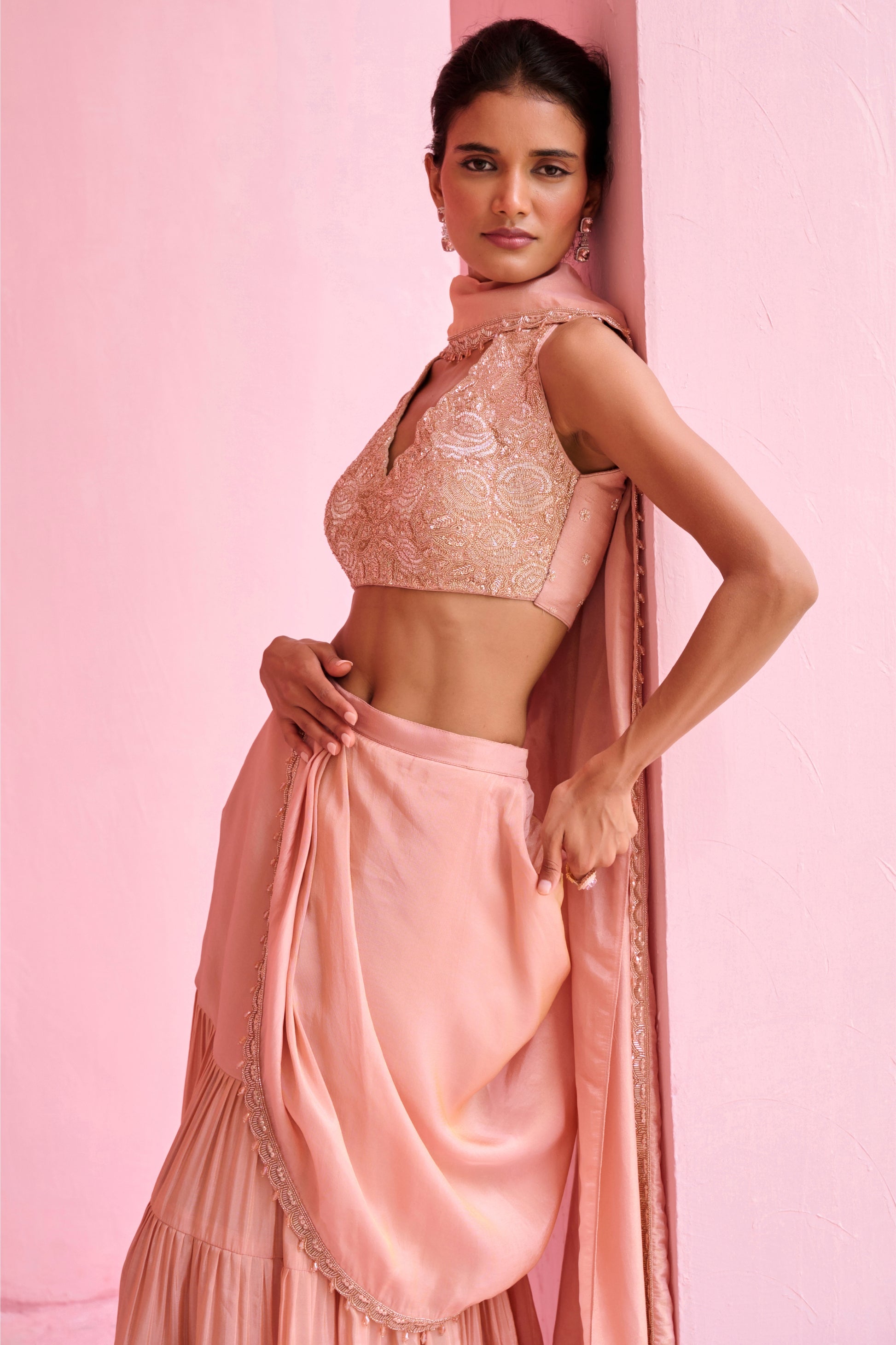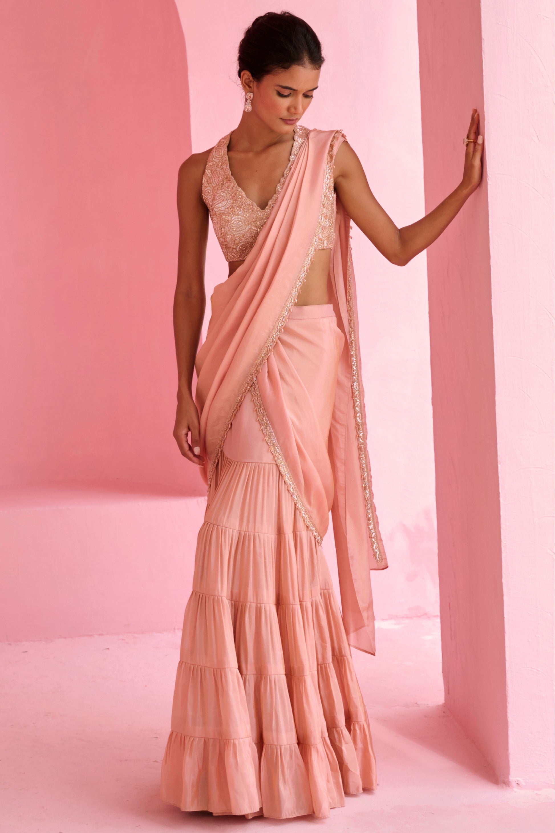 Tissue pre-draped tiered saree paired with glass beads and sequence encrusted halter blouse.