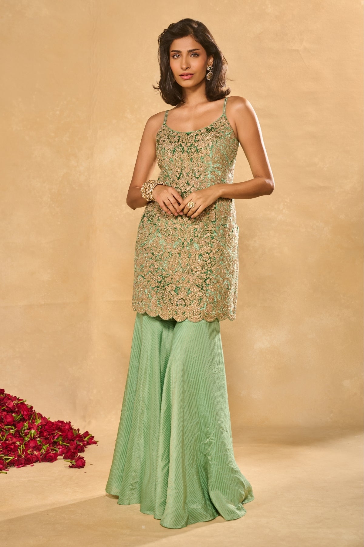 Tissue jamawar sharara paired with a delicately embroidered velvet kurta, embellished with zari, sequence and glass beads and a sheer organza dupatta with delicate detailed edging