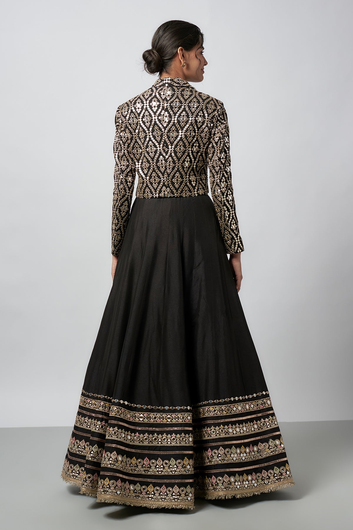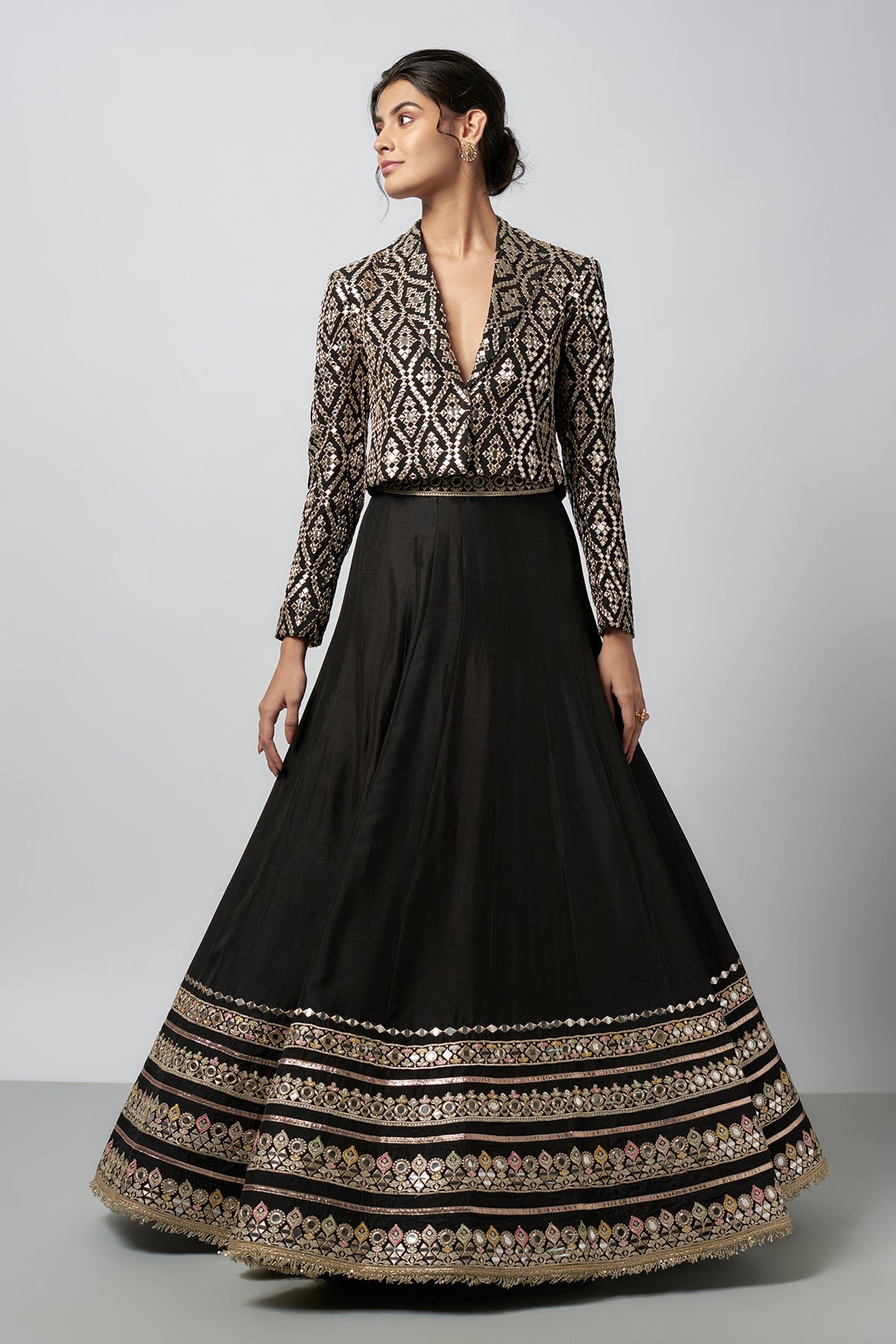 This Set Features A Fitted Full-Sleeve Jacket With Geometric Patterns, Exuding Elegance And Sophistication. Paired With A Voluminous Black Flared Skirt Featuring Detailed Metallic Embroidery And Mirror Accents Along The Hemline.