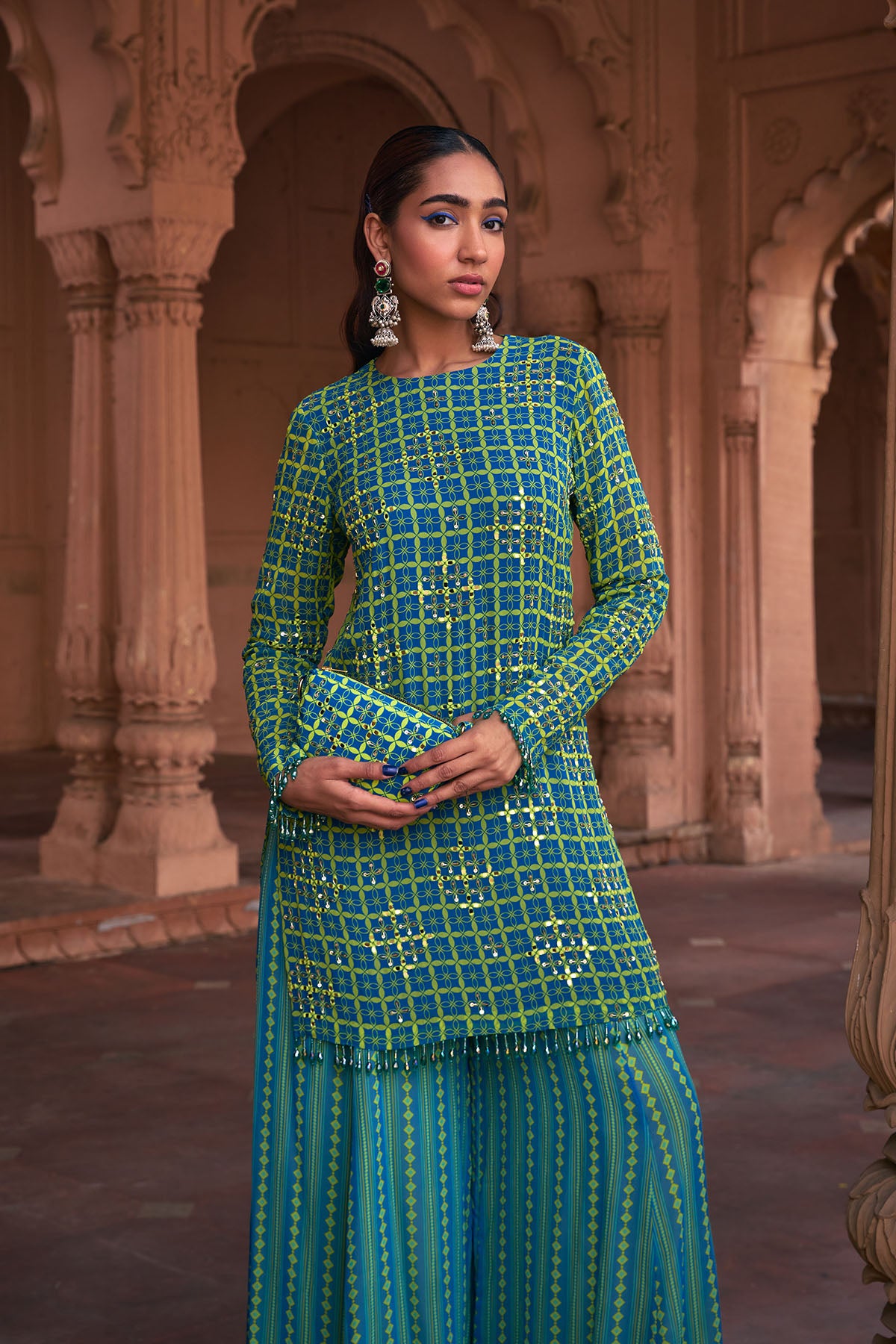 Lime yellow grid print & highlighted kurti with bell bottom pants & potali bag