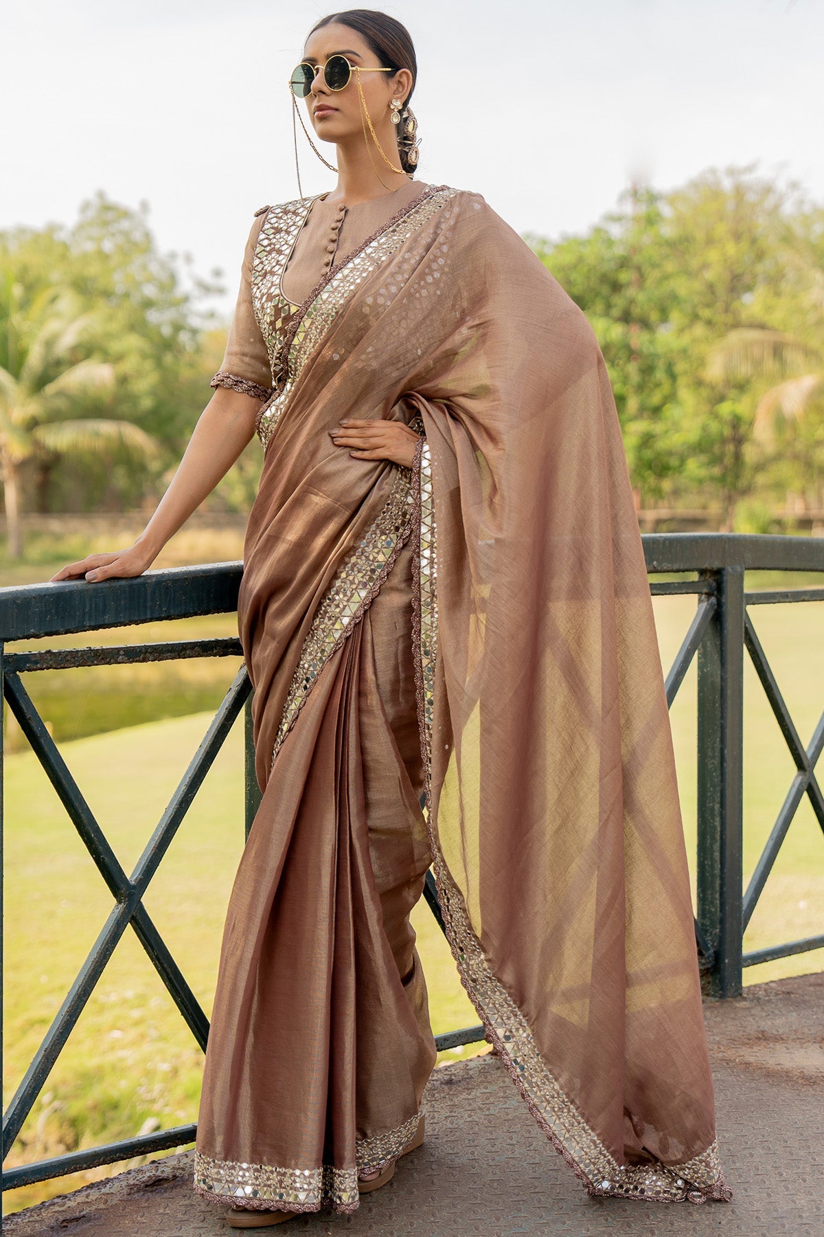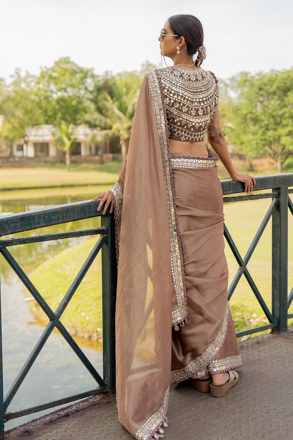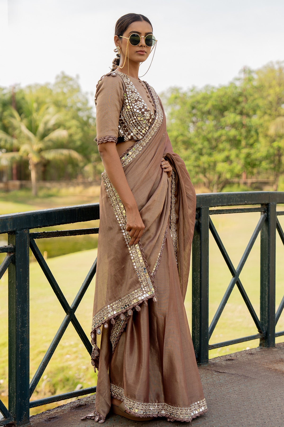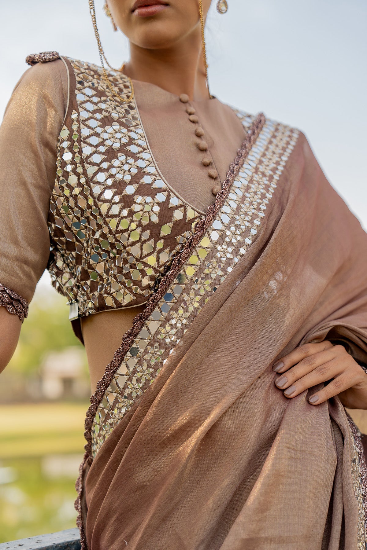 Mirror-bordered saree with a blouse adorned with potli buttons and a mirror cropped jacket.