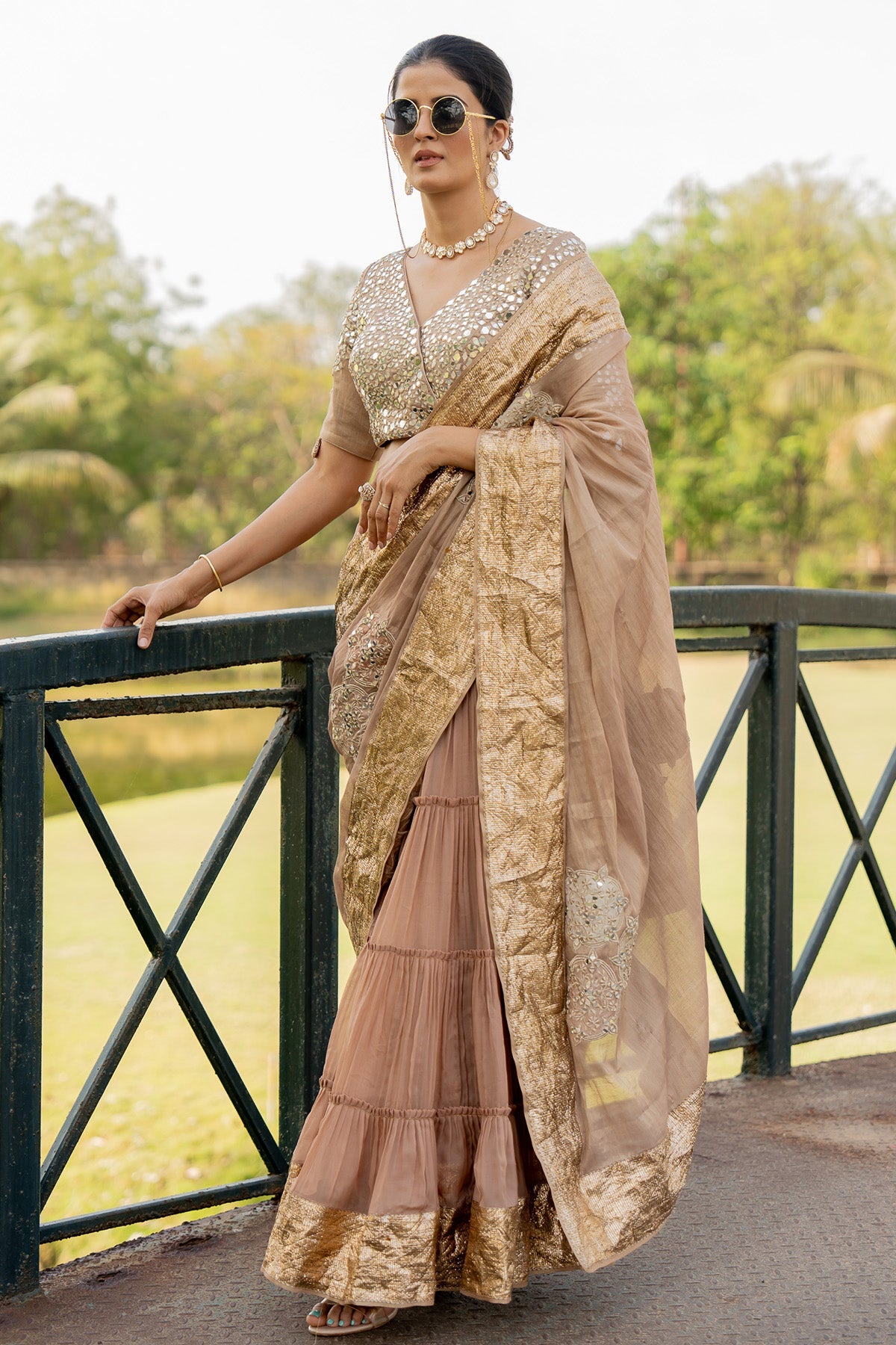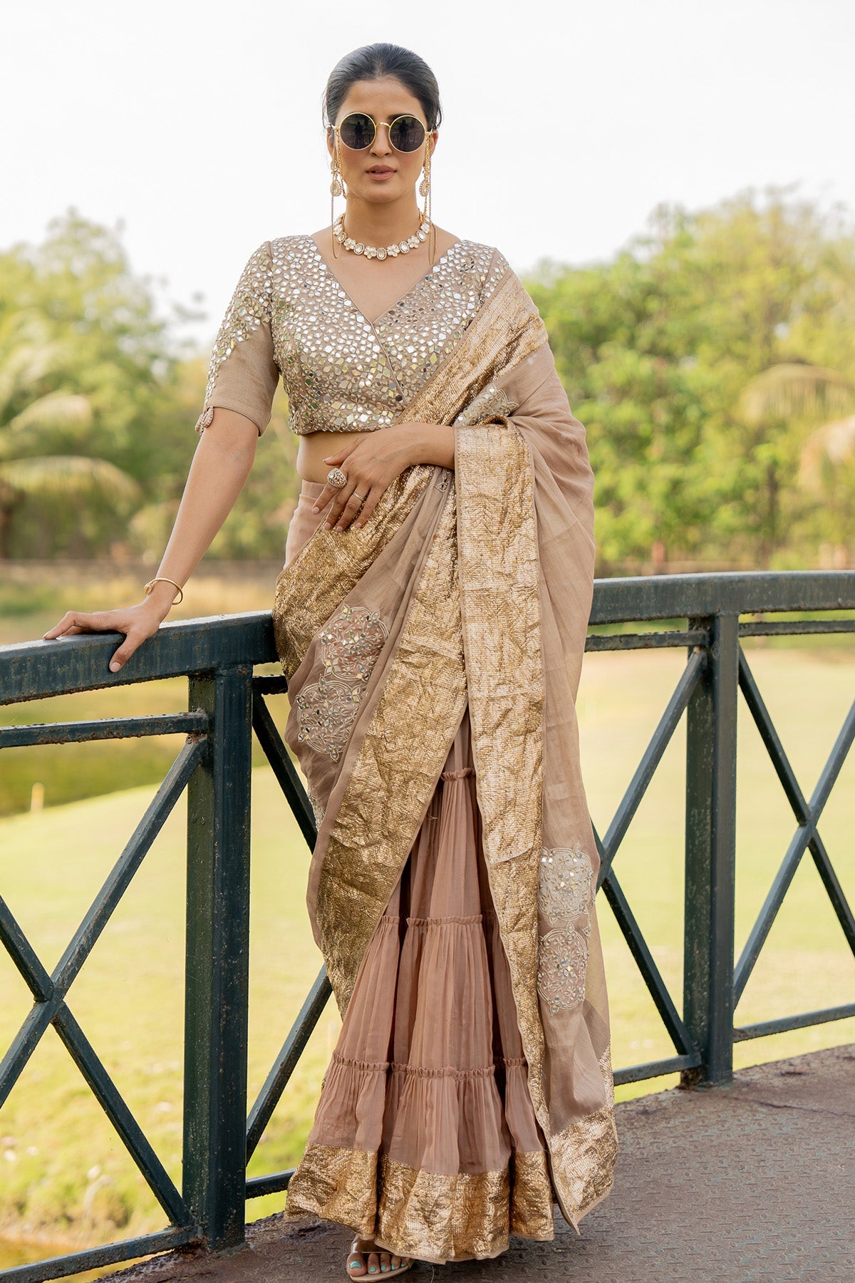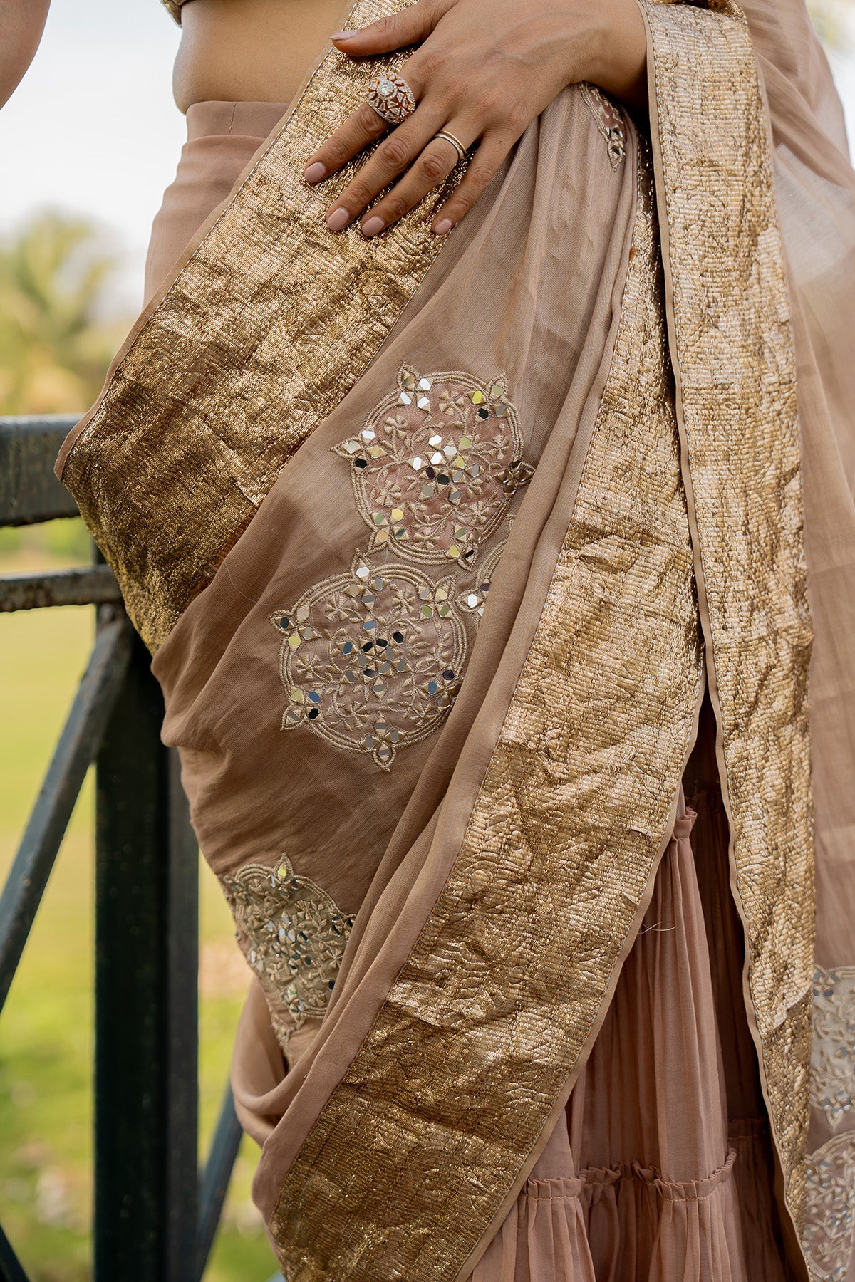 A traditional lampi lace and embroidery patches in various colored tissue all over the saree, with a crisscross front and a tie-up back blouse with mirror embroidery all over.