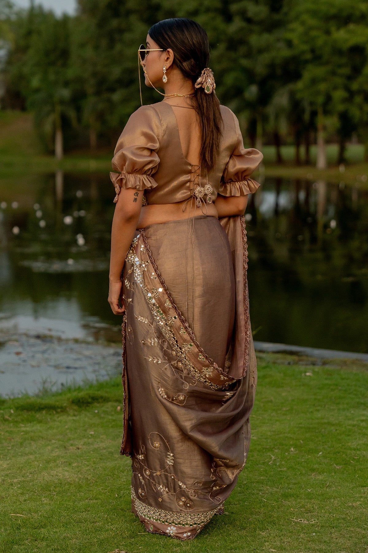 A thick border and abstract hand-embroidered saree complement the puff-sleeved blouse with mirror embroidery.
