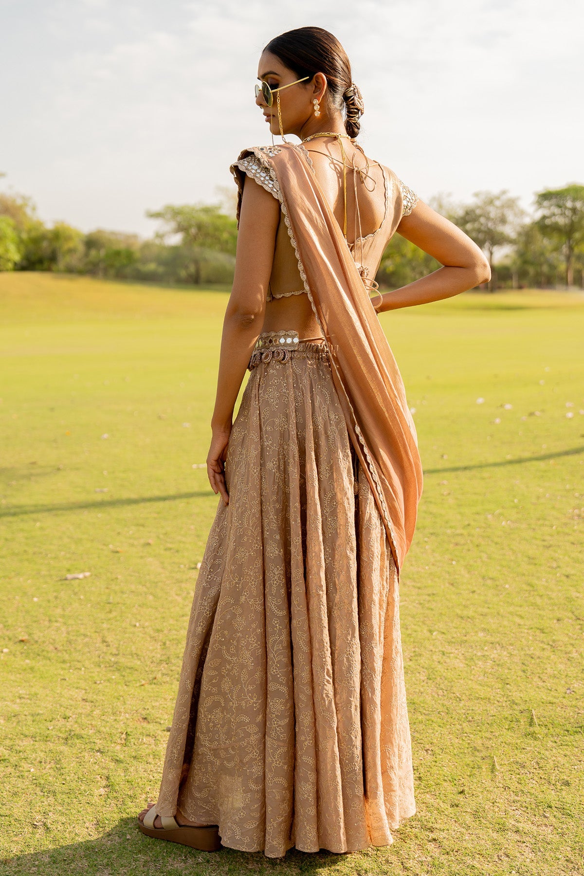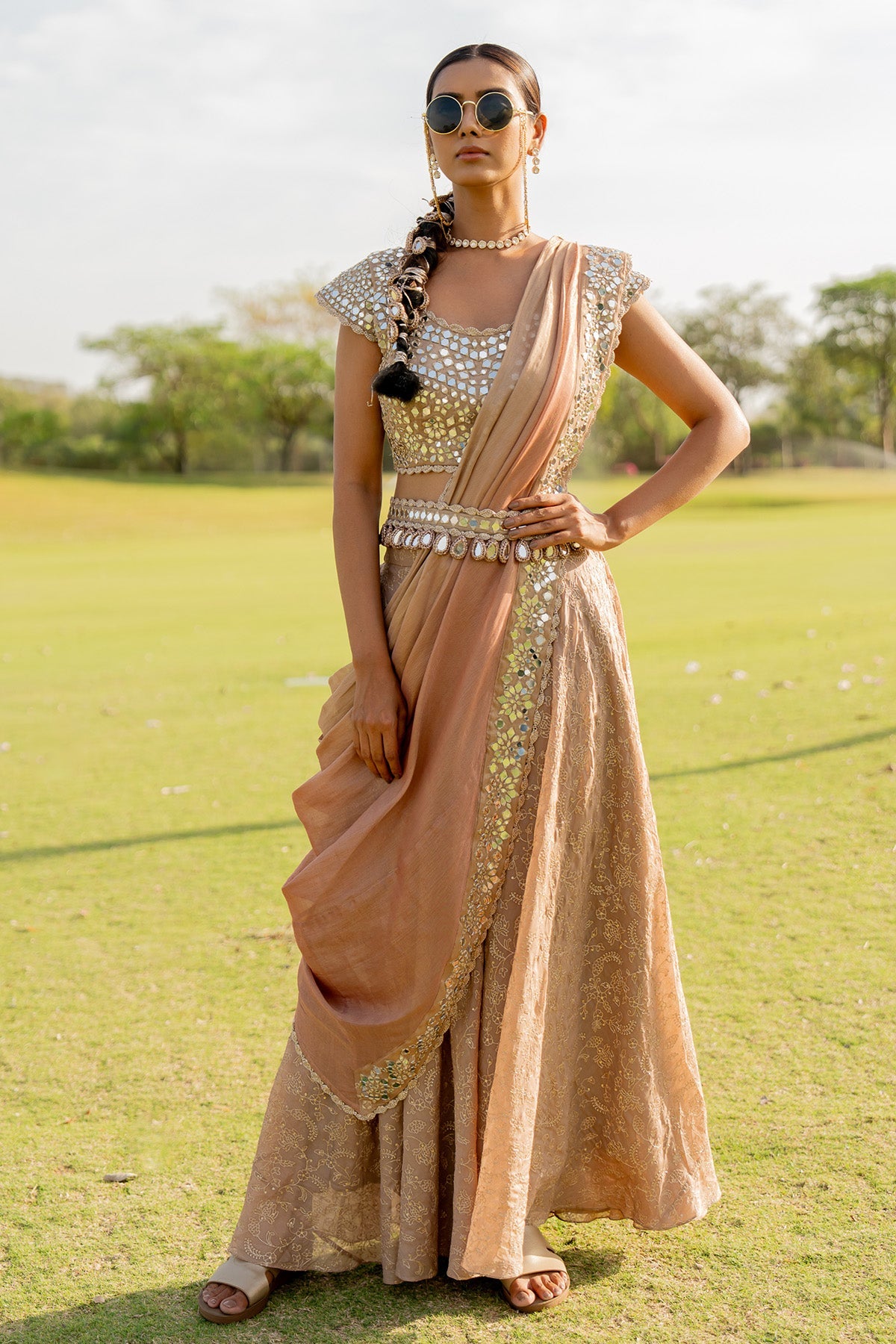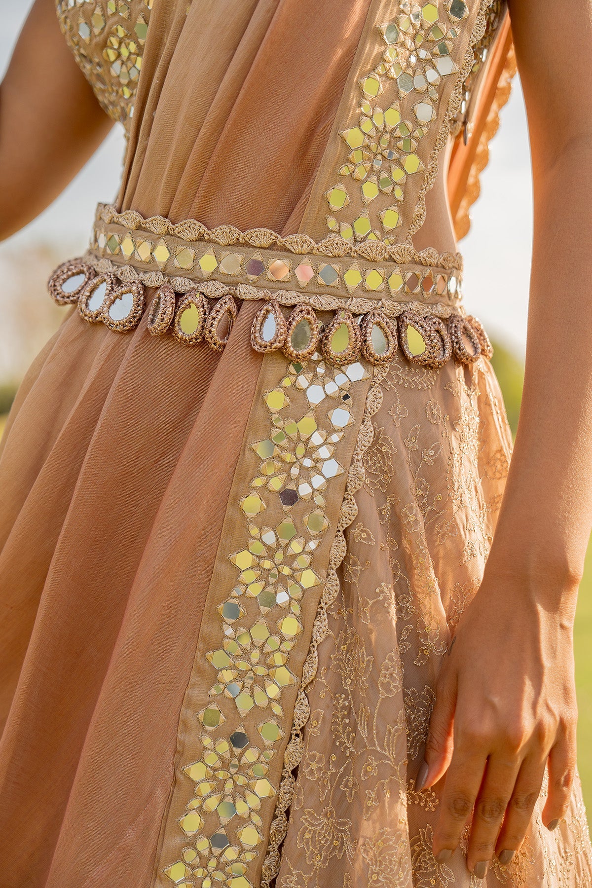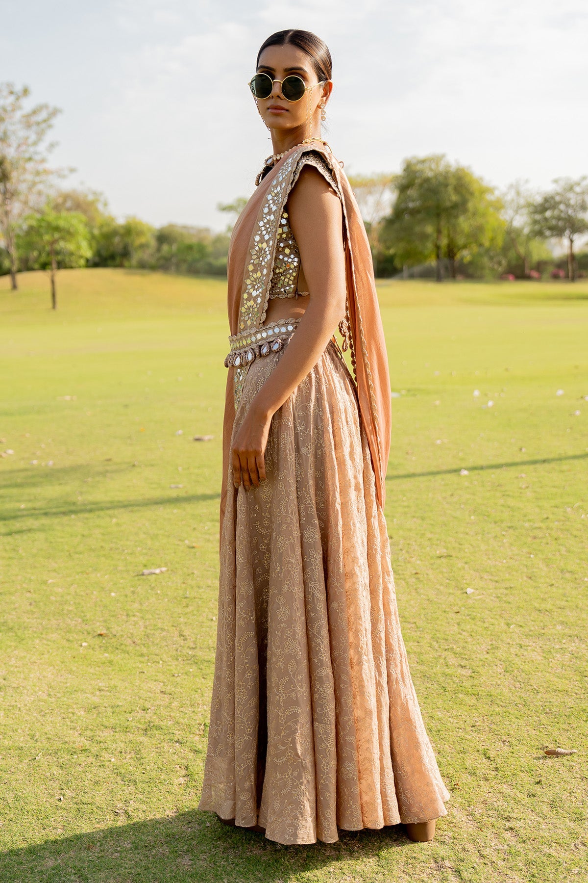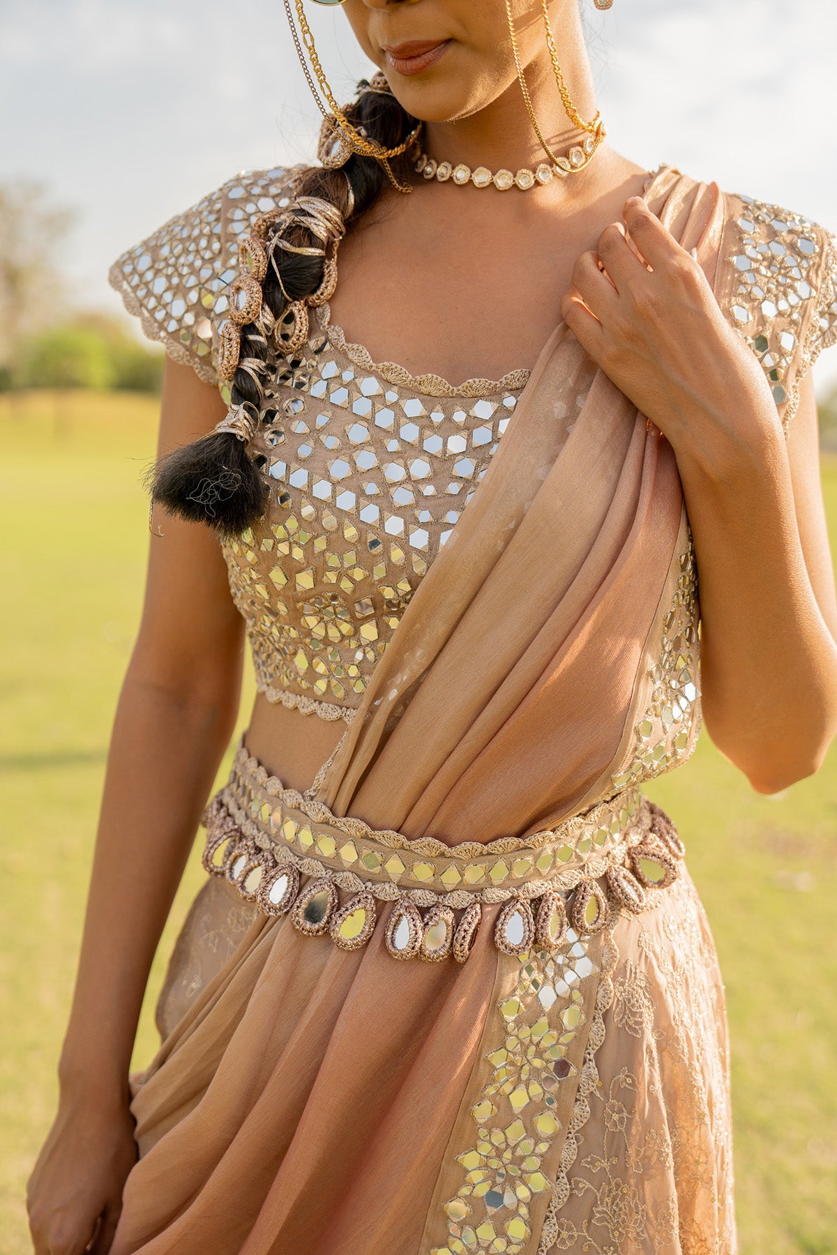 Jaal organza sharara with an embroidered border drape, a mirror belt, and a heavy mirror blouse to finish the ensemble