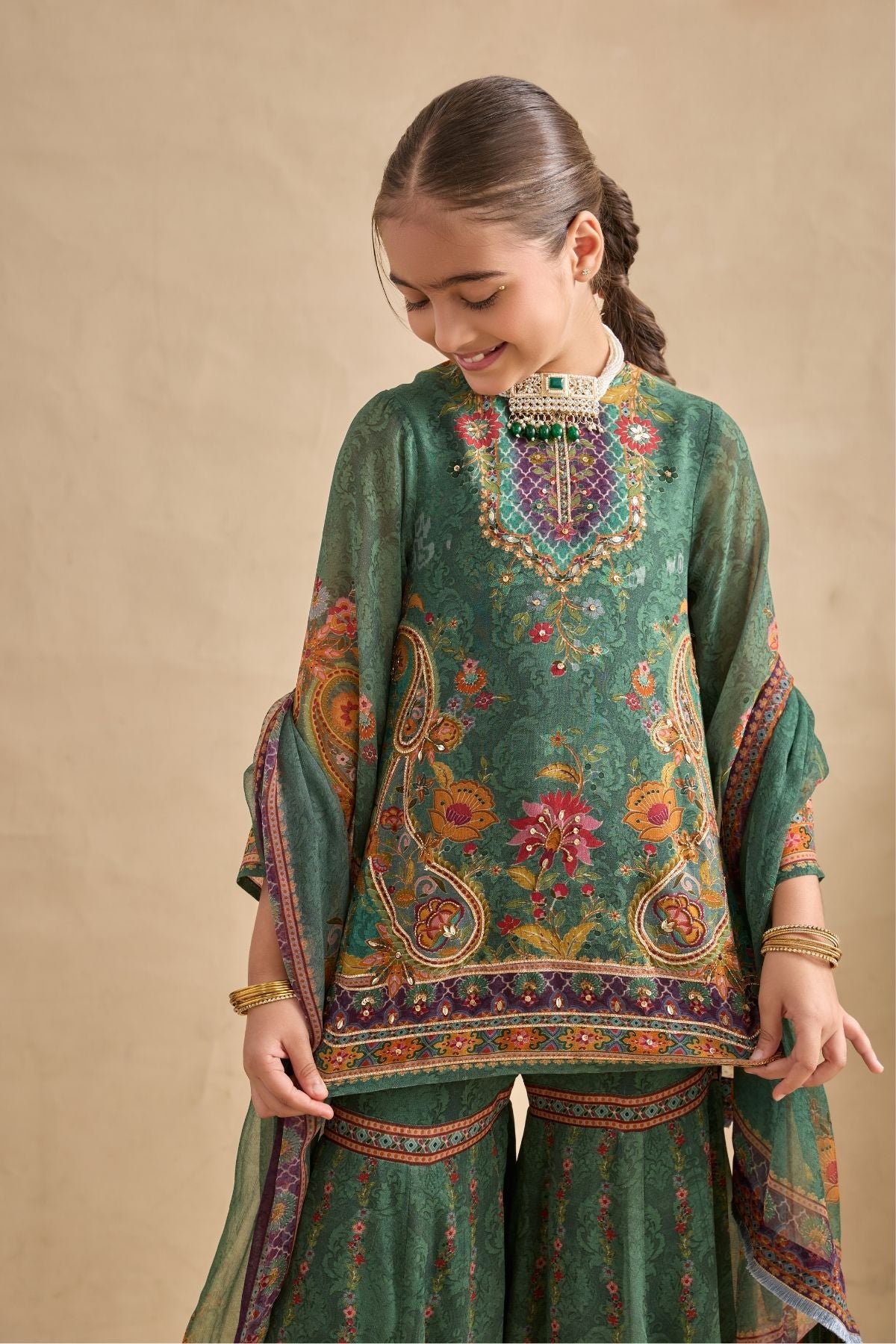 Featuring a short kurta and voluminous sharara paired with an easy, flowy dupatta in floral detailing.Kurta comes with bell sleeves detailing. Perfect for festive fuss free look with an intricate workmanship of katdana and sequine embroidery on it .Perfect for your little to stand out at any occassion.