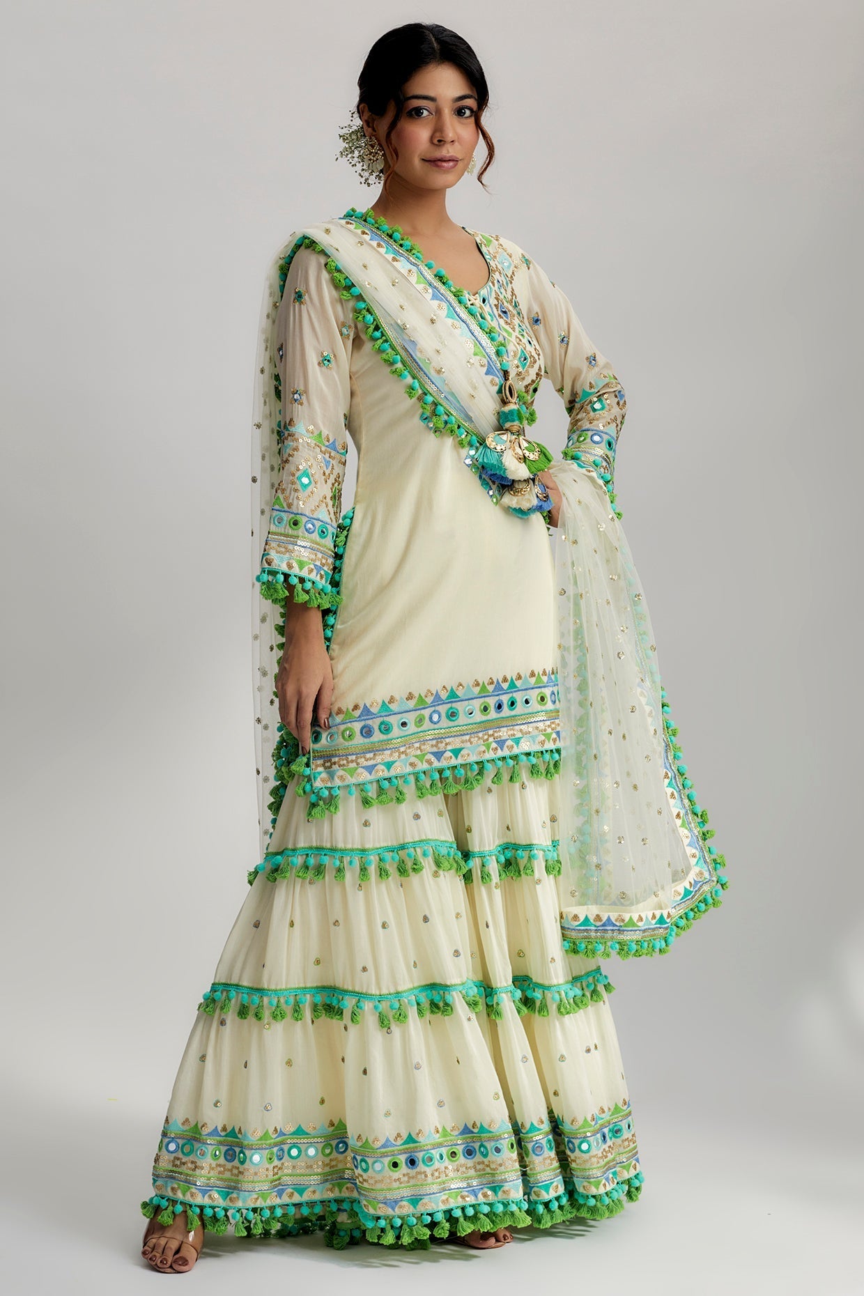 The Fabric Itself Is Lightweight And Drapes Beautifully, Allowing For Graceful Movements And A Flattering Silhouette. It Is Also Comfortable To Wear, Ensuring That You Can Enjoy Your Festivities Without Any Discomfort. The Combination Of The Fabric's Quality, The Mirror Work, Pompoms, Tassels, And Embroidery Makes The Mahika Layered Sharara Set A True Work Of Art, Showcasing The Rich Craftsmanship And Timeless Elegance.