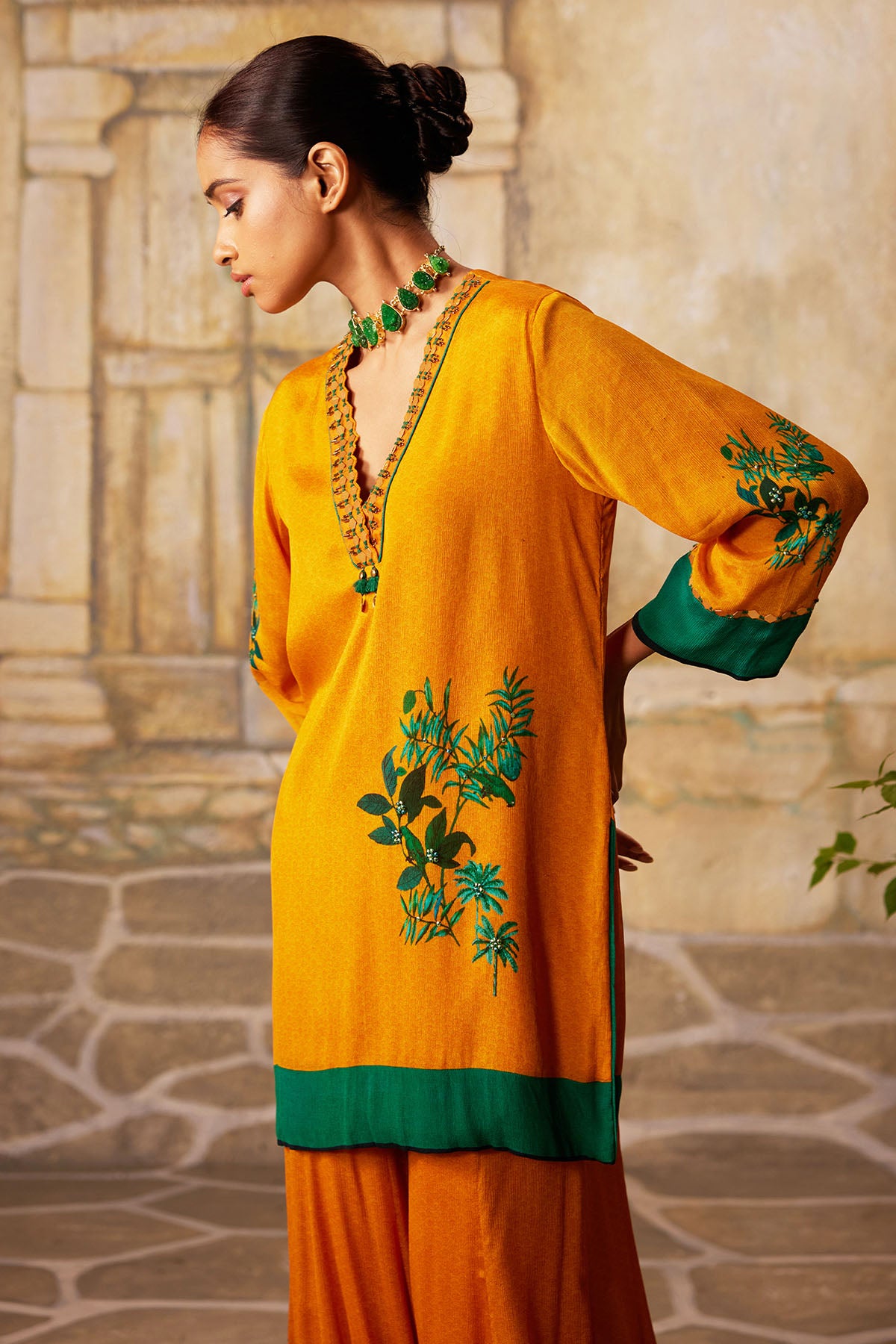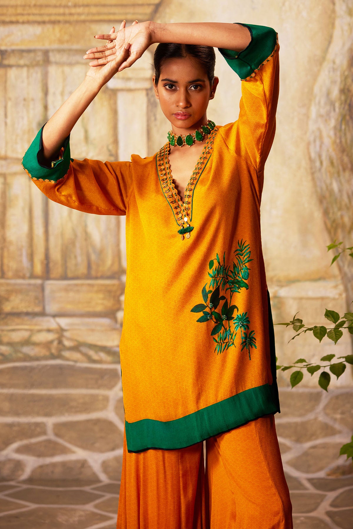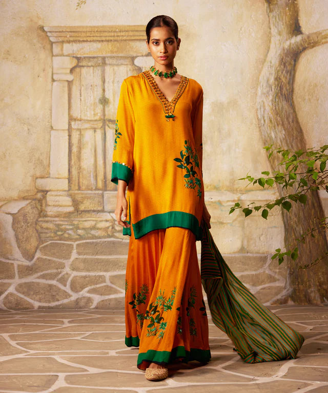 Rewamp Your Look with Mango Sharara Set, Adorned with An Embroidered Neckline and Different Concept Green Stripe Chiffon Dupatta for A Chic Update.