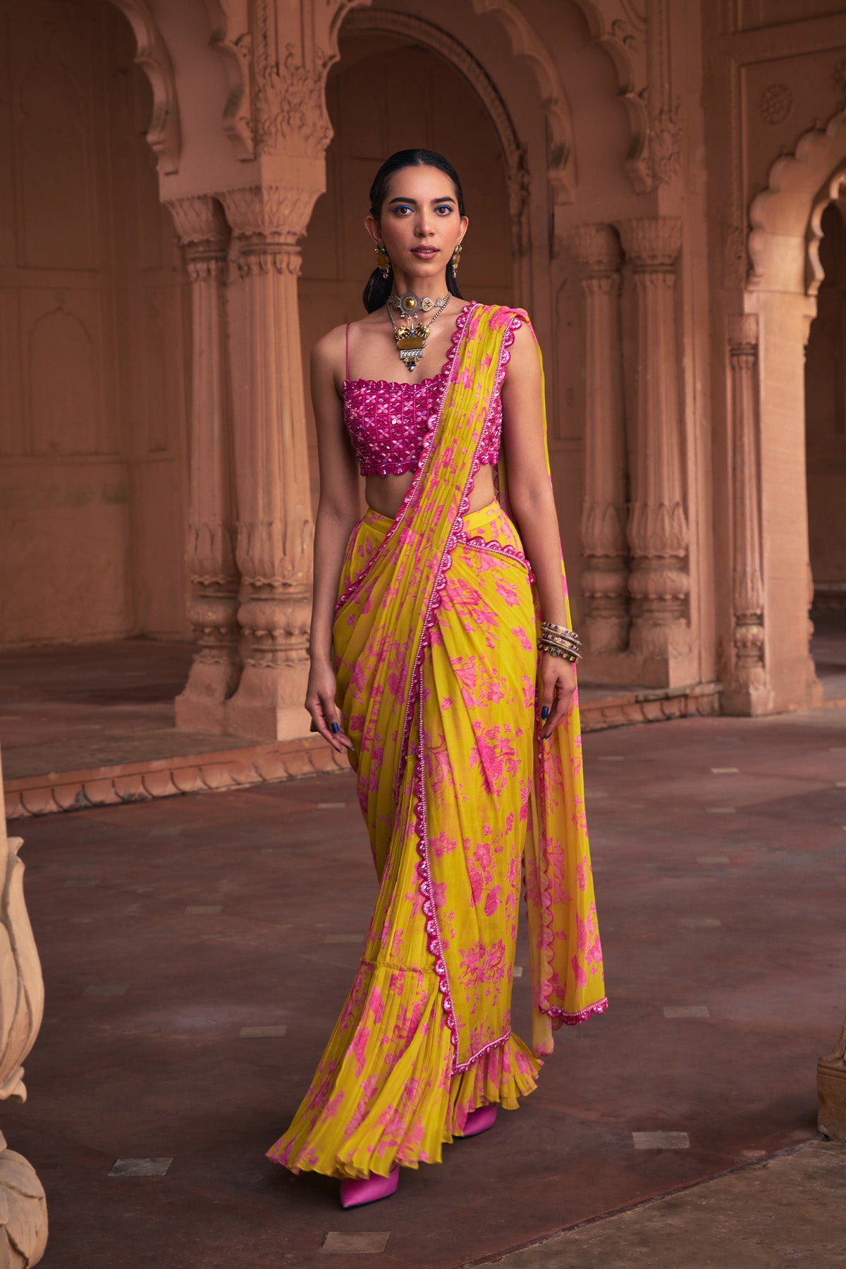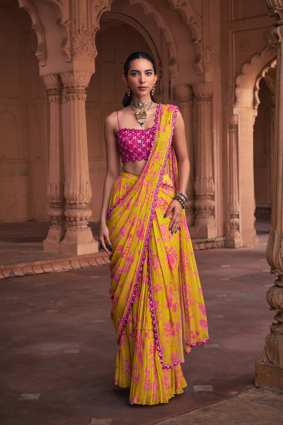 Fuschia grid embroidered blouse with mango yellow floral print & boder embroidered skirt saree