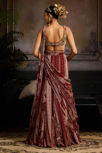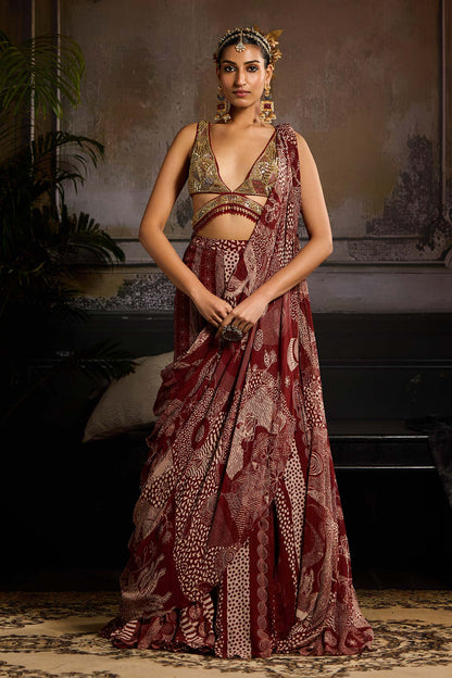 Maroon with Gold Abstract Embroidered Blouse with Maroon Abstract Jaal Printed Mermaid Skirt Saree