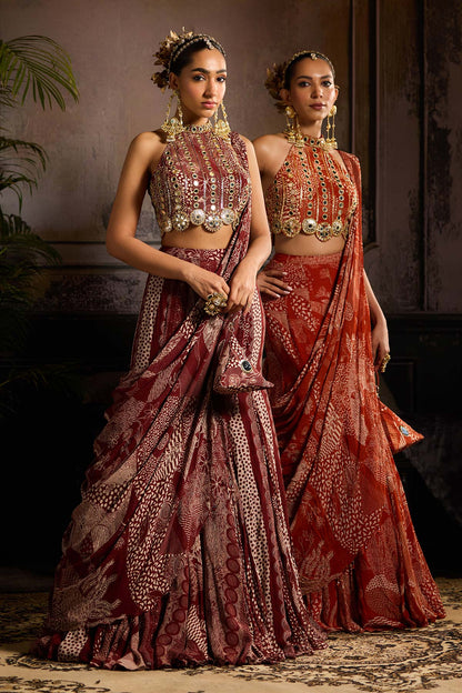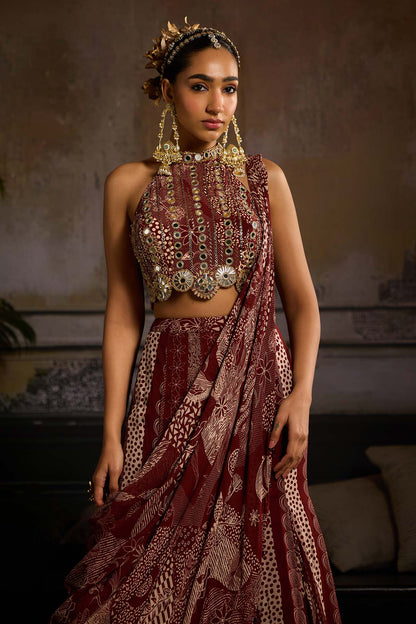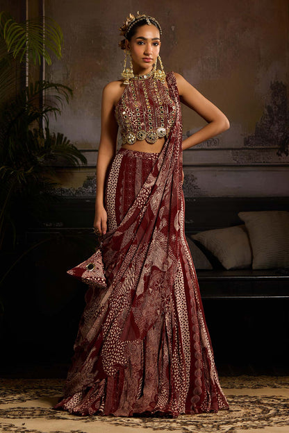 Maroon Abstract Jaal Print and Highlighted Blouse with Maroon Abstract Jaal Printed Mermaid Skirt Saree with Potli Bag