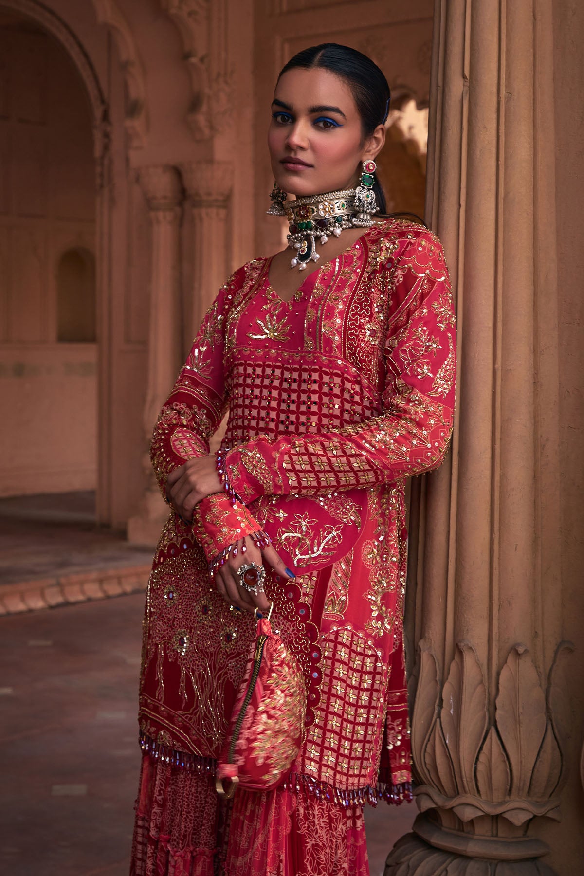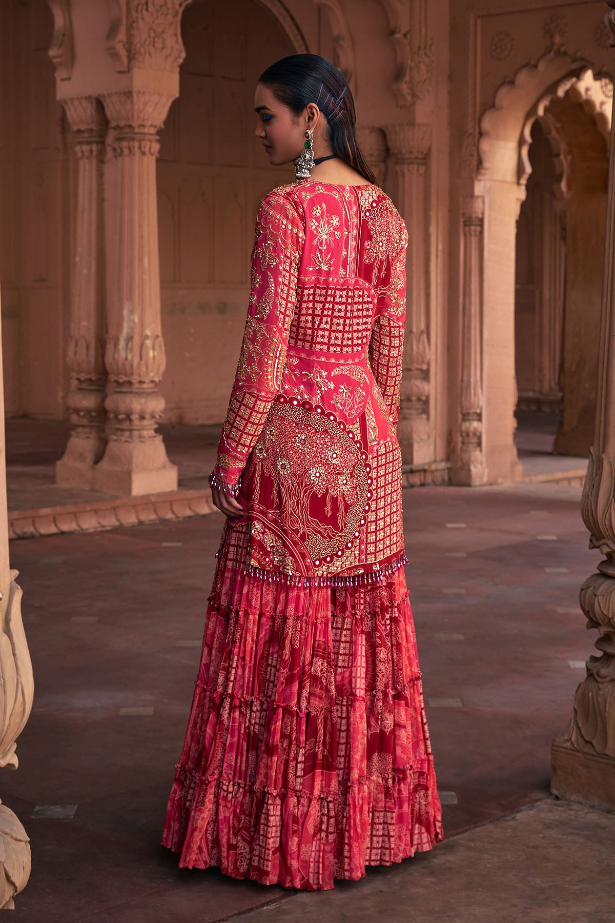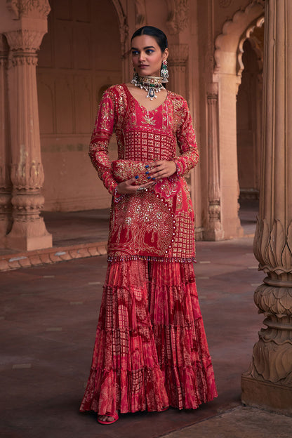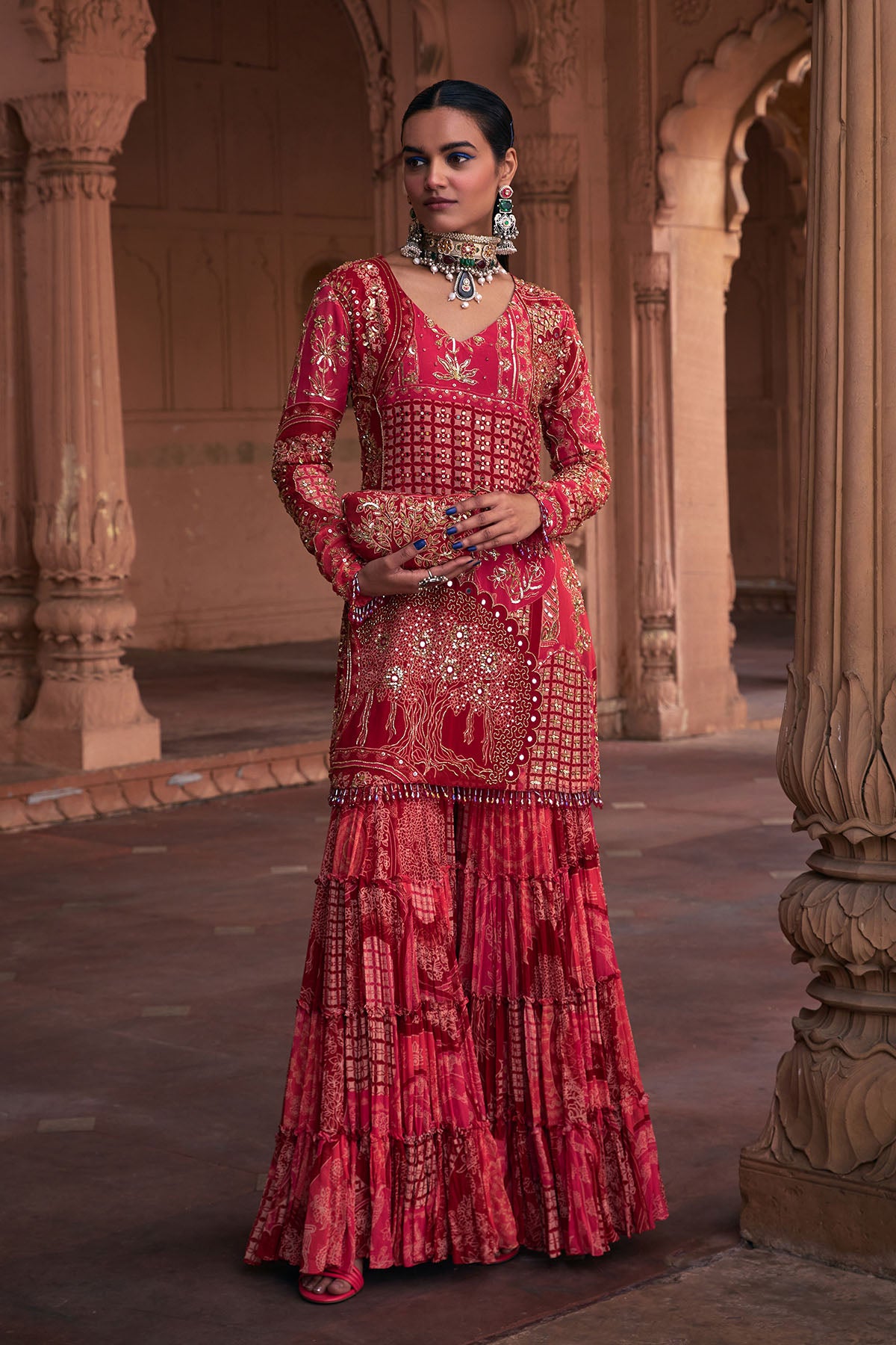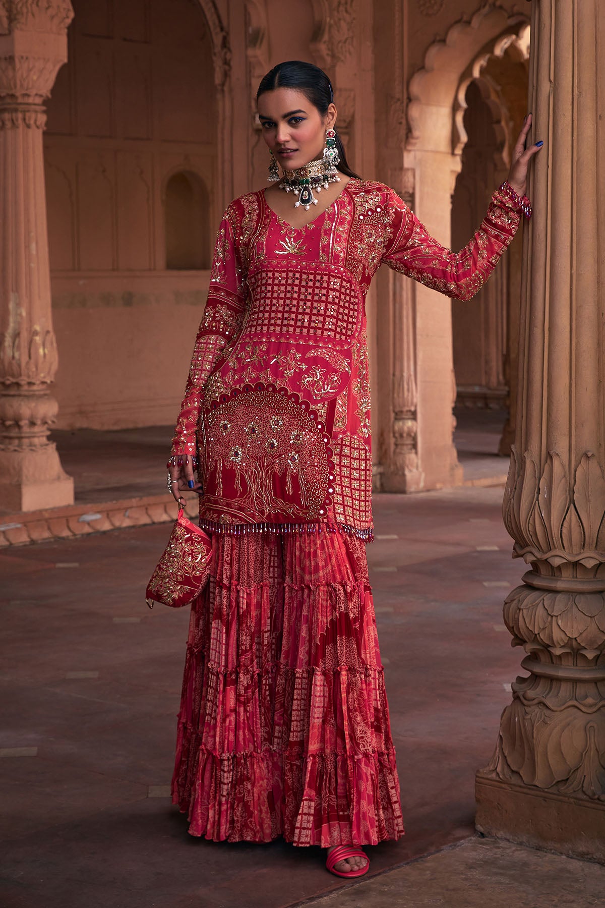 Maroon thikri print & highlighted kurti with tiered gharara pants and potali bag