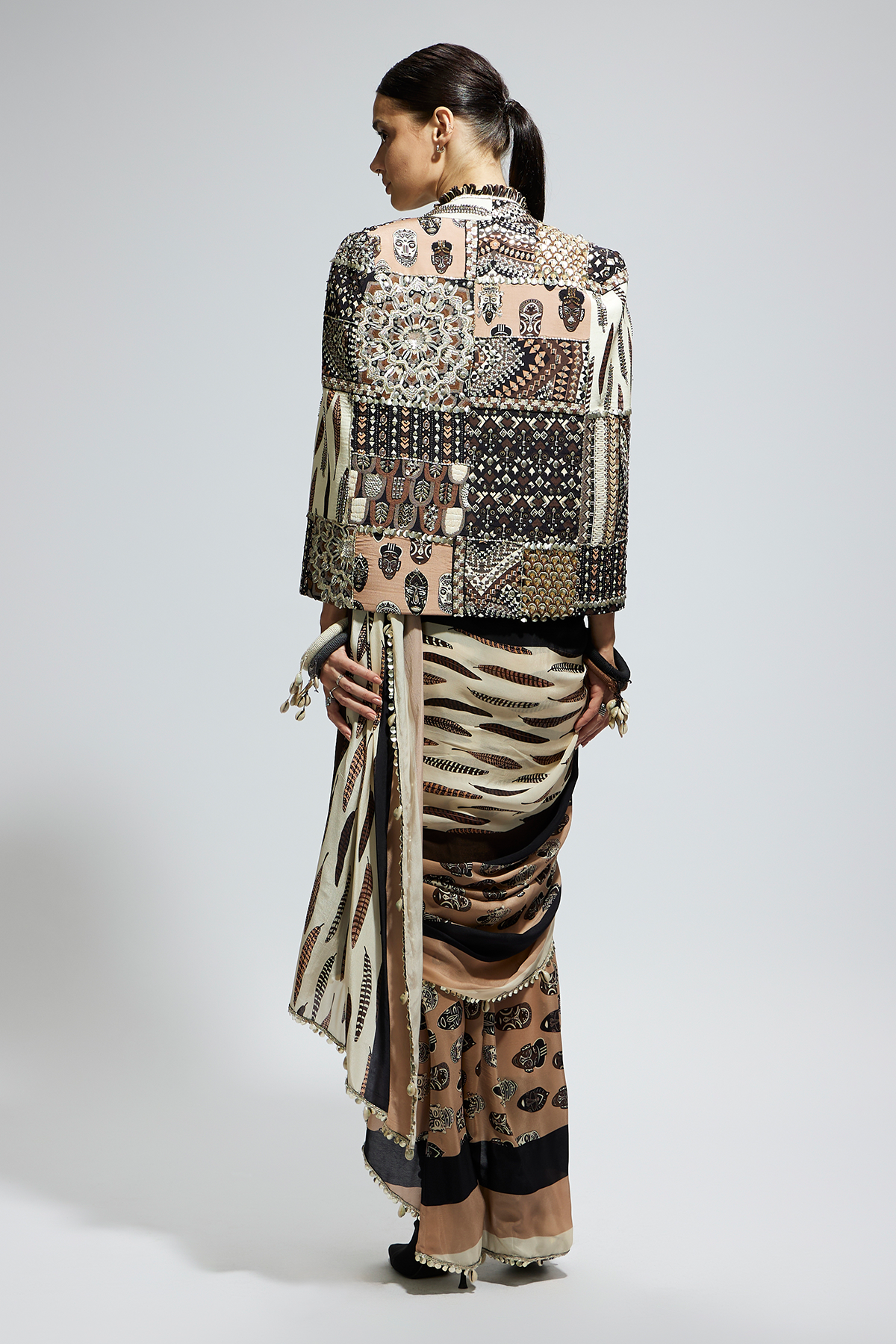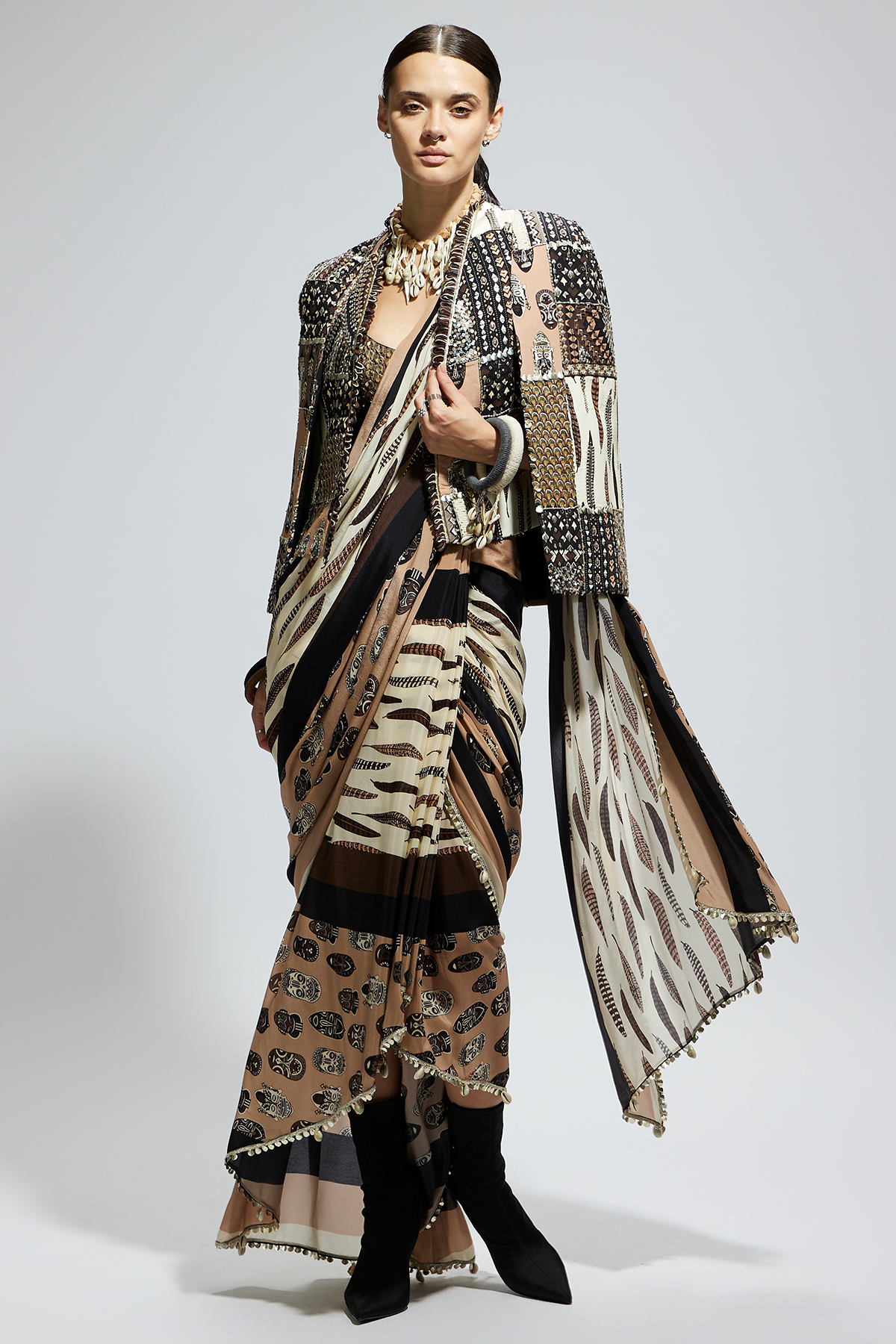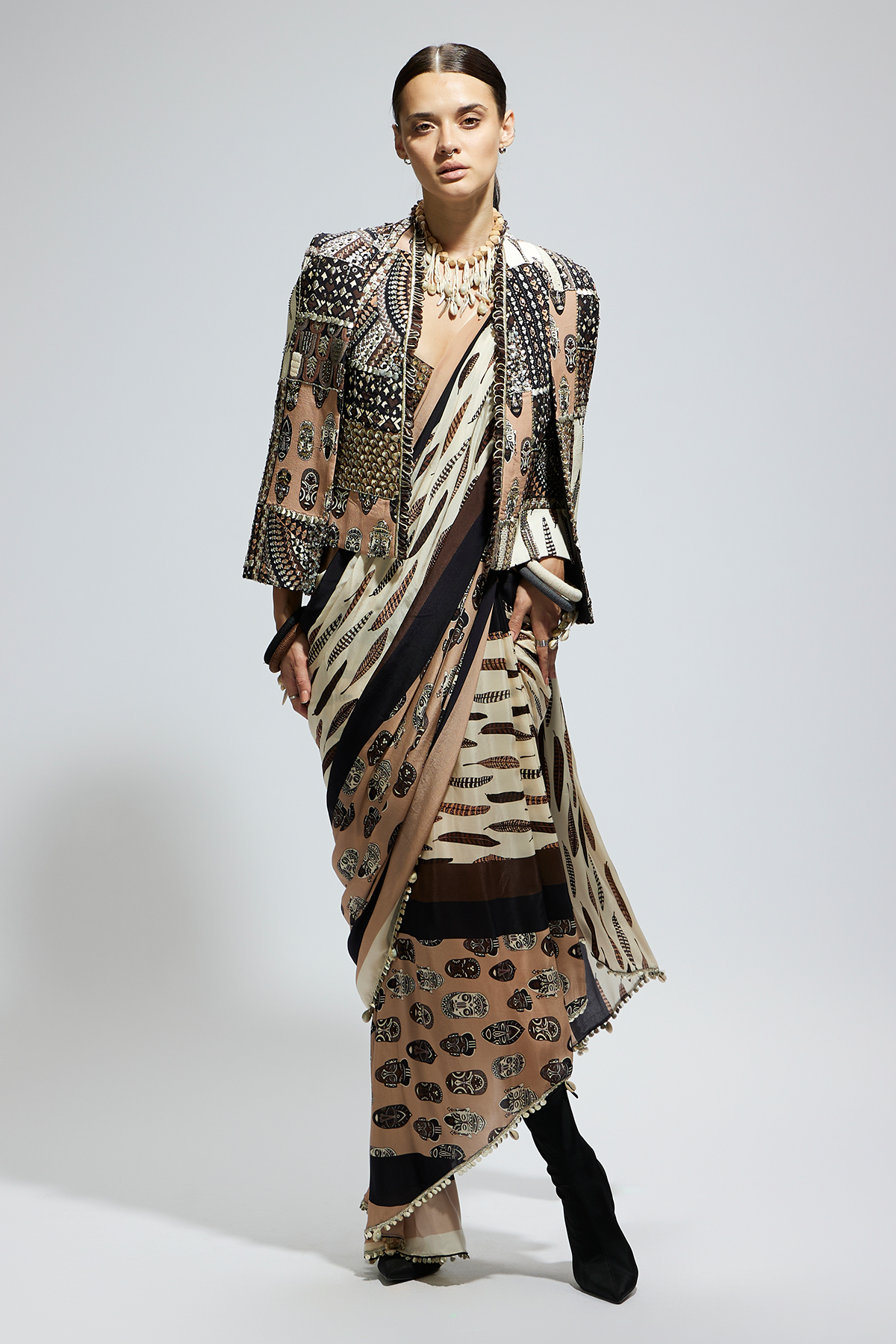 Mask and Feather Print Cascade Saree Paired with Metallic Scallop Bustier