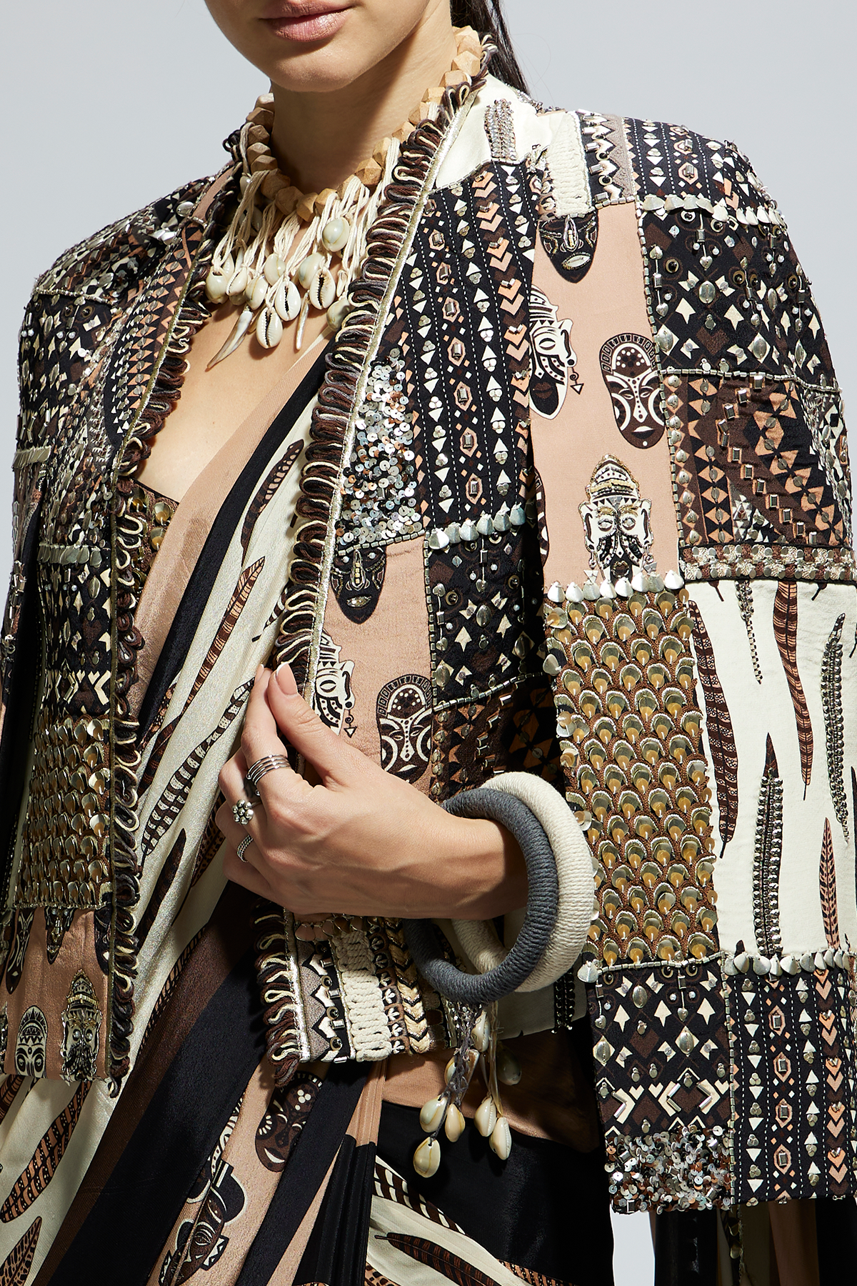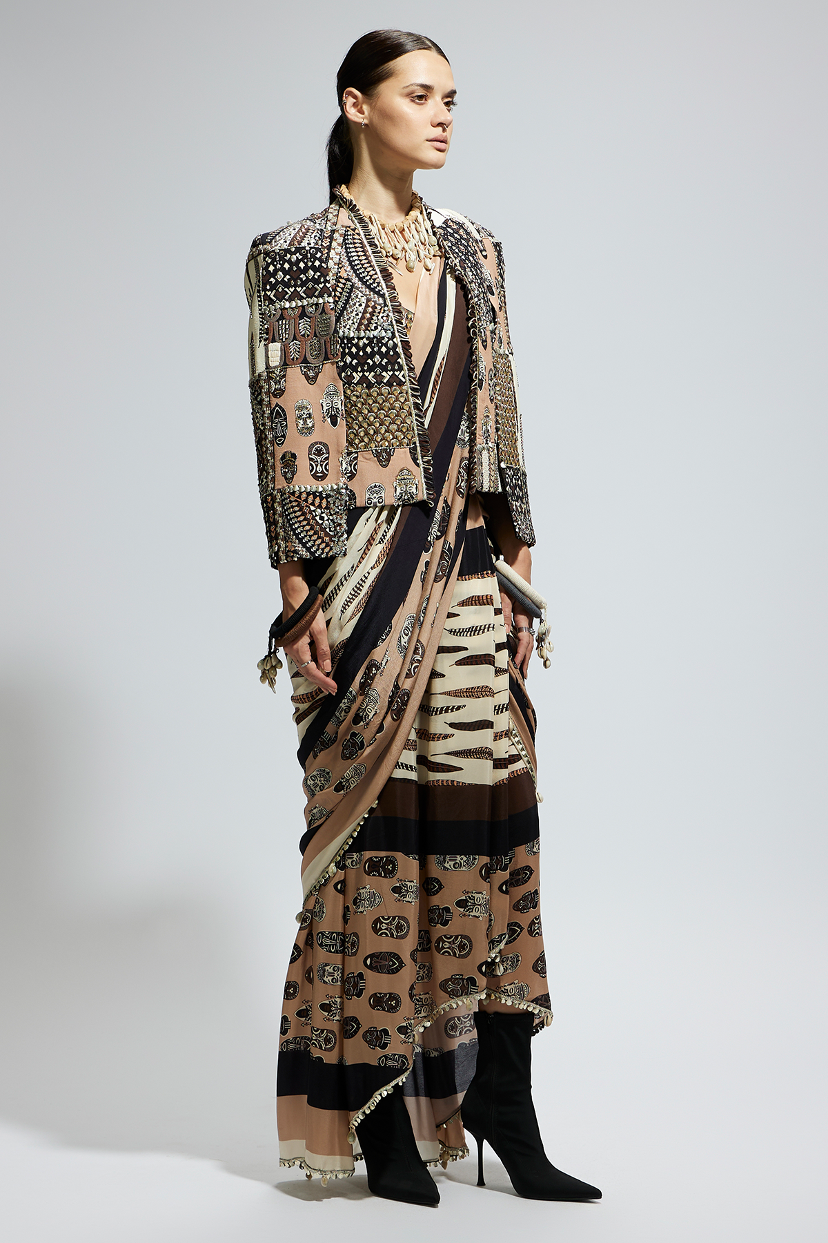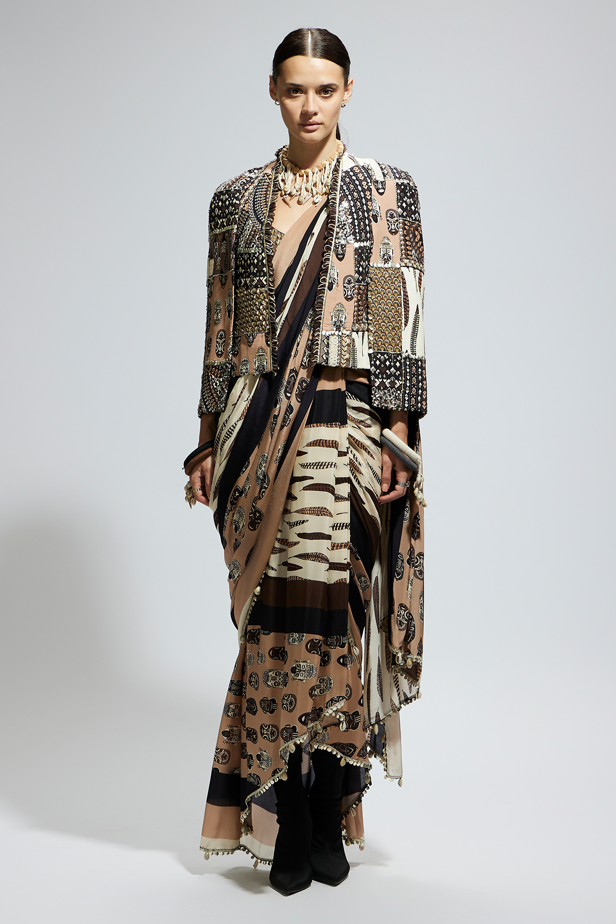 Mask and Feather Print Cascade Saree Paired with Metallic Scallop Bustier