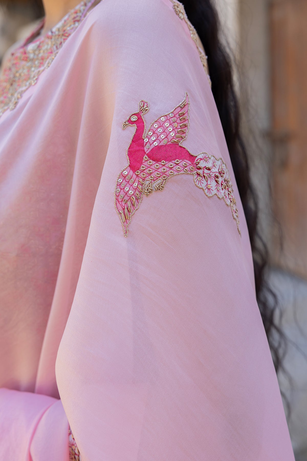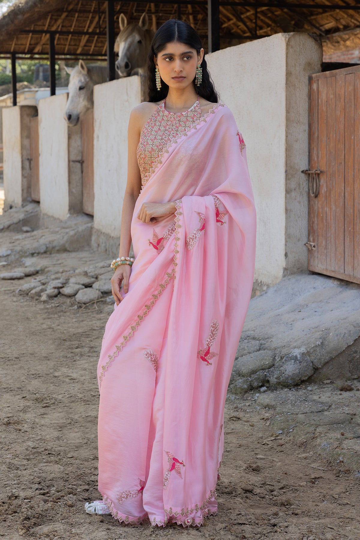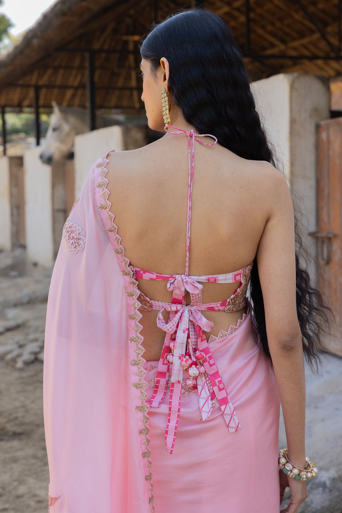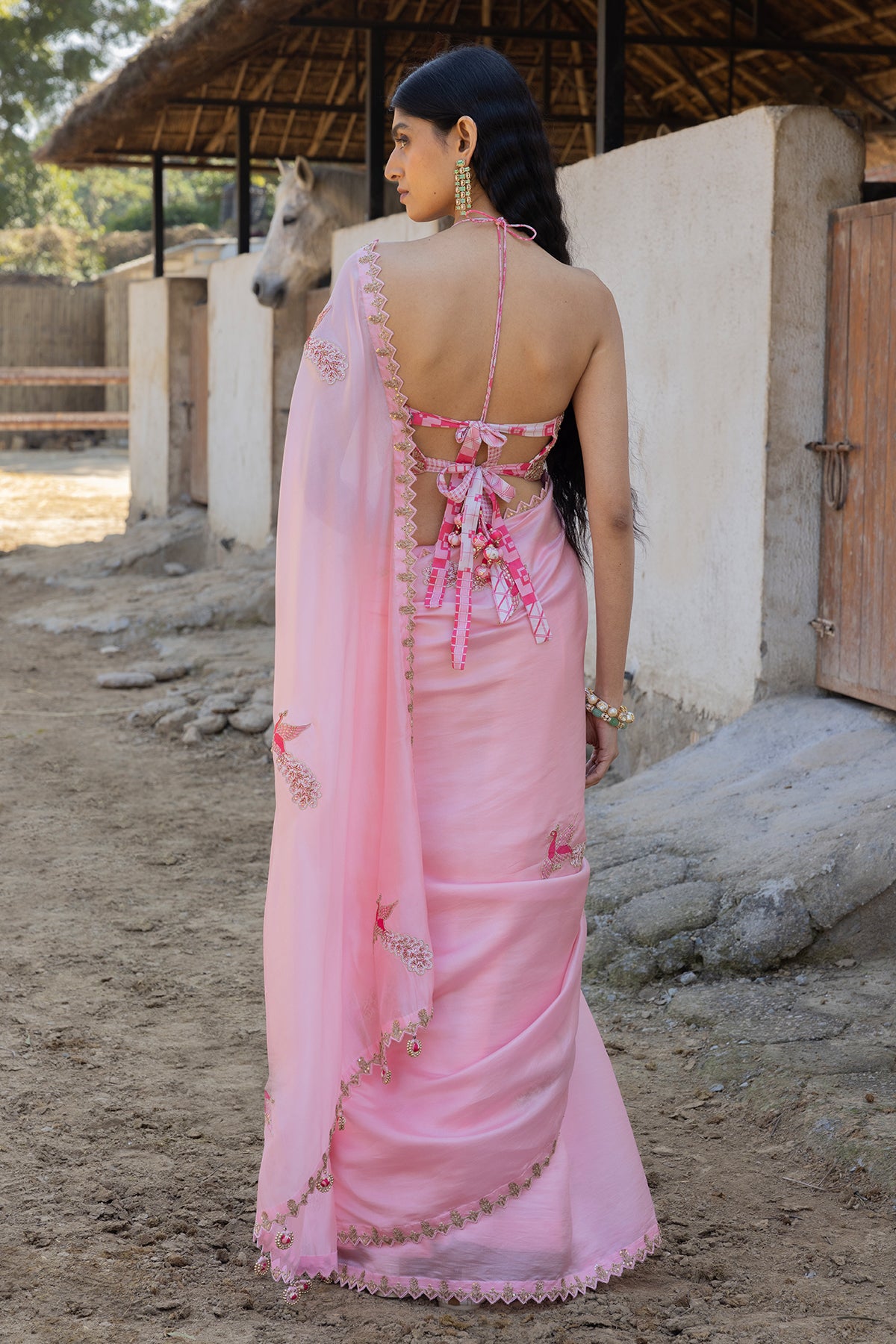 Masoom Gulaabi Saree Intricated With Hand Marodi Work And Patch Work Paired With Halter Blouse Fully Marodi Work