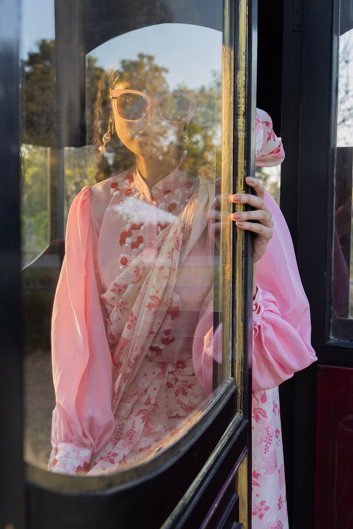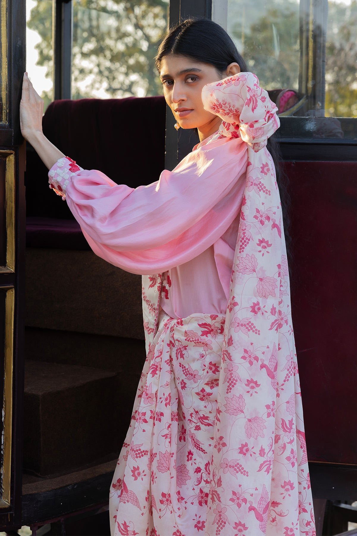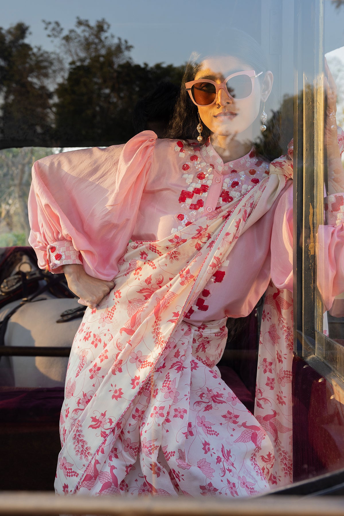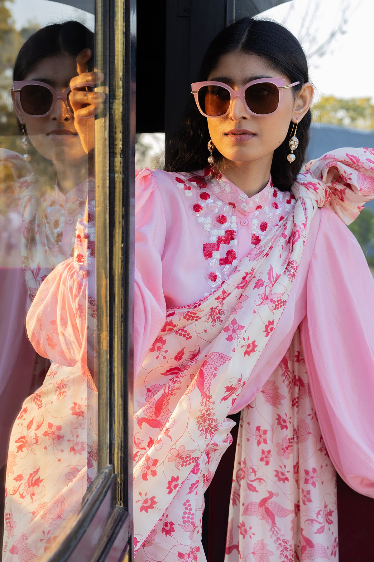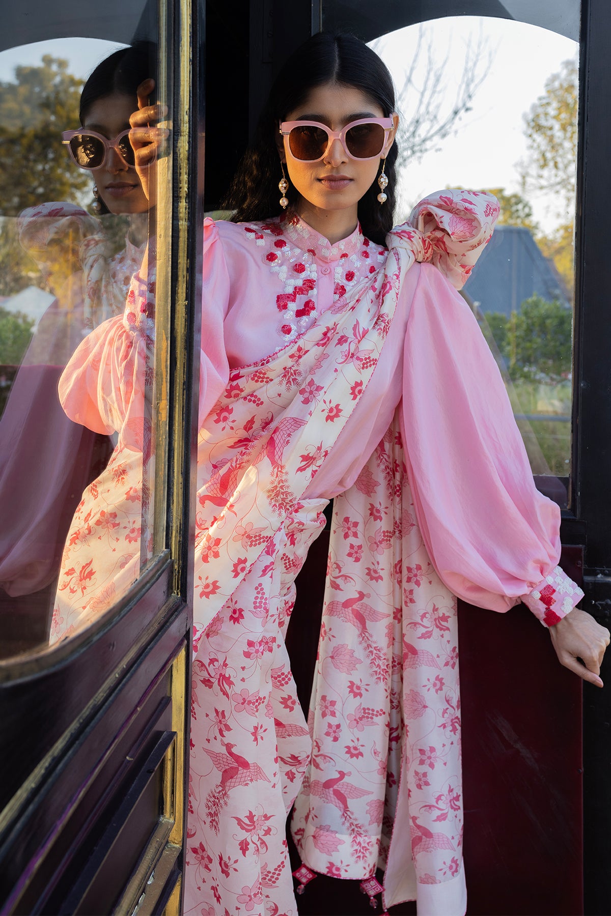 Masoom Gulabi Printed Organza Saree With Shirt Intricated With Moonga Coloured Hand Sequence Work