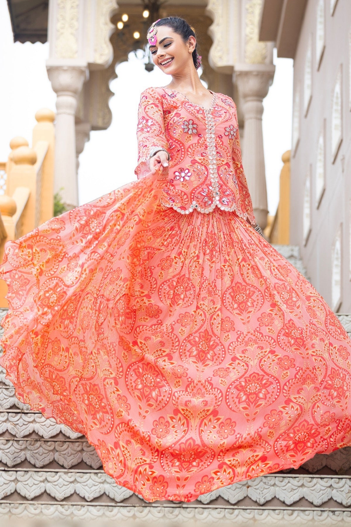 Description: A celebration of sunshine, laughter, and bridal warmth—this haldi yellow short jacket and skirt set from Sajeda Lehry’s RAANGBAAZ bridal collection is a tribute to joyful rituals and hidden moments. Crafted in printed georgette , the full-sleeved jacket features scalloped edges and delicate hand-embroidered mirror work that catches light with every movement—just like the sparkle in a bride’s eyes. The coordinated georgette skirt flows with grace, echoing the rhythm of pre-wedding revelry. Lightweight, joyful, and infused with tradition, this ensemble is perfect for haldi ceremonies, mehendi moments, or an intimate bridal celebration under the sun. Wrap yourself in the golden hue of memory—RAANGBAAZ is where tradition waltzes with whimsy, and every twirl tells a story.