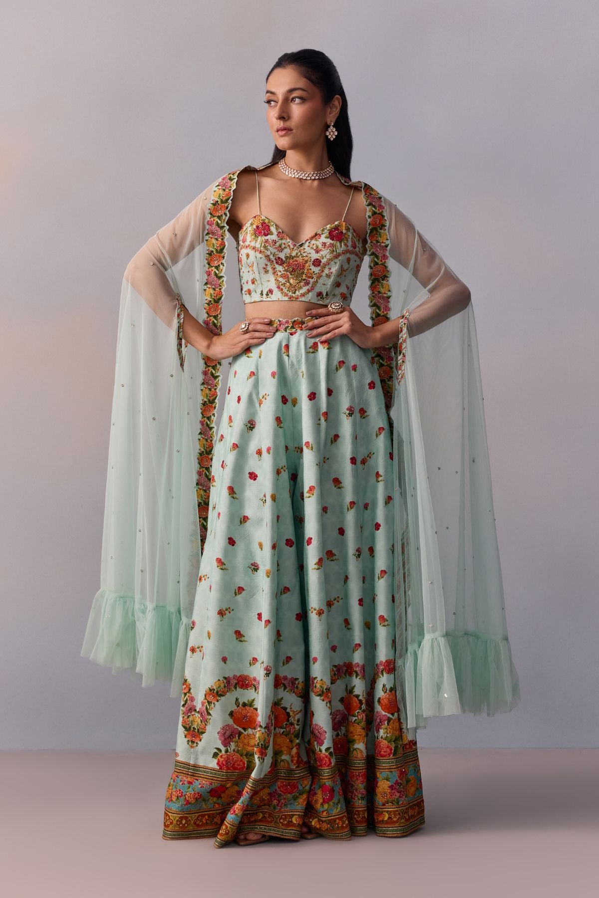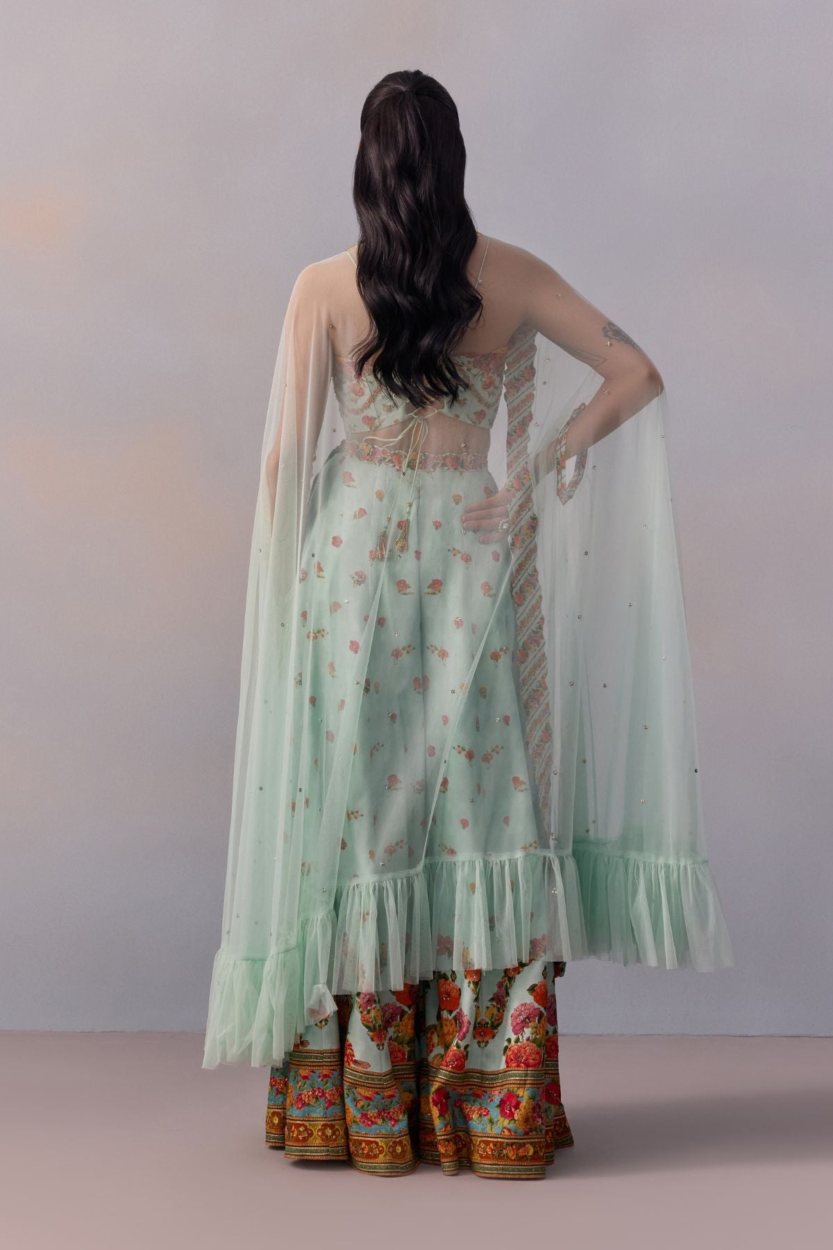 Featuring beautifuly crafted threadwork and hand embroidered corset with intricate sequins work. It Is styled with a flared Sharara and Cordinated net cape helps flaunt the stylised blouse back. Perfect outfit for wedding or glamorous party look.