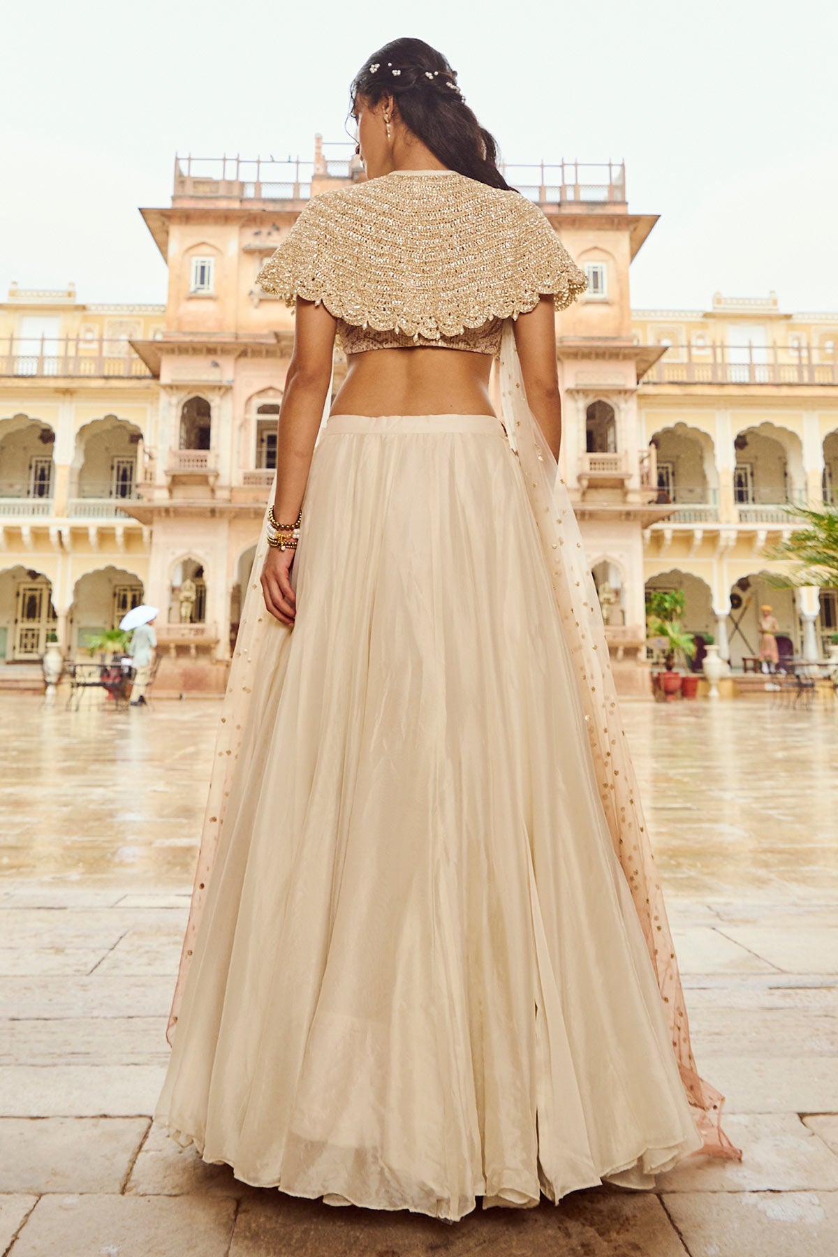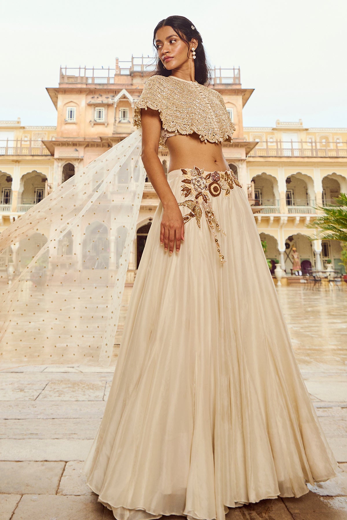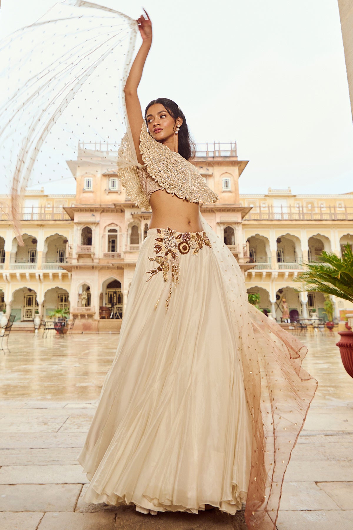 Fabric: Blouse- Printed sequin, net sequin Skirt- Viscose organza Mesh collar- Raw silk