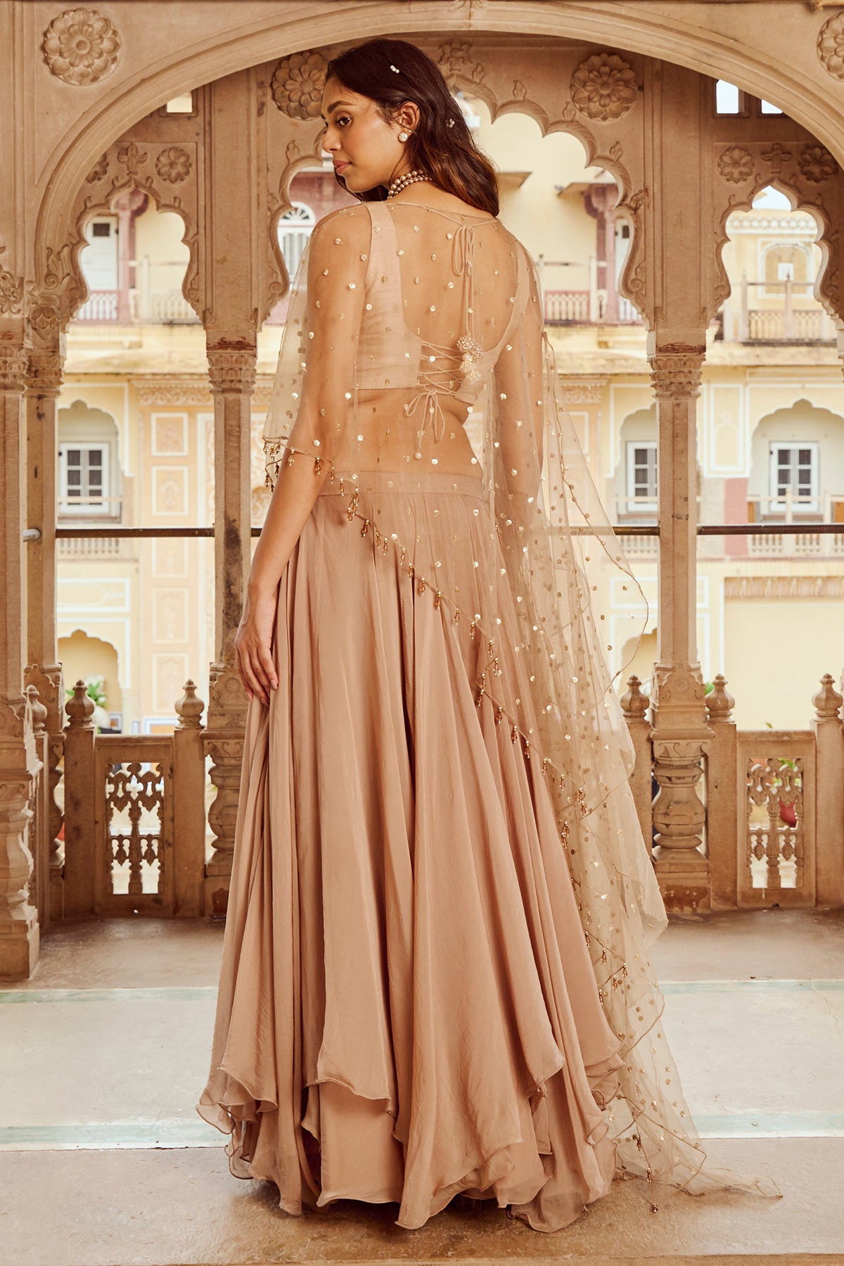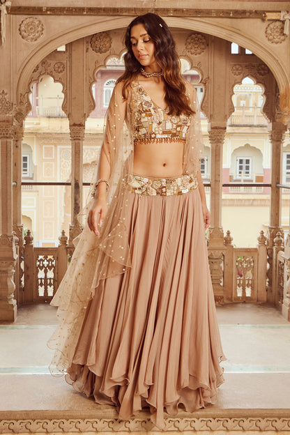 Fabric: Blouse- Raw silk Skirt- Viscose organza Dupatta- net sequin, net sequin(ruffles)