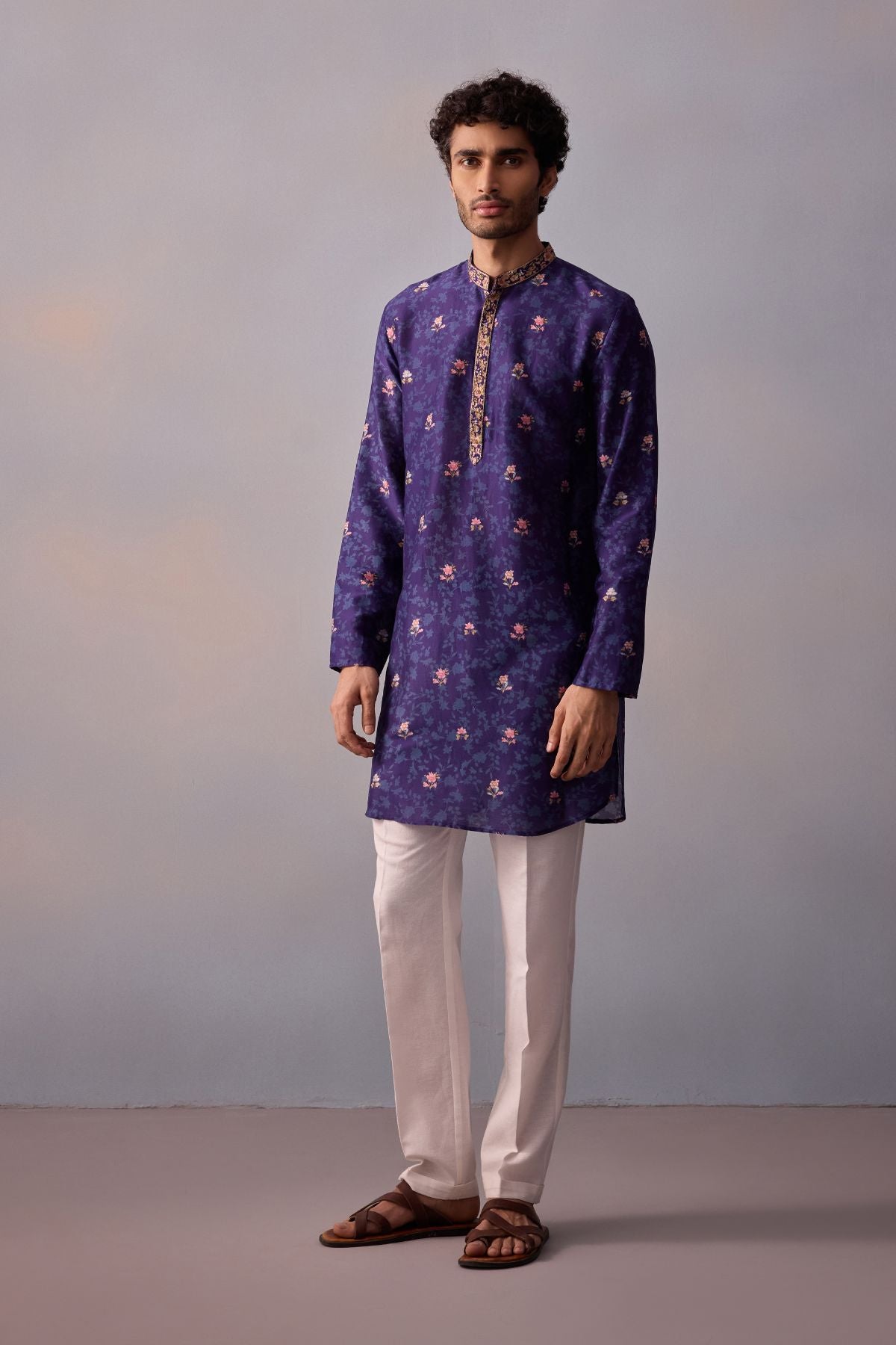 Featuring Mihir Kurta Set with Multi colour floral motifs and embroidered neckline placket. Designed to keep you dapper and suave at occasions and festivities.