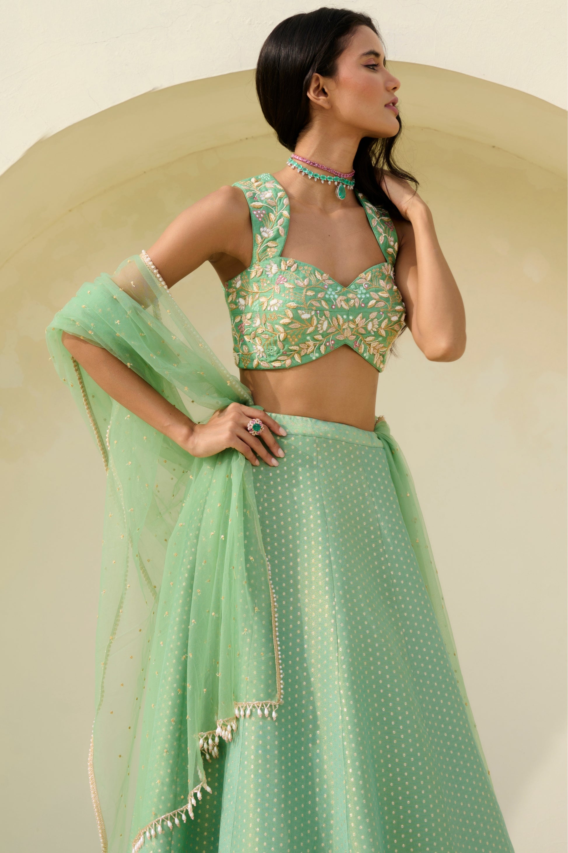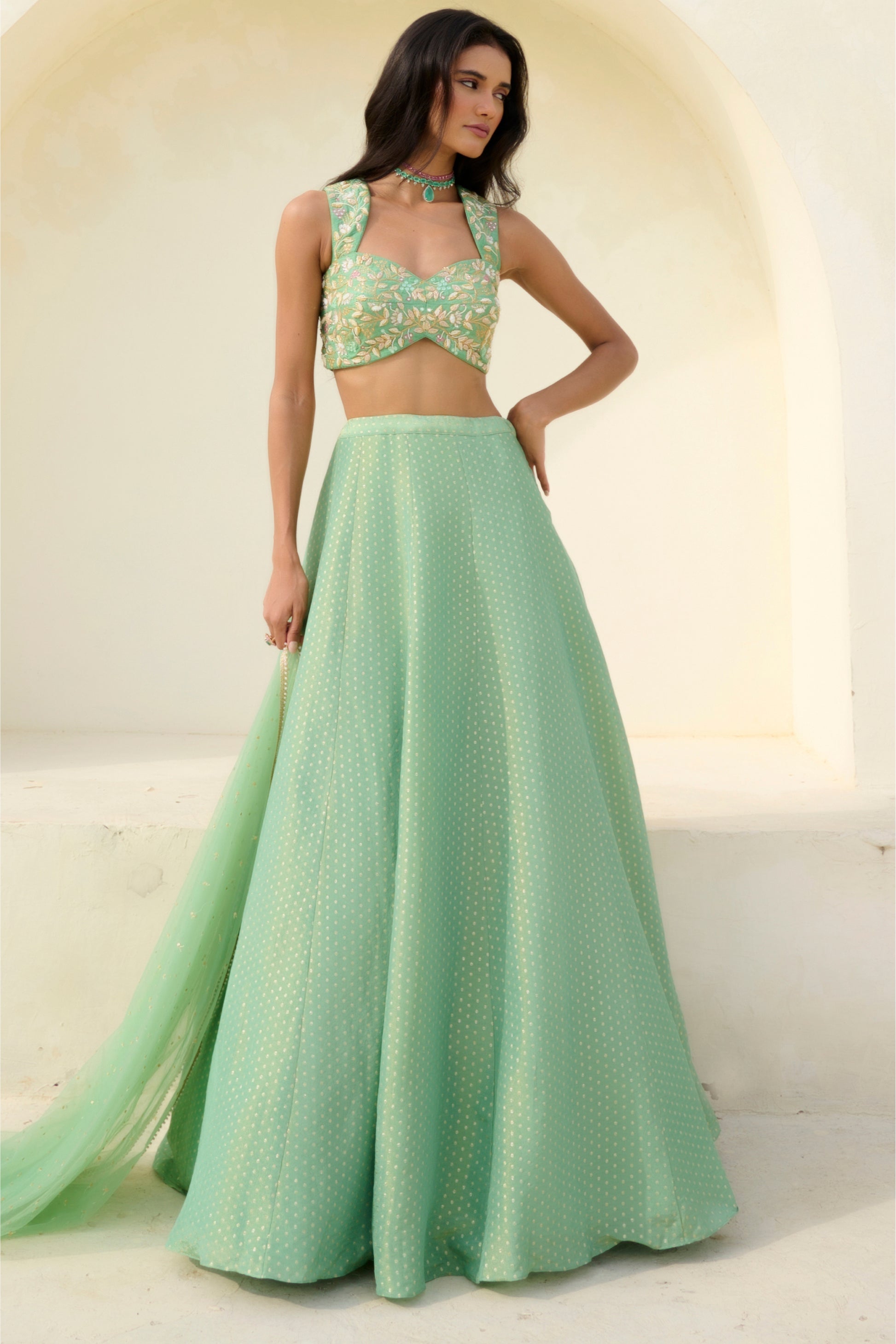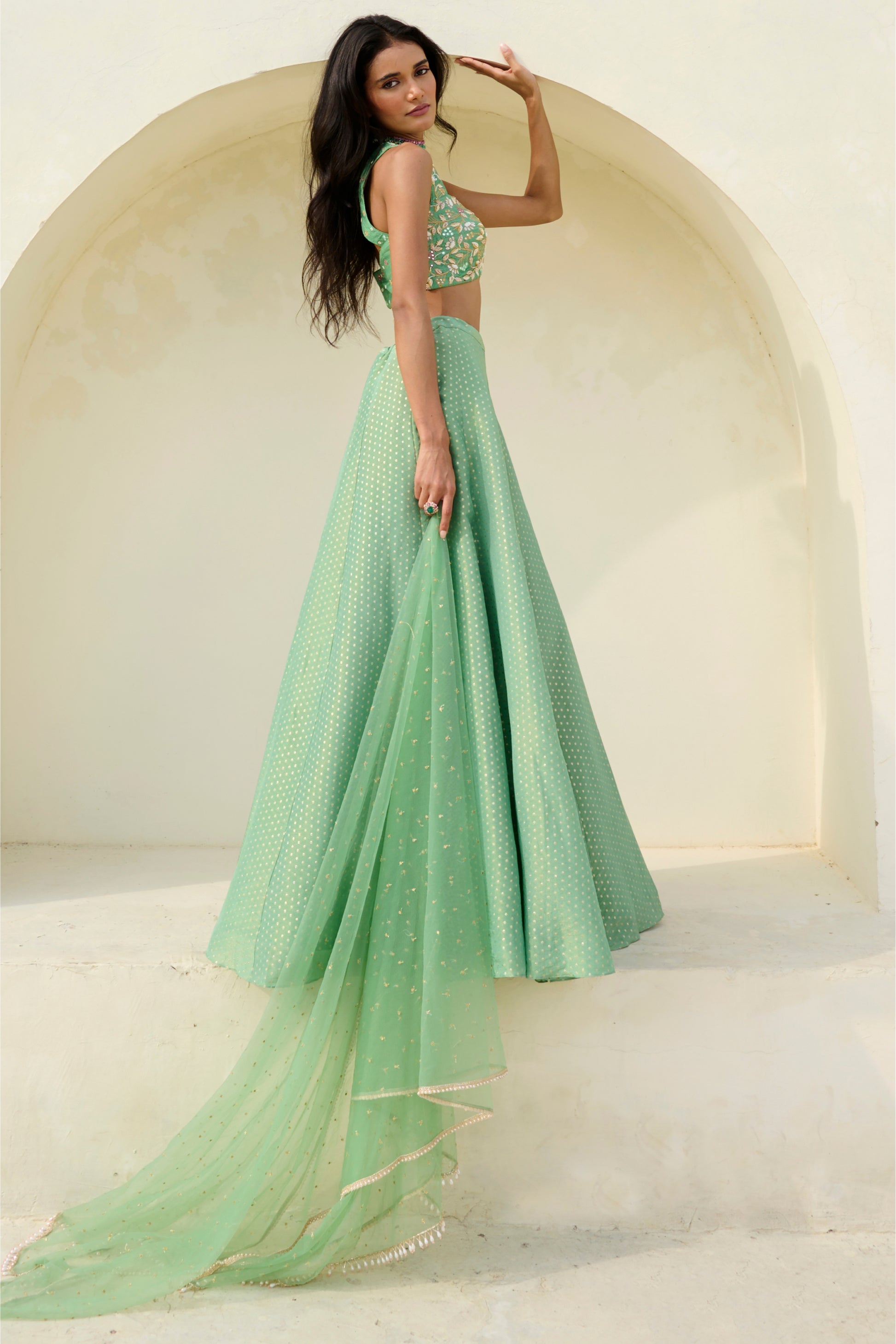Tissue brocade polka woven lehenga paired with glass beads, pearl and sequence embroidered blouse and tulle dupatta