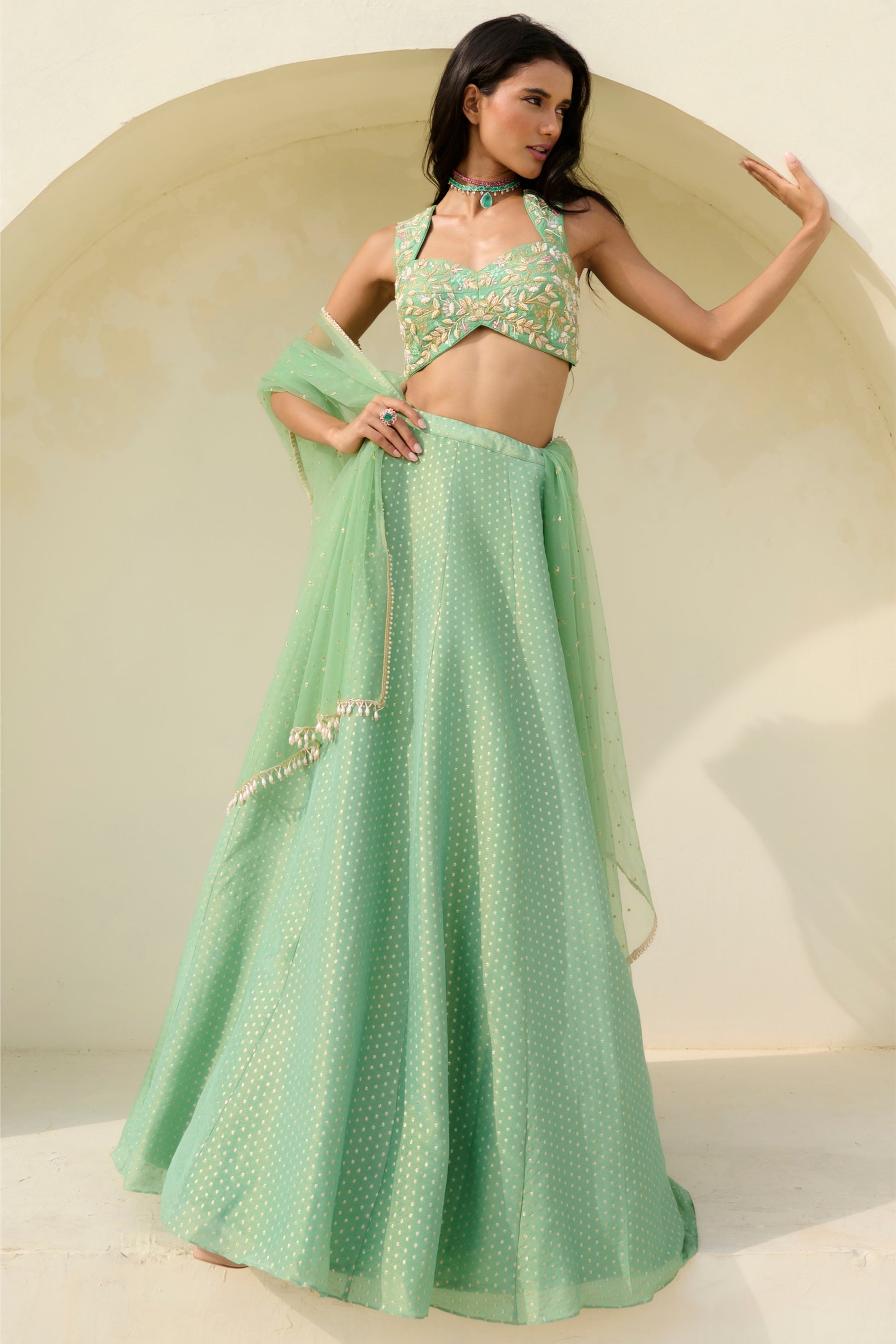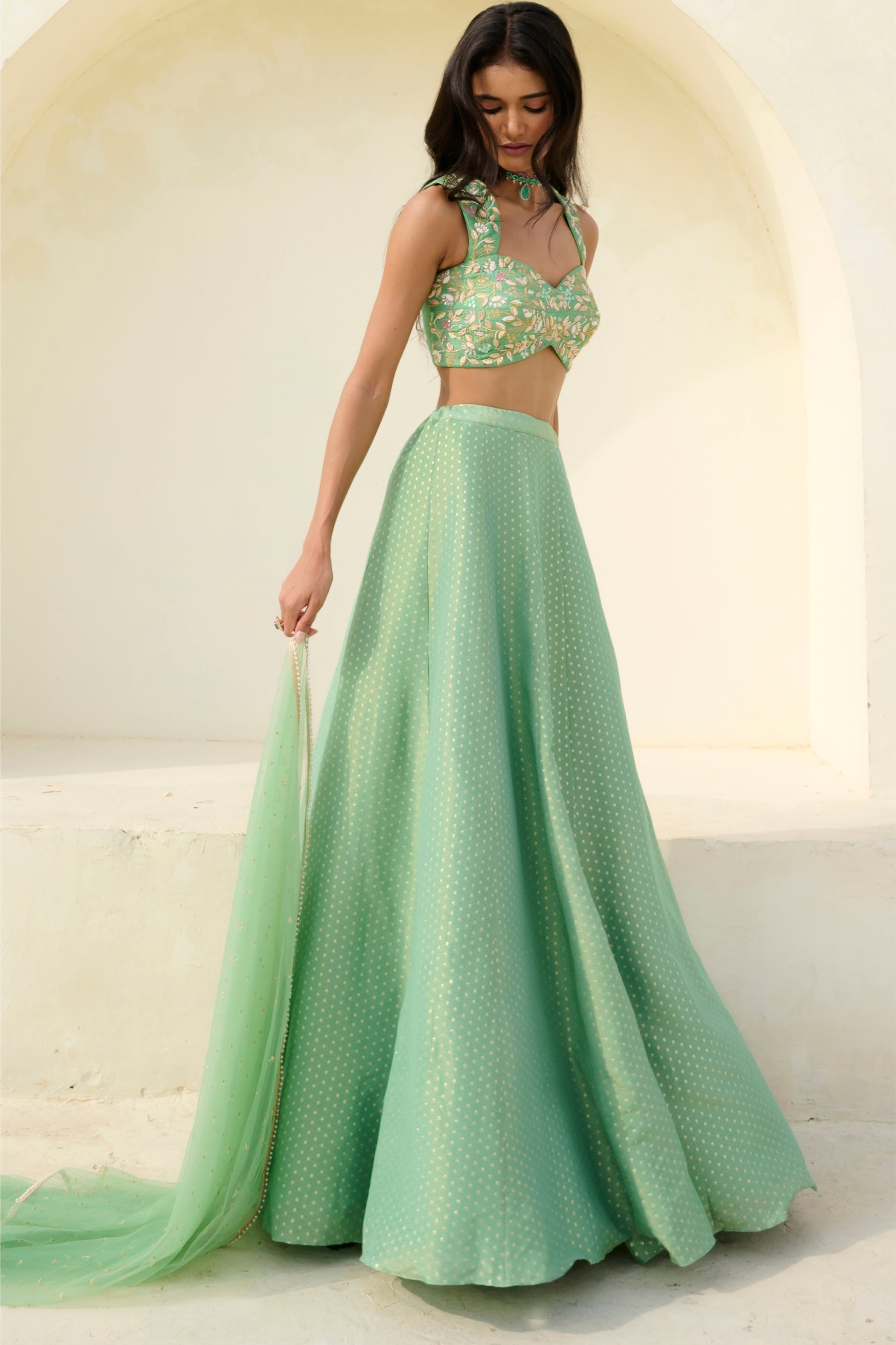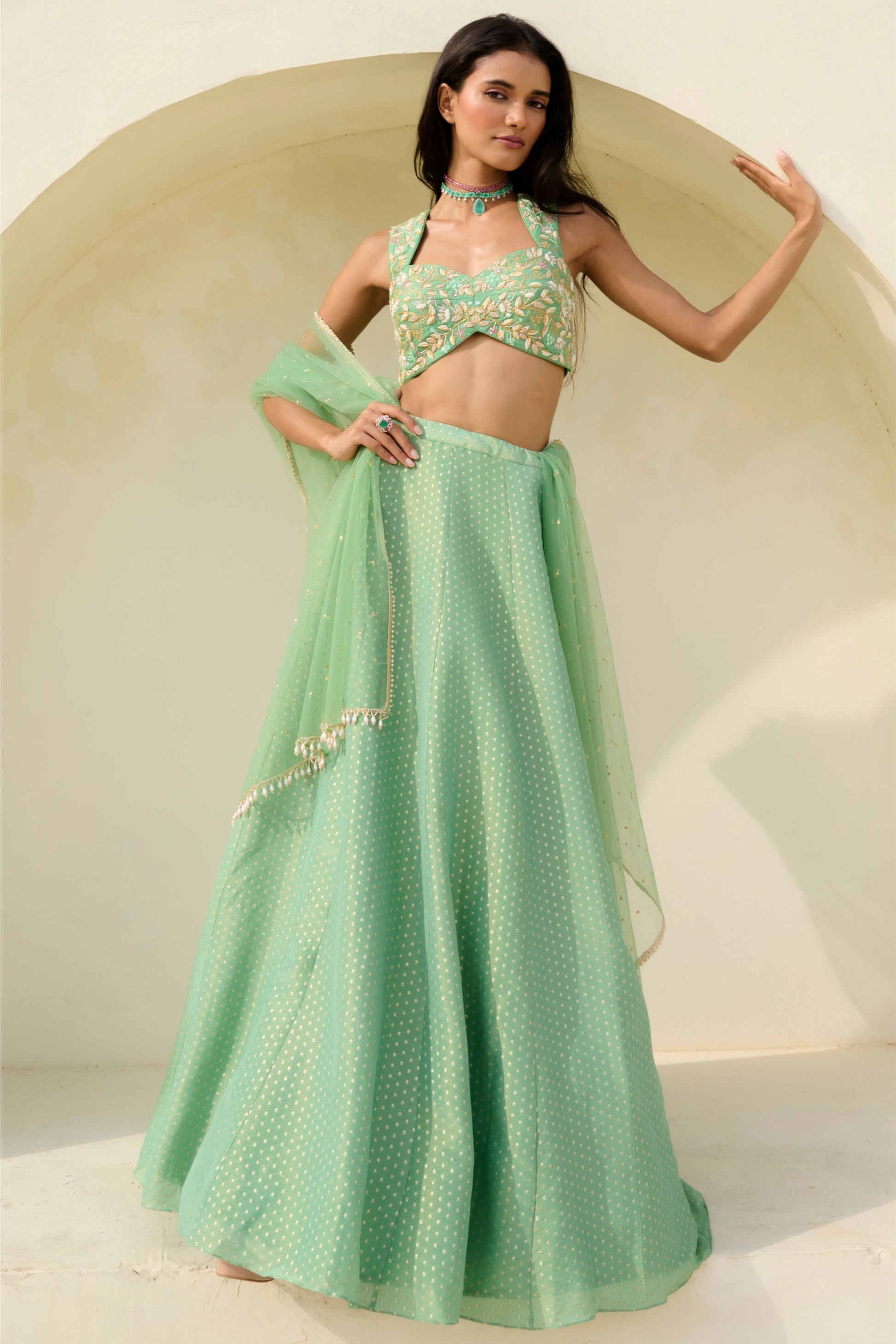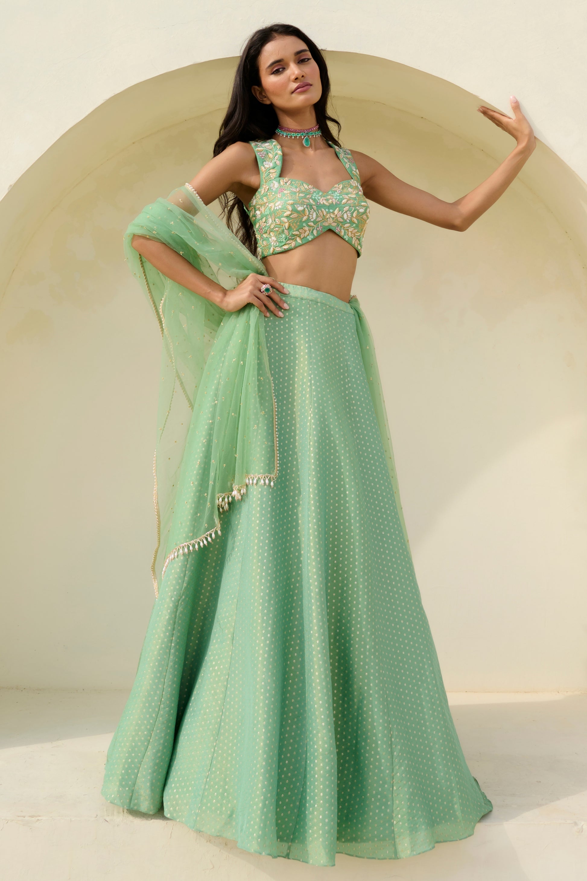 Tissue brocade polka woven lehenga paired with glass beads, pearl and sequence embroidered blouse and tulle dupatta
