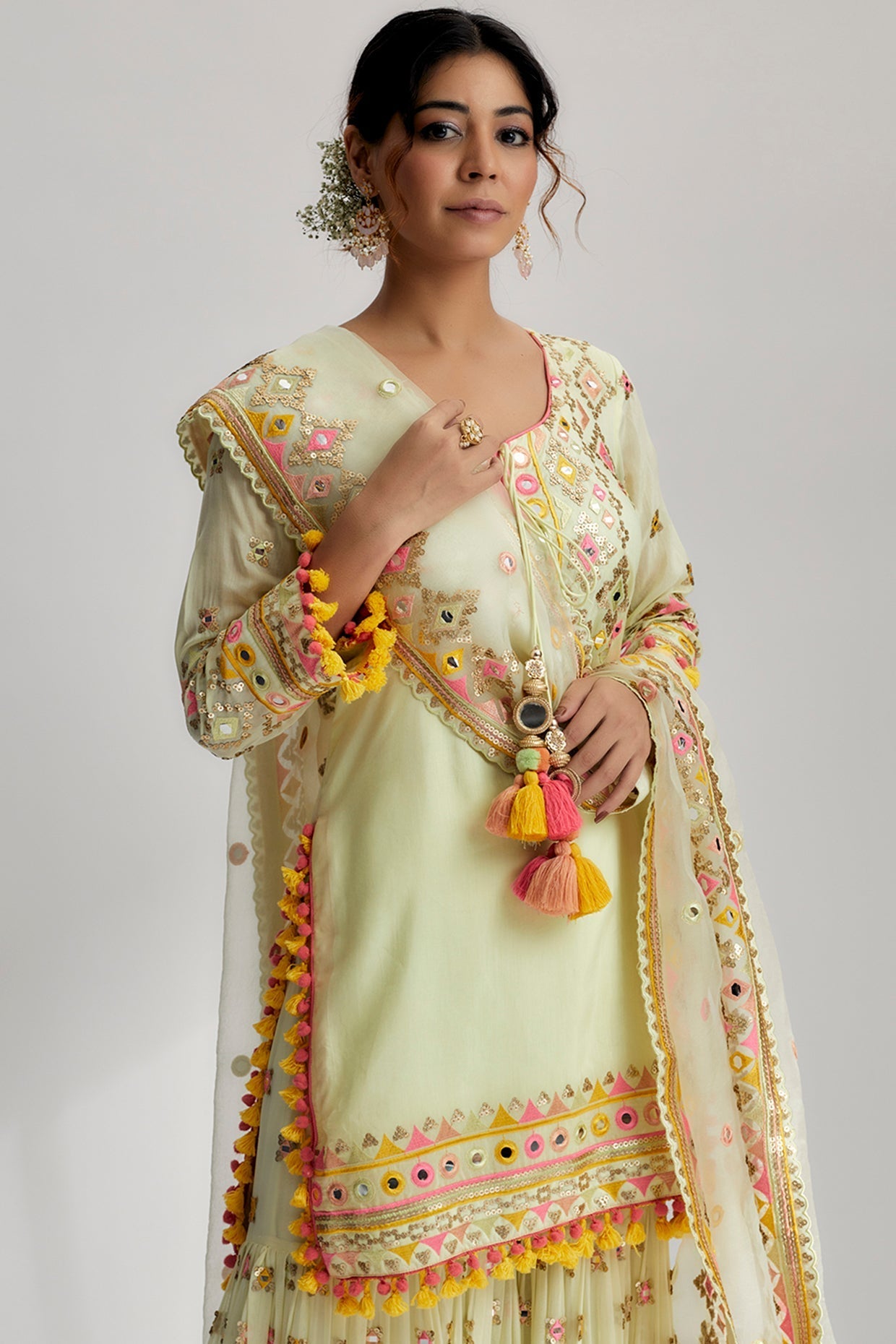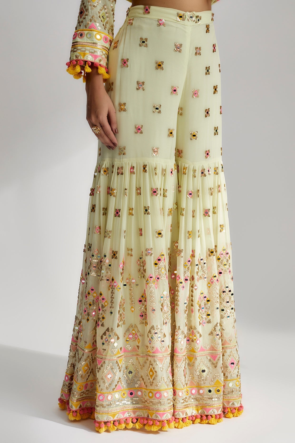 Immerse yourself in the captivating allure of this sharara set, a stunning ensemble that seamlessly blends traditional charm with contemporary style. Meticulously crafted with exquisite attention to detail, this set stands as a true masterpiece of design.