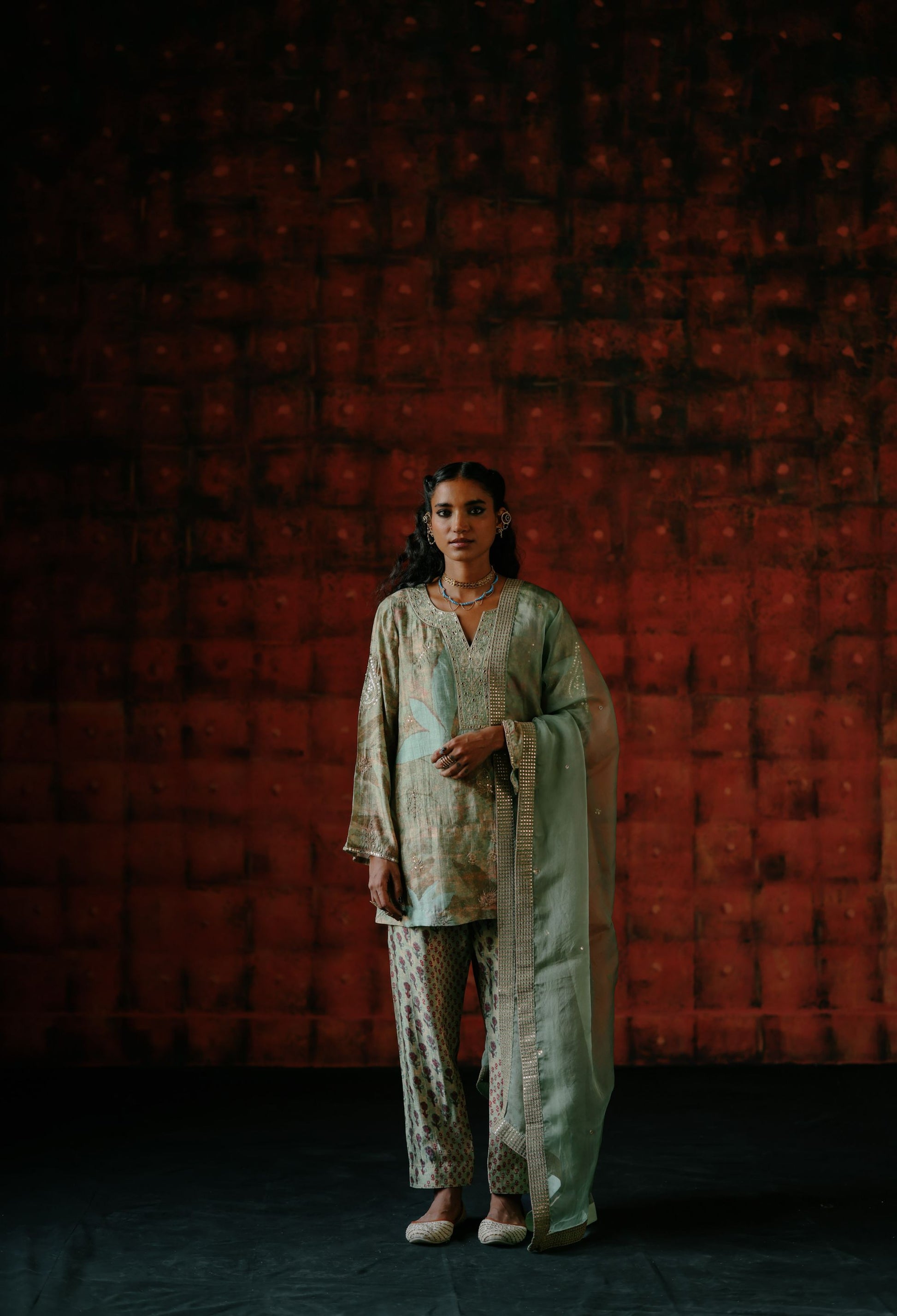 Featuring a mint printed tunic in Dupion silk with embroidered neck and sleeve details. It is paired with a printed Dupion silk salwar and an embroidered organza dupatta.
