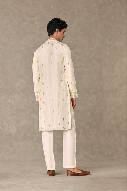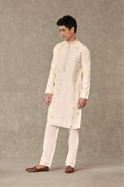 Kurta- Gold foil printed kurta with full sleeves | Embellished collar and concealed placket | Pocket Detail |Mandarin Collar | Ivory Straight pant