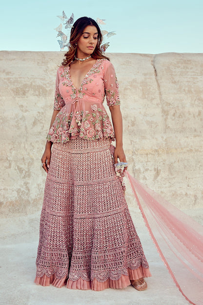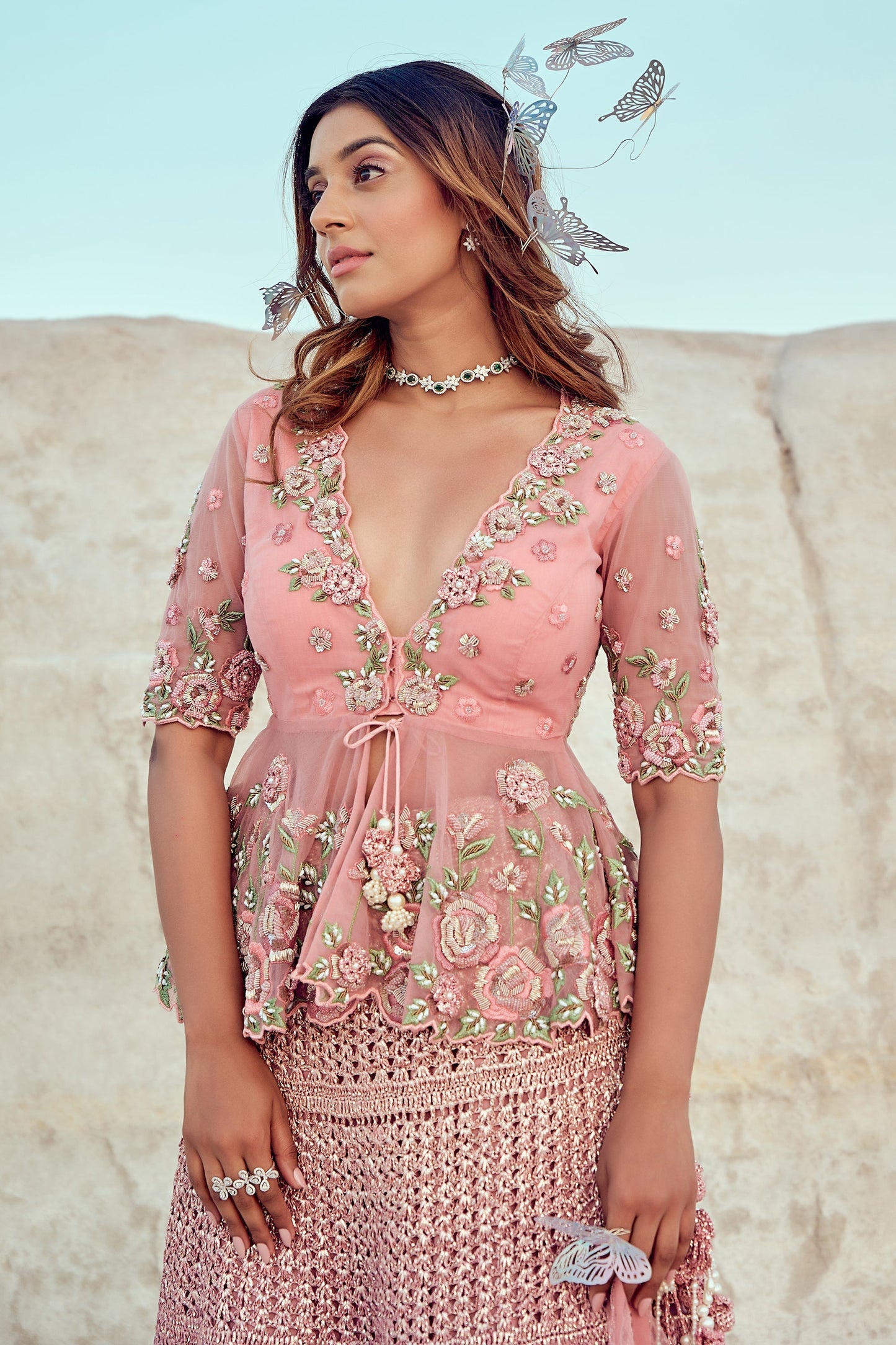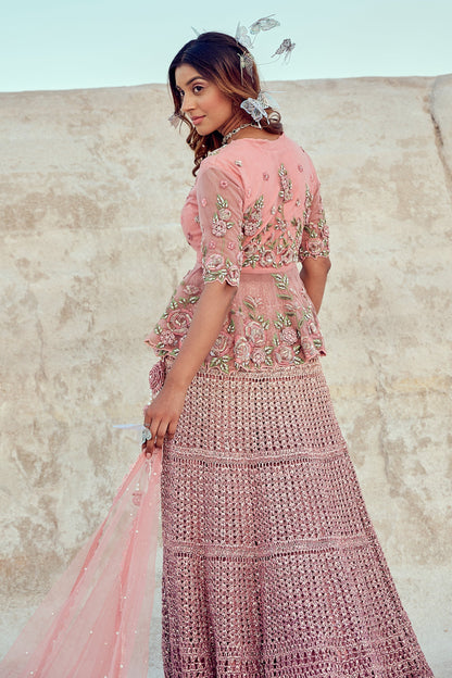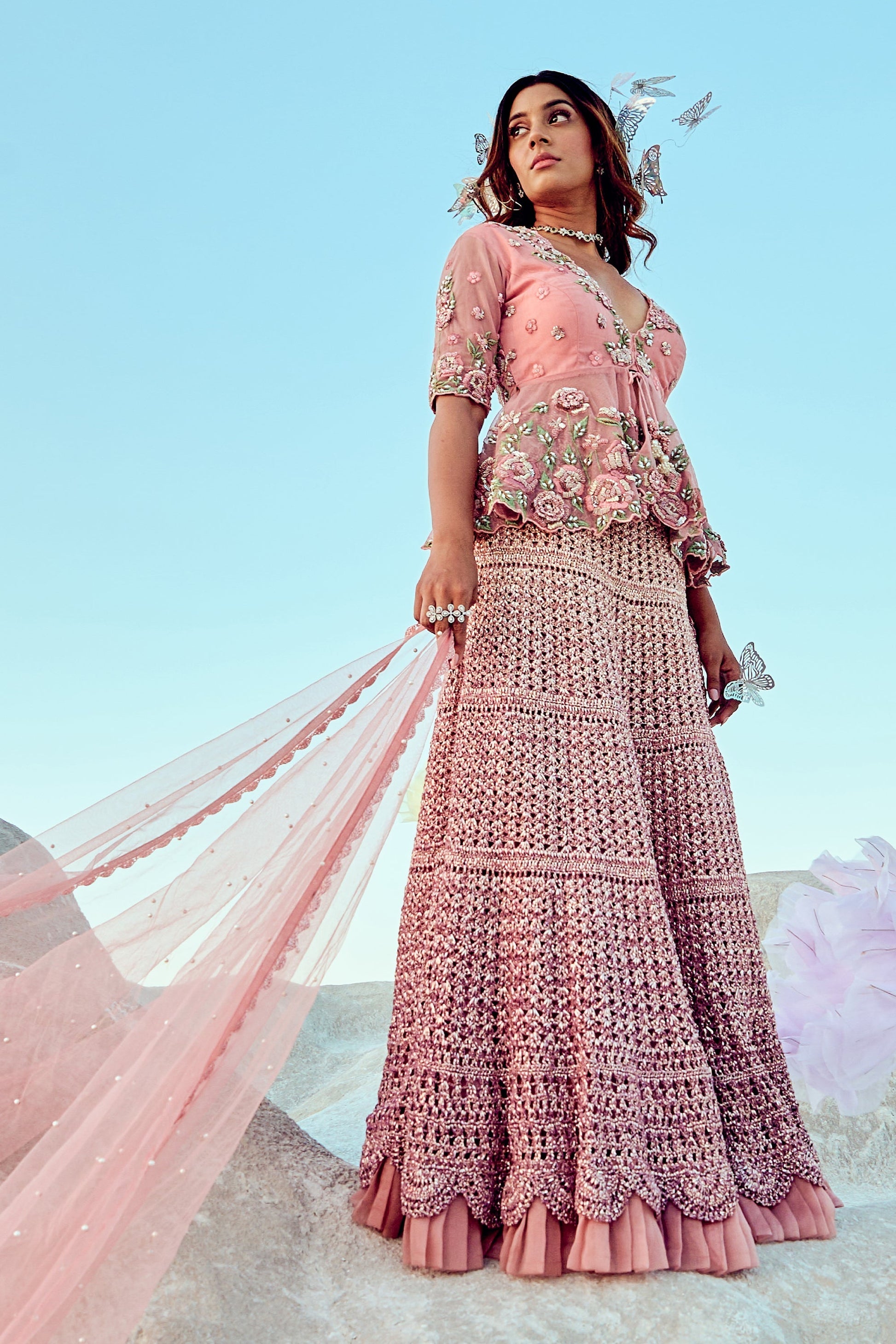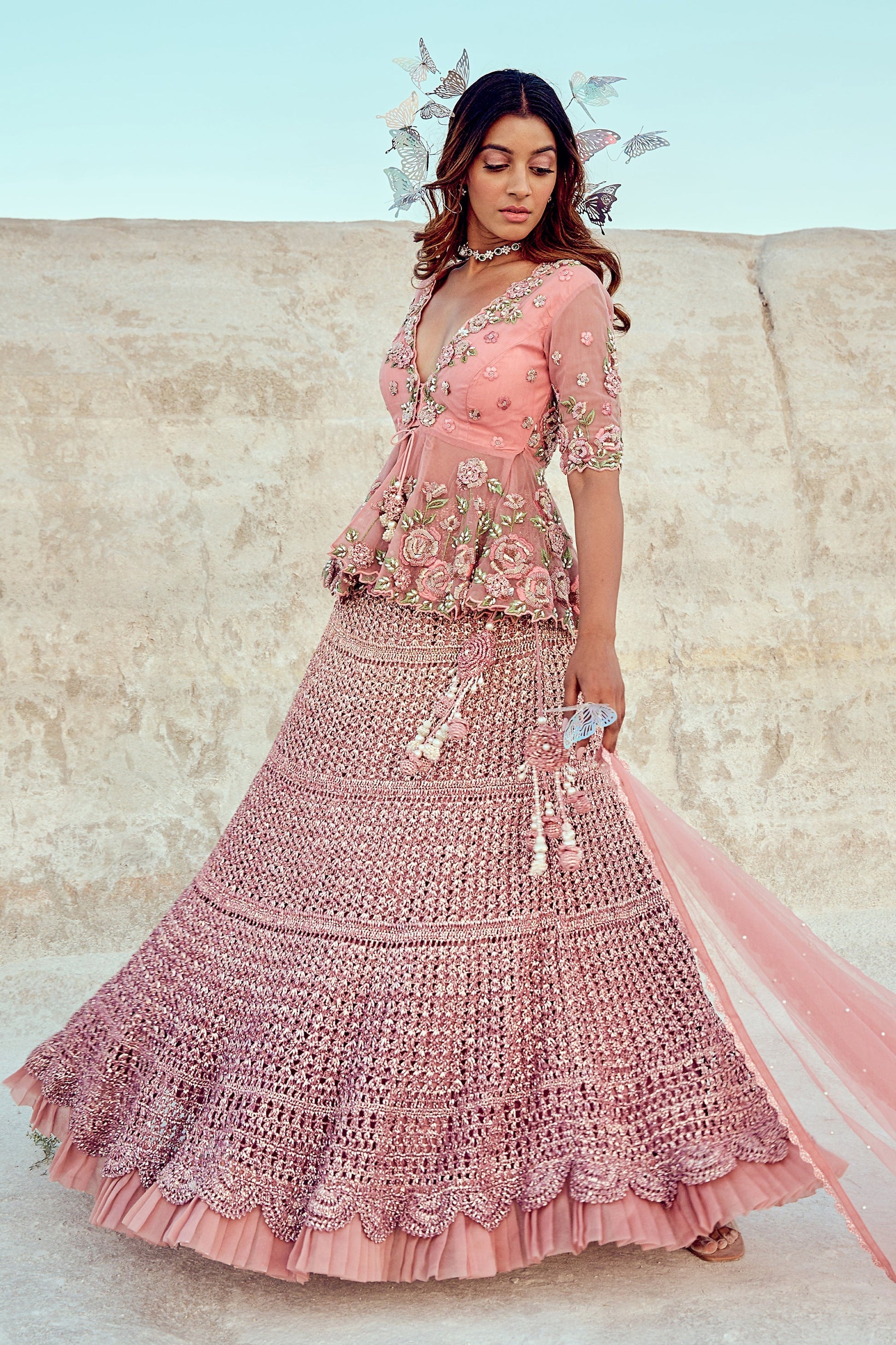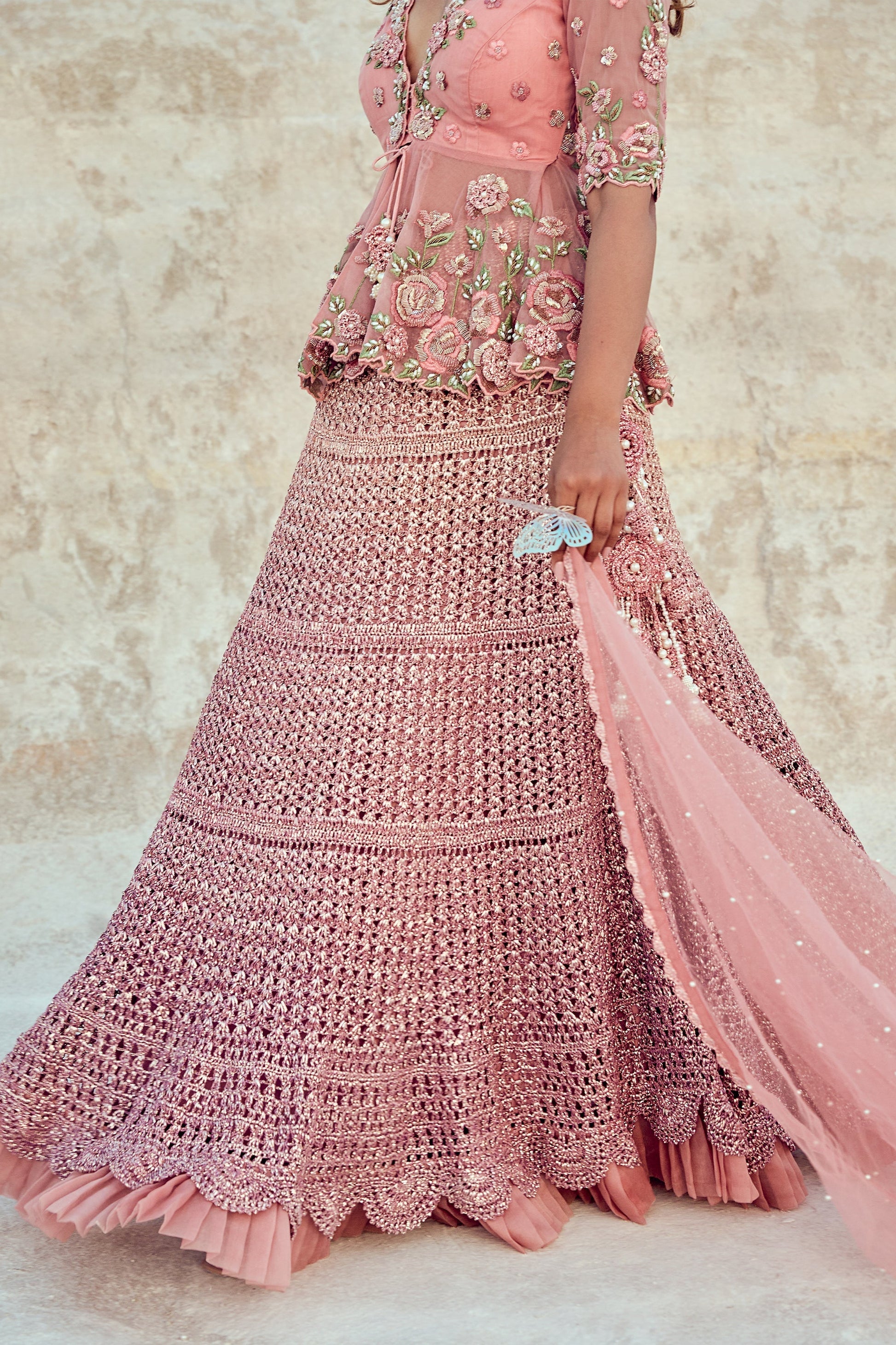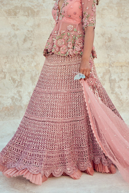 Our unique and signature pink mesh skirt that is hand knotted has scalloped ends and detailed with dainty pleats at the bottom. The heavily embroidered peplum top makes the outfit rich and elegant. The ensemble is complete with a tulle dupatta with mesh lace and moti all over.