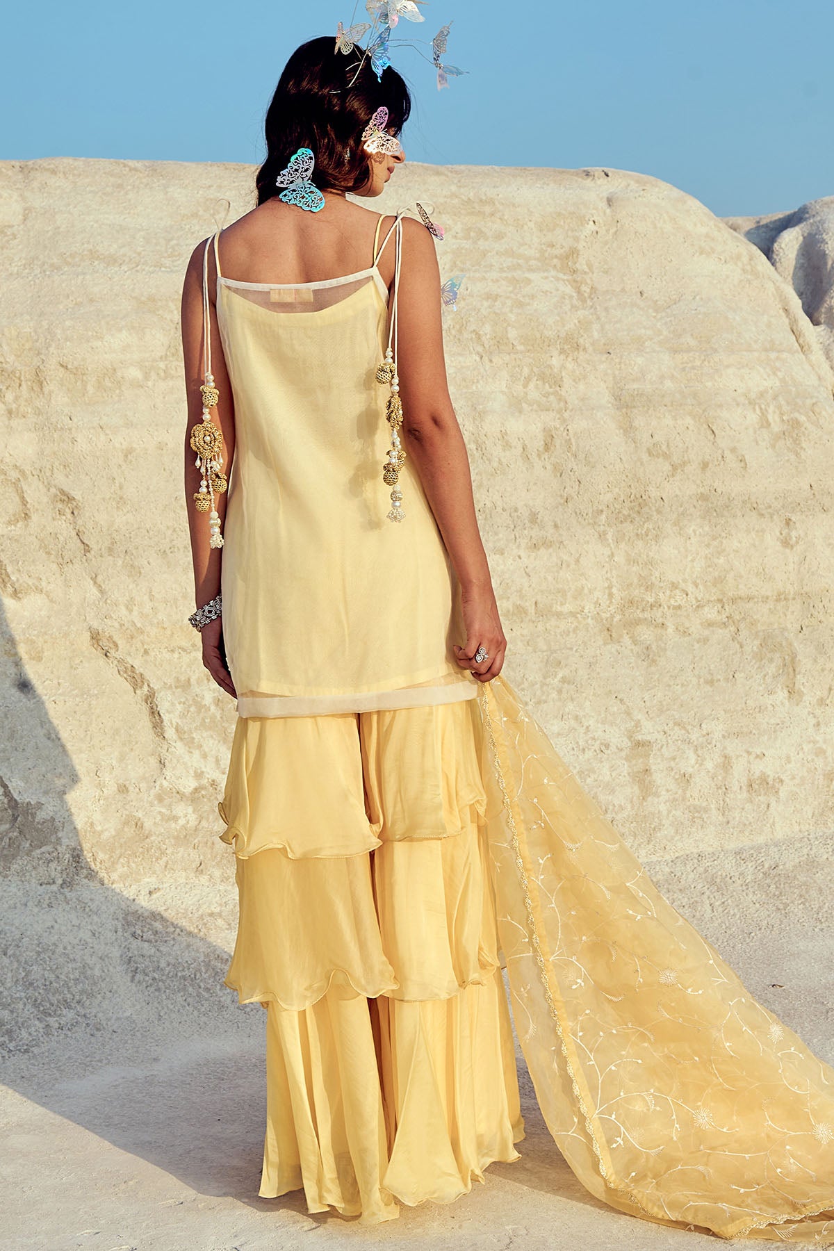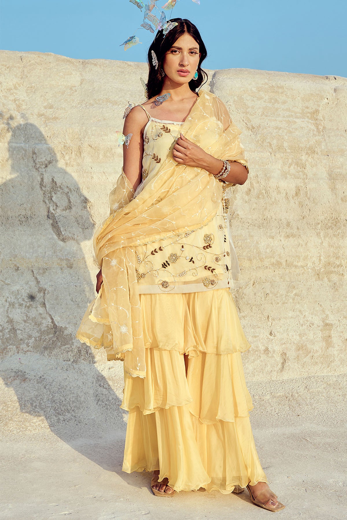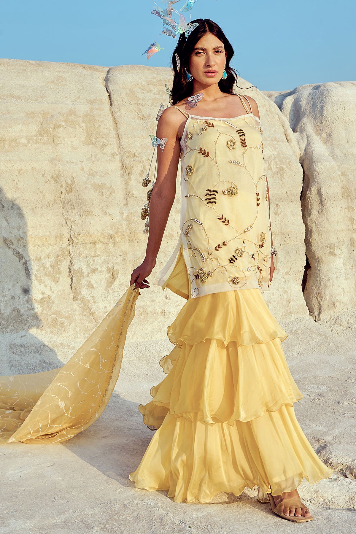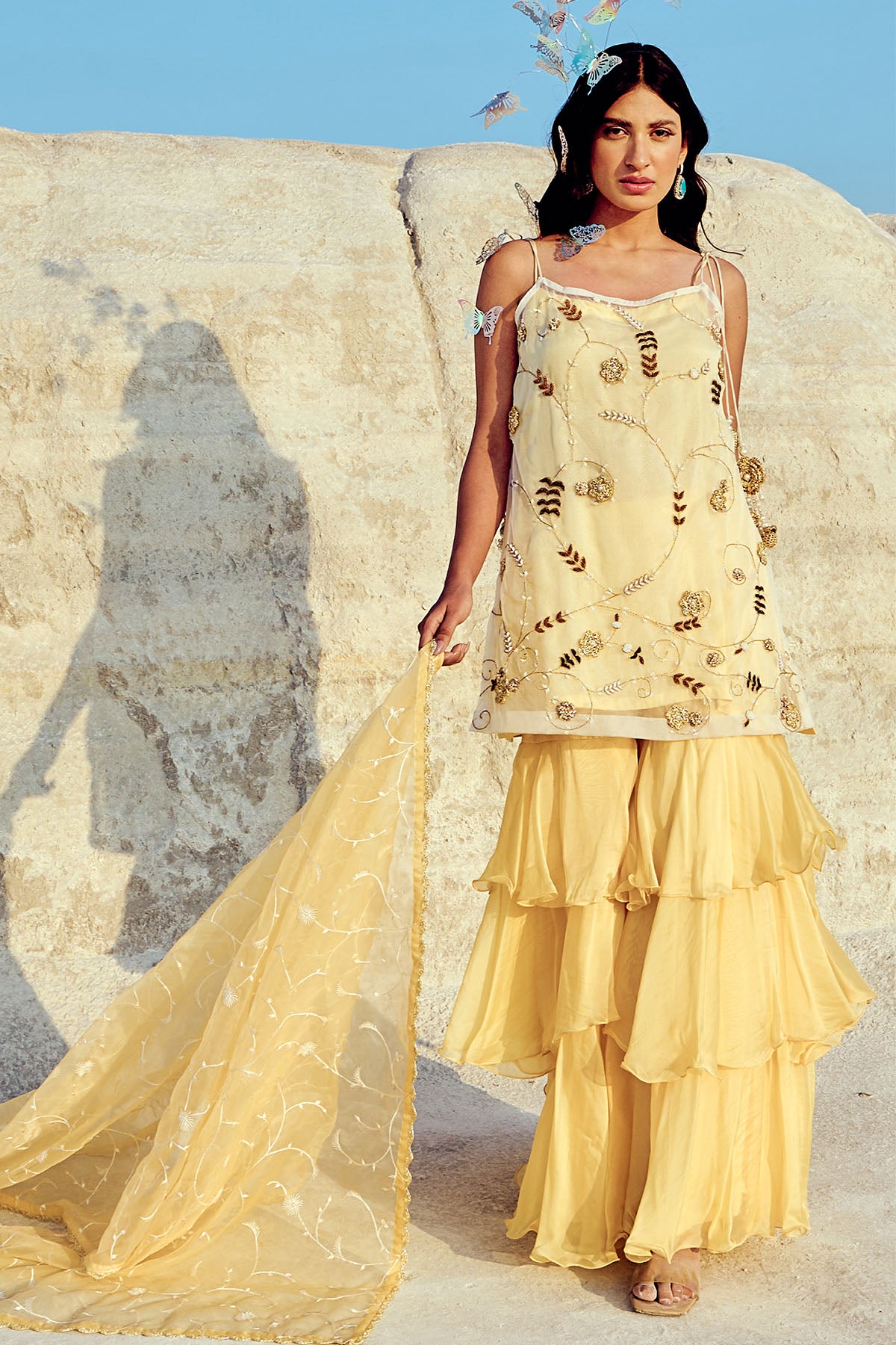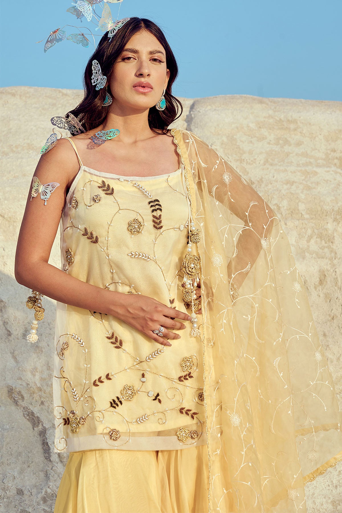 Dreamy hand embroidered moti and zardosi flowers adorn the spaghetti tunic with dainty tassles on the shoulder tieups (comes with matching inner). The tired sharara adds to the drama. The jaal organza dupatta with mesh lace makes the look complete.