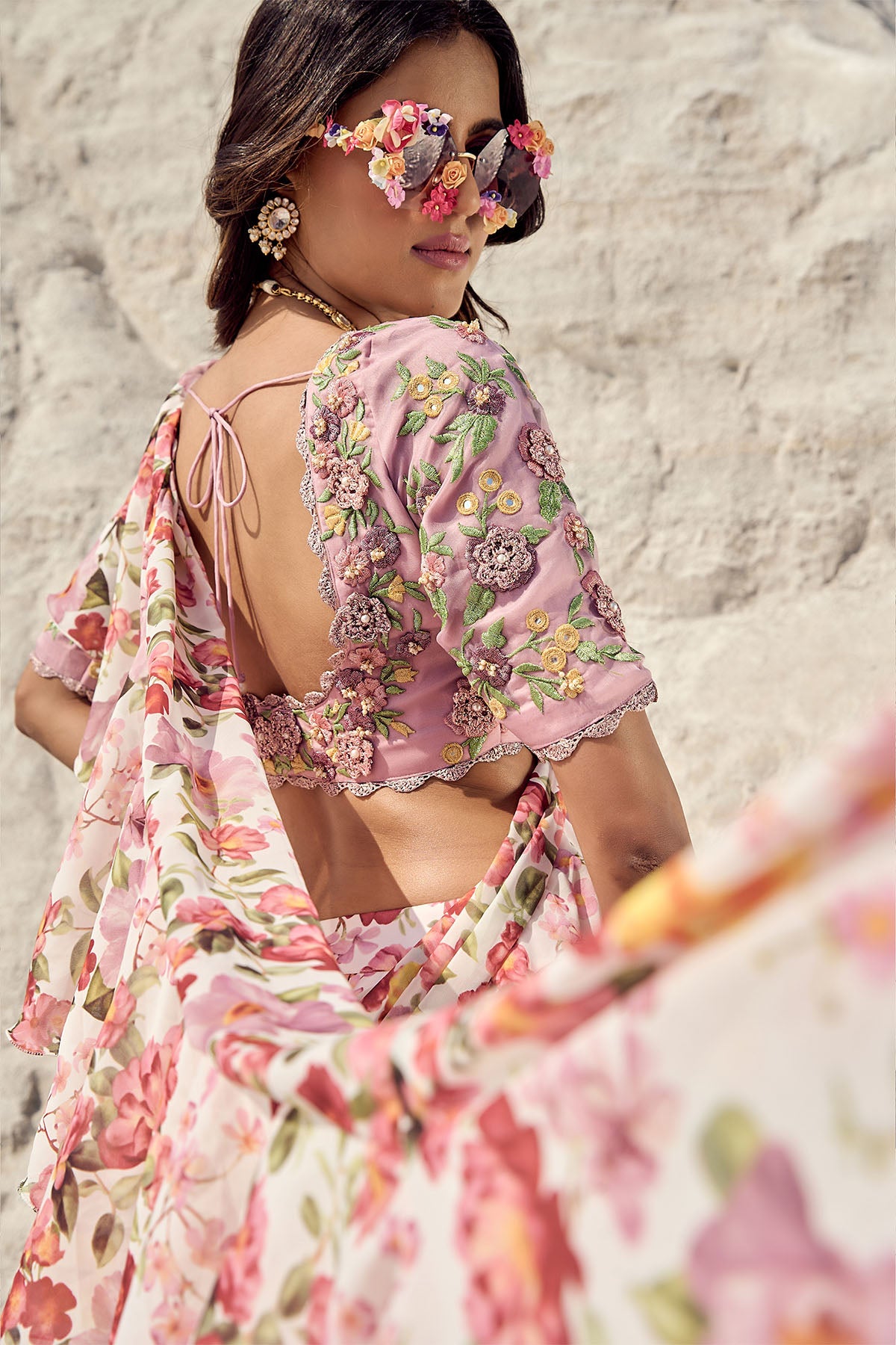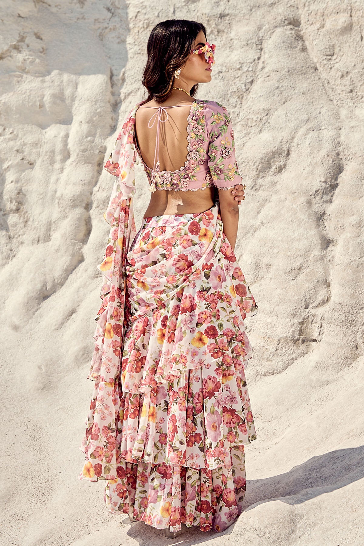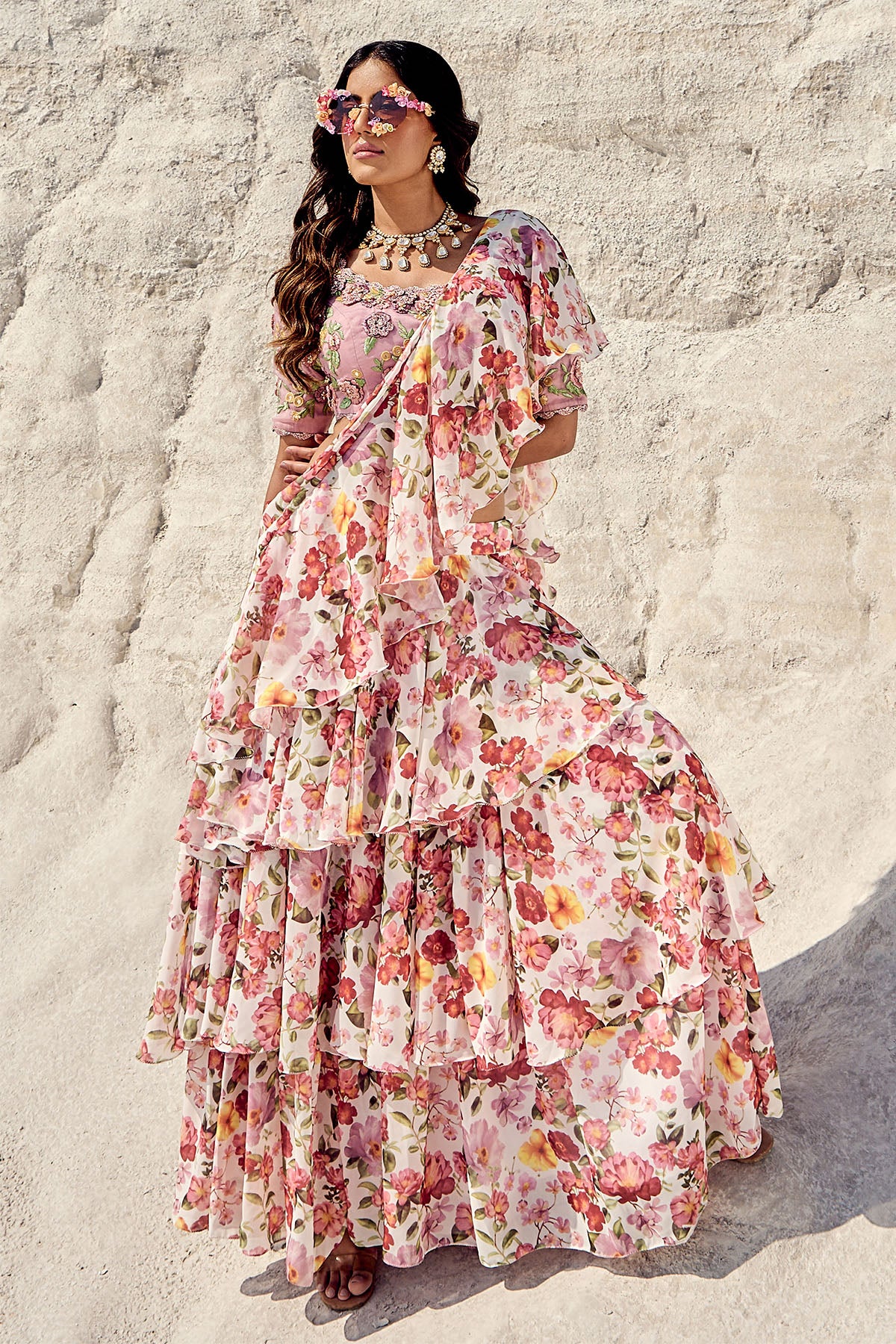 A tiered predraped saree in a anti-wrinkle georgette with a ruffle palla is every woman's dream outfit for a destination wedding. The floral embroidered blouse makes the outfit elegant enuf for any occasion. The mesh flowers and lace detailing in the blouse is the highlight of the ensemble.