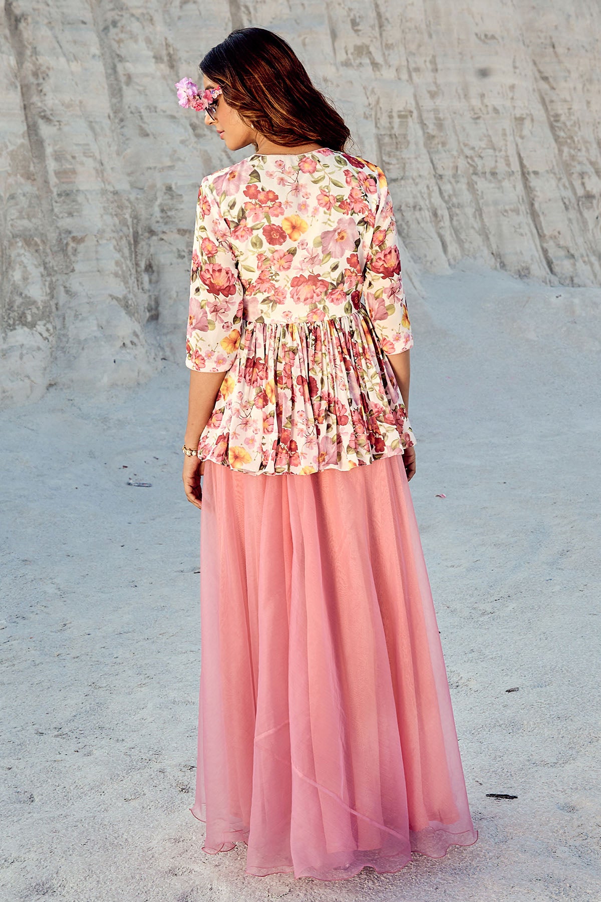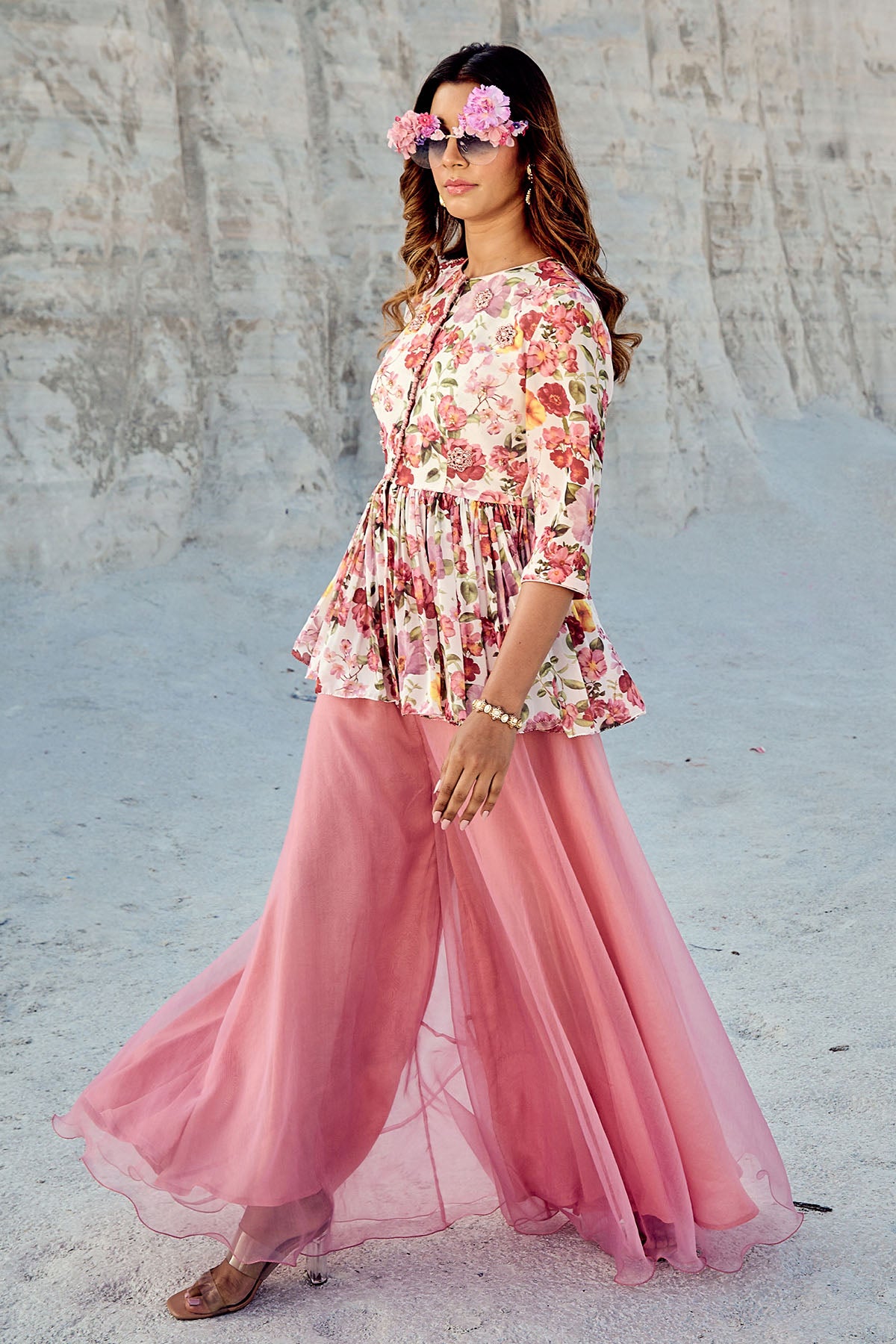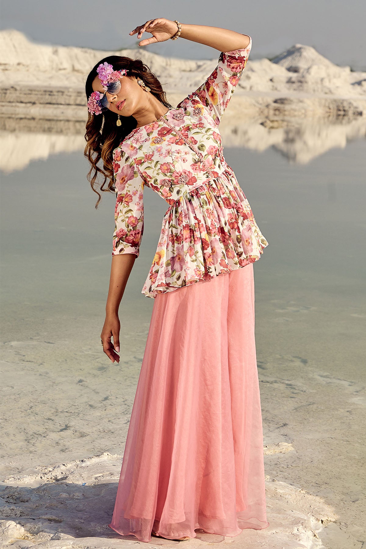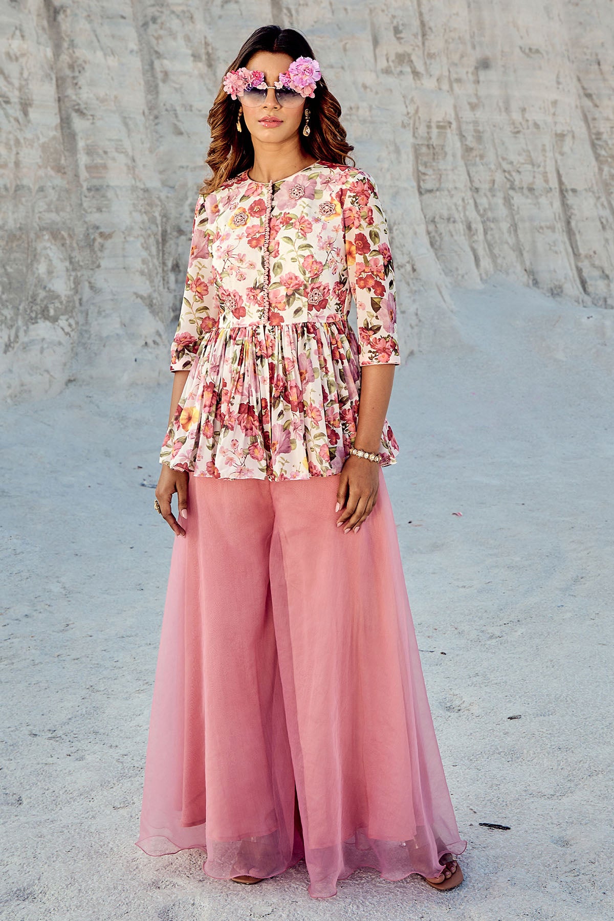 A no-fuss printed anti-wrinkle georgette peplum top with front opening is paired with a flared sharara in pure organza.