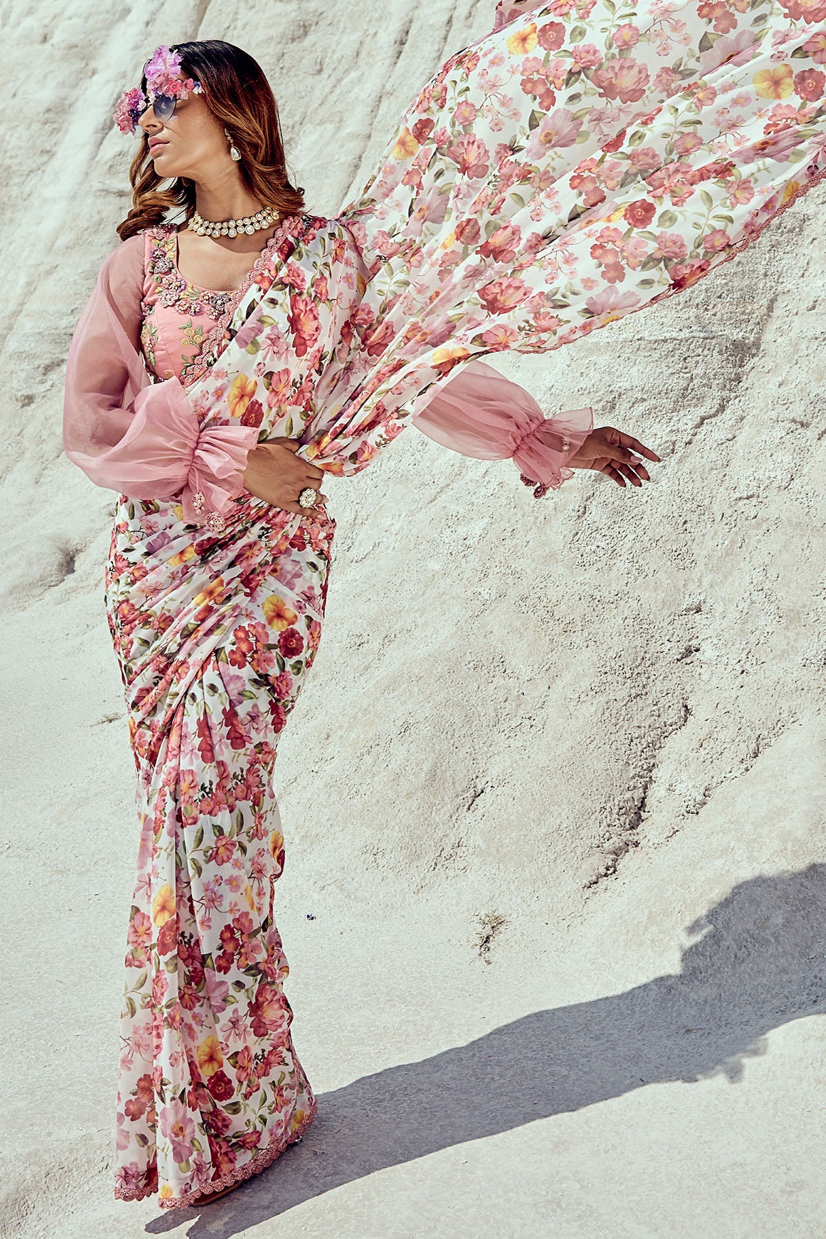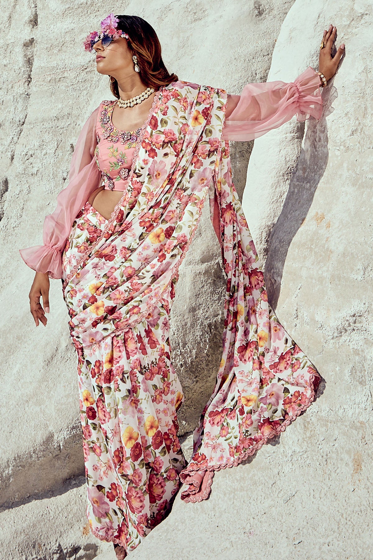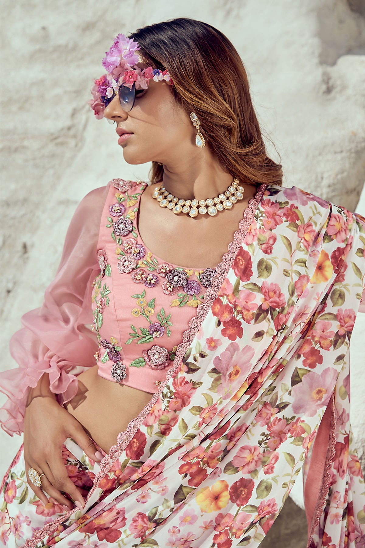 An easier version of a regular saree ... Its a predraped one. Just zip up the skirt and throw the palla over the shoulder. It is ornamented with delicate hand knotted mesh lace. The Georgette saree is paired with an embroidered blouse with puff sleeves with tie-ups.