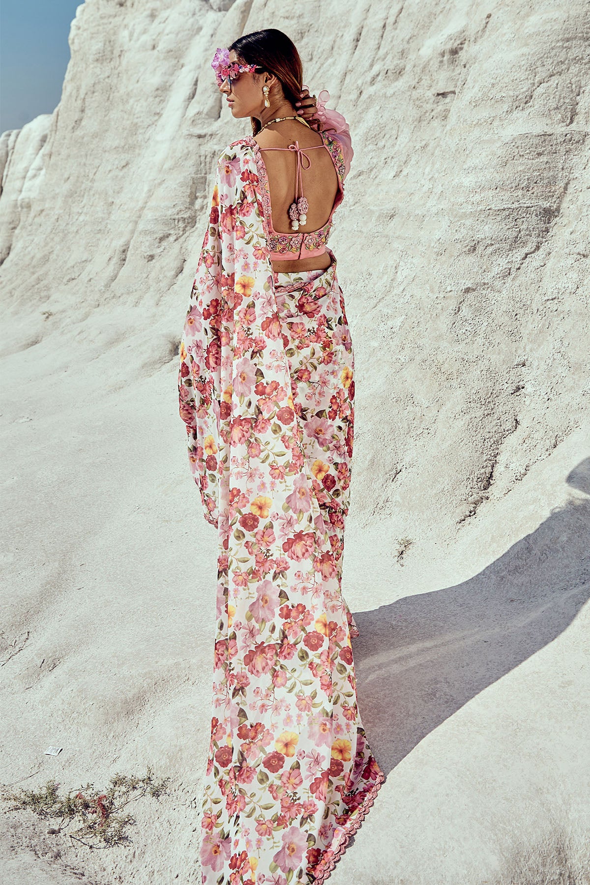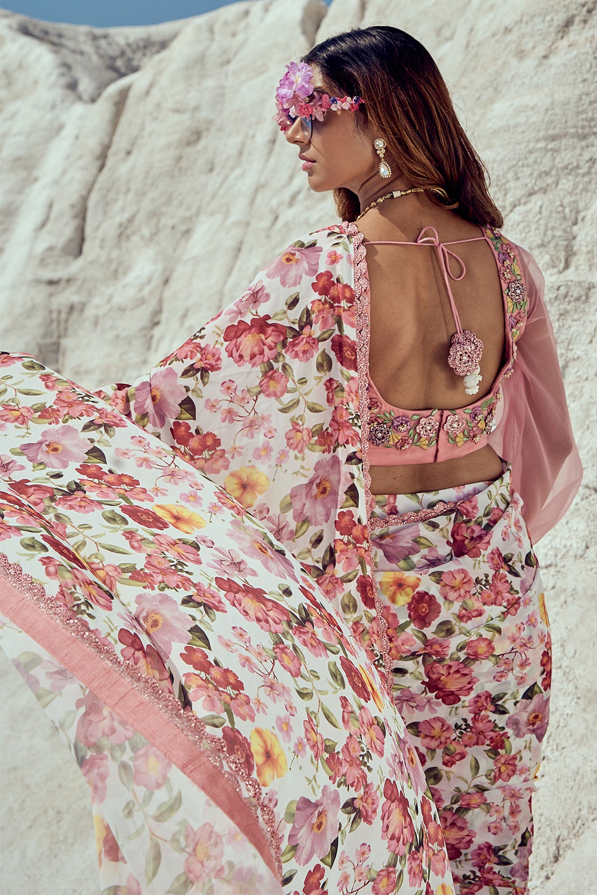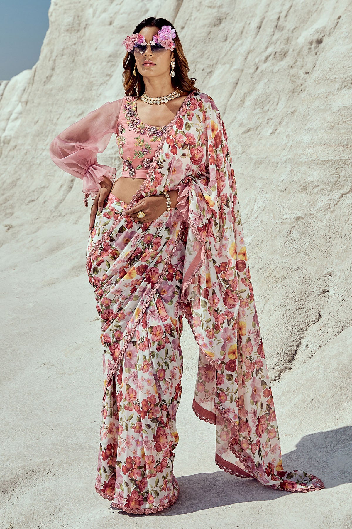 An easier version of a regular saree ... Its a predraped one. Just zip up the skirt and throw the palla over the shoulder. It is ornamented with delicate hand knotted mesh lace. The Georgette saree is paired with an embroidered blouse with puff sleeves with tie-ups.