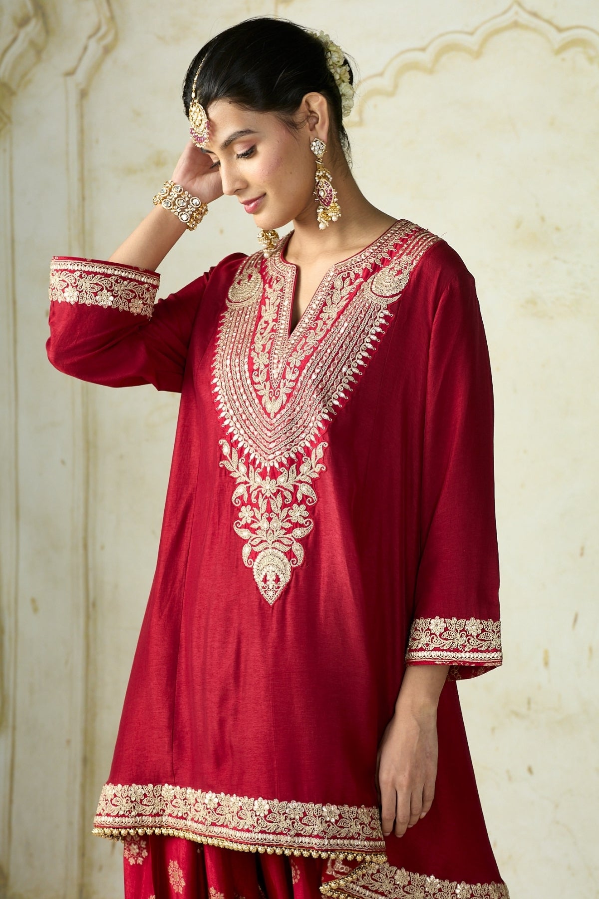 The asymmetrical kurta is adorned with intricate embroidery along the neckline, hem, and cuffs, adding a regal touch to the deep hue. Paired with a matching salwar featuring delicate motifs and a broad embroidered hemline, the ensemble captures the essence of traditional sophistication.