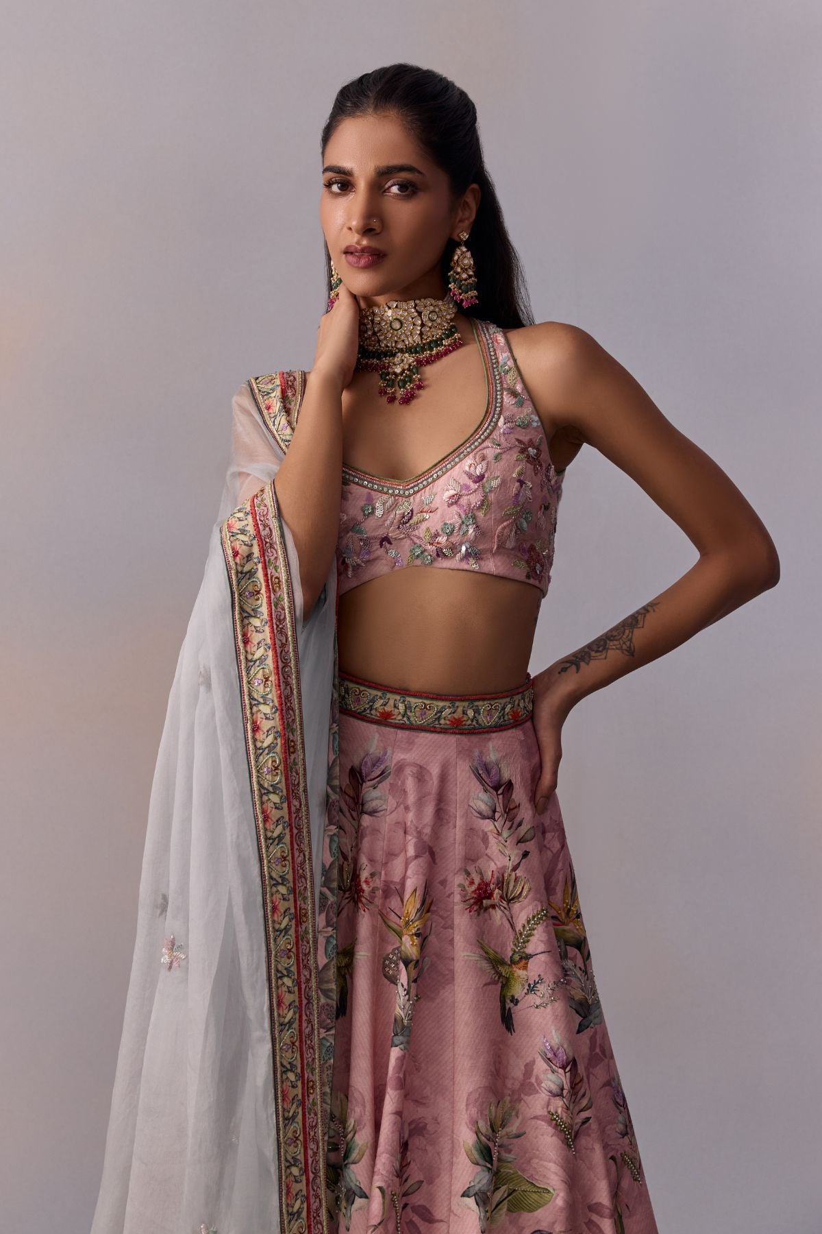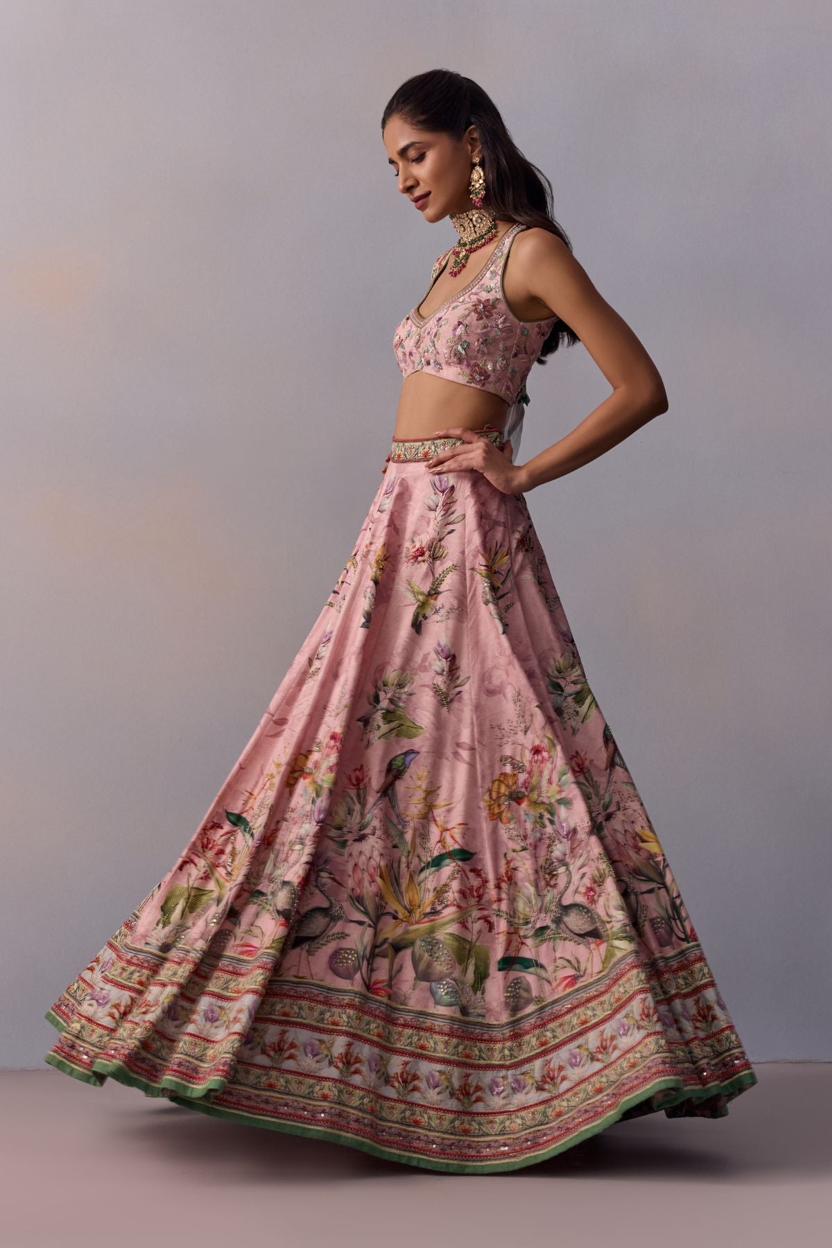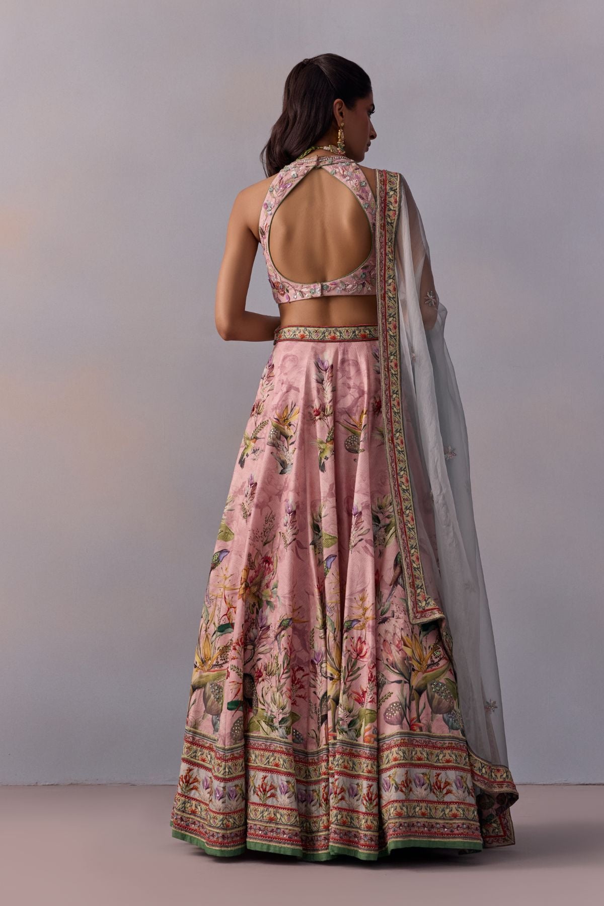 Featuring A classically feminine silhouette, hand painted and printed with floral motif . It Is emblazoned with embroidery and comes with a stylish organza dupatta that Helps Flaunt The Stylised Blouse Back.Perfect Outfit for Day Wedding Bells and Festivities.
