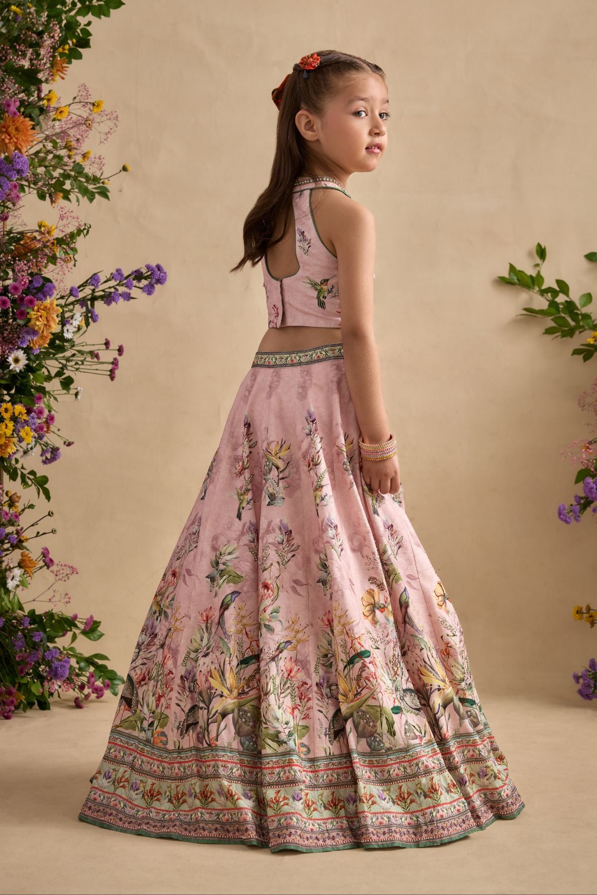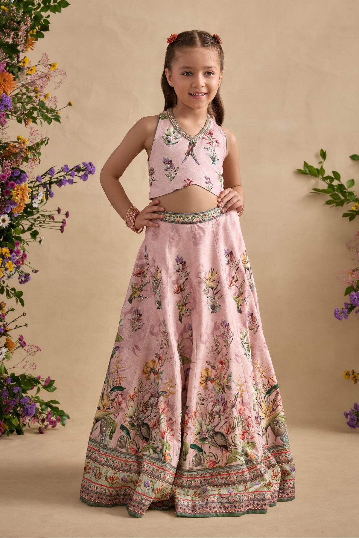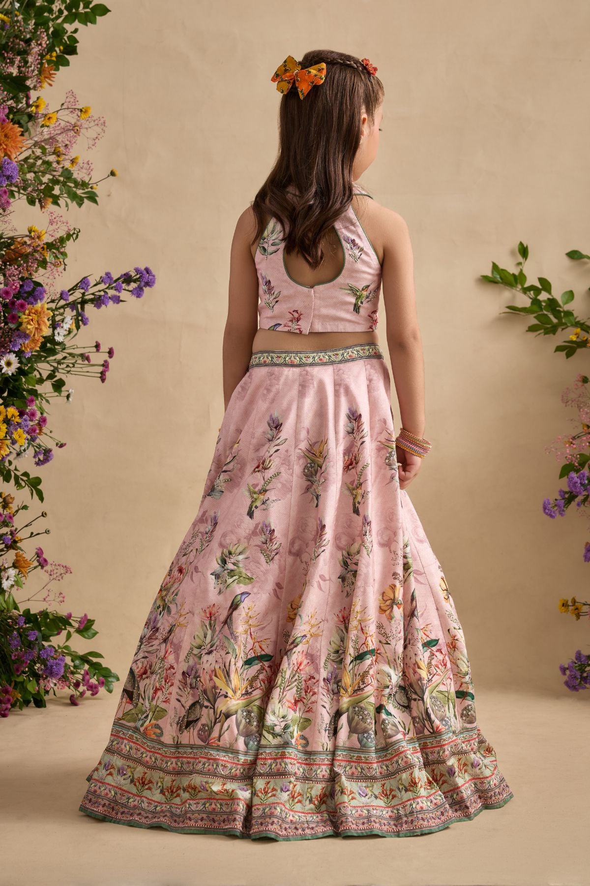 Dress up your adorable little one in Neisha Lehenga.Detailing of Hand Painted And Printed Floral Motifs and Intricate embroidery.Stylish blouse with halter neckline and key hole back. Perfect to carry on wedding occasions.