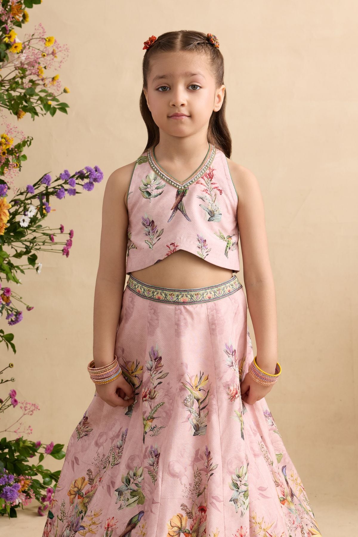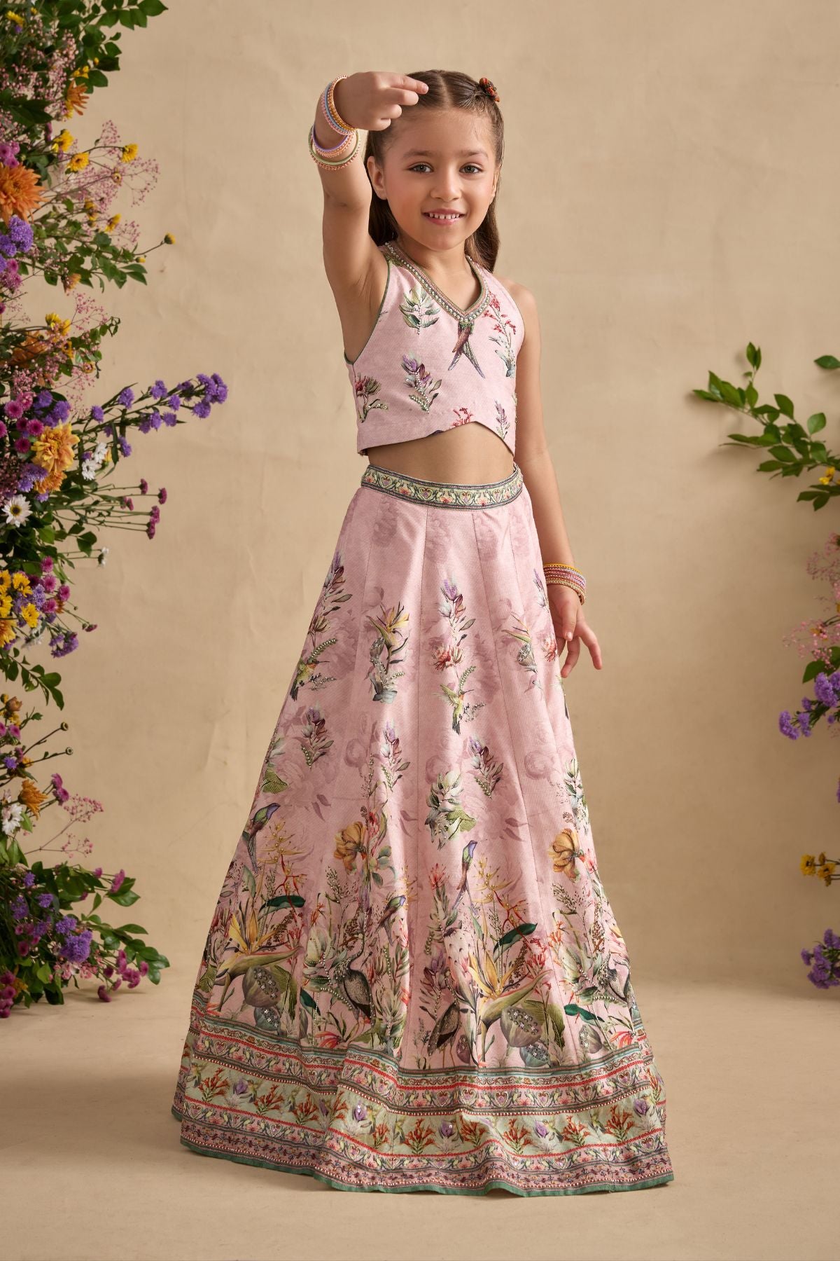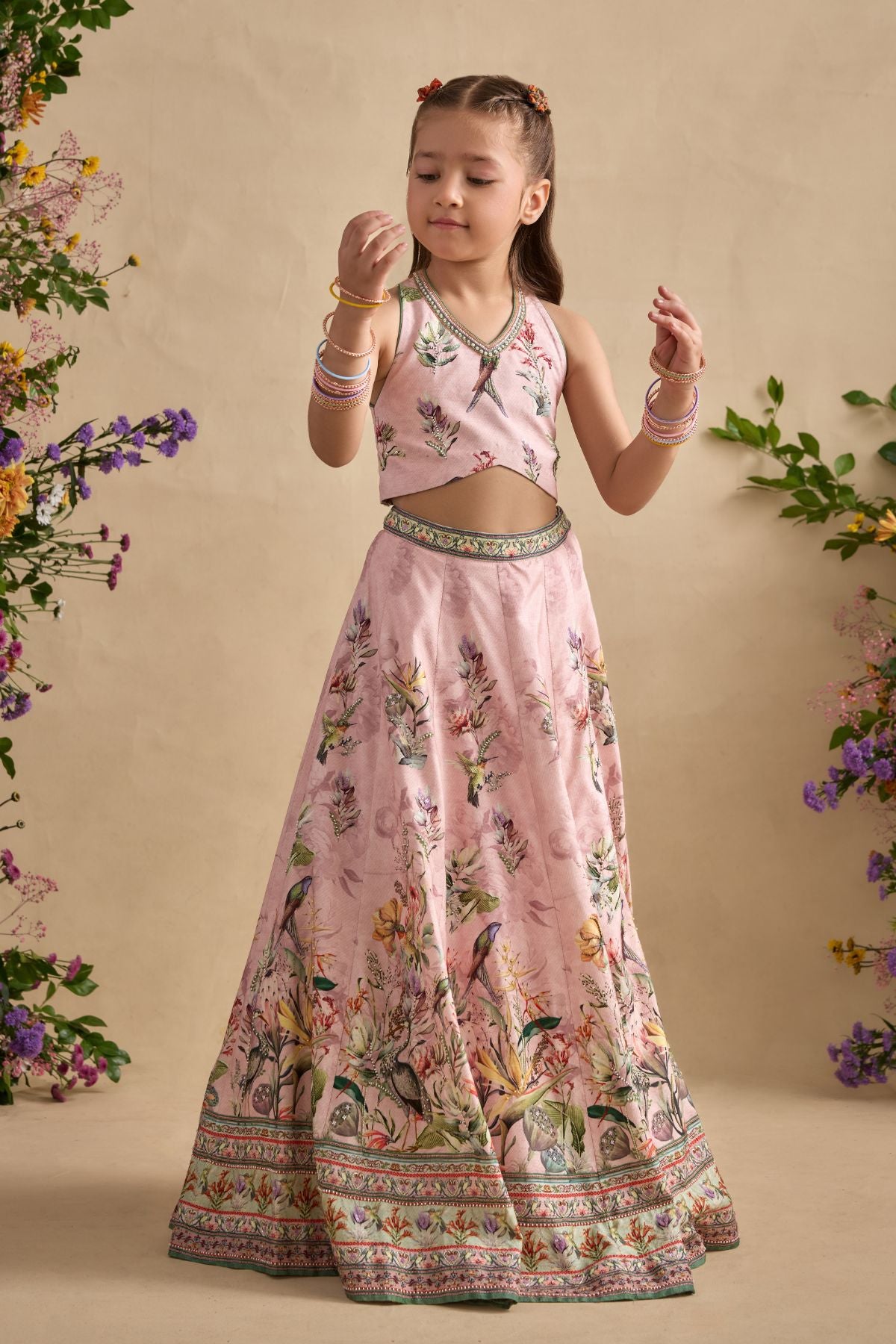 Dress up your adorable little one in Neisha Lehenga.Detailing of Hand Painted And Printed Floral Motifs and Intricate embroidery.Stylish blouse with halter neckline and key hole back. Perfect to carry on wedding occasions.