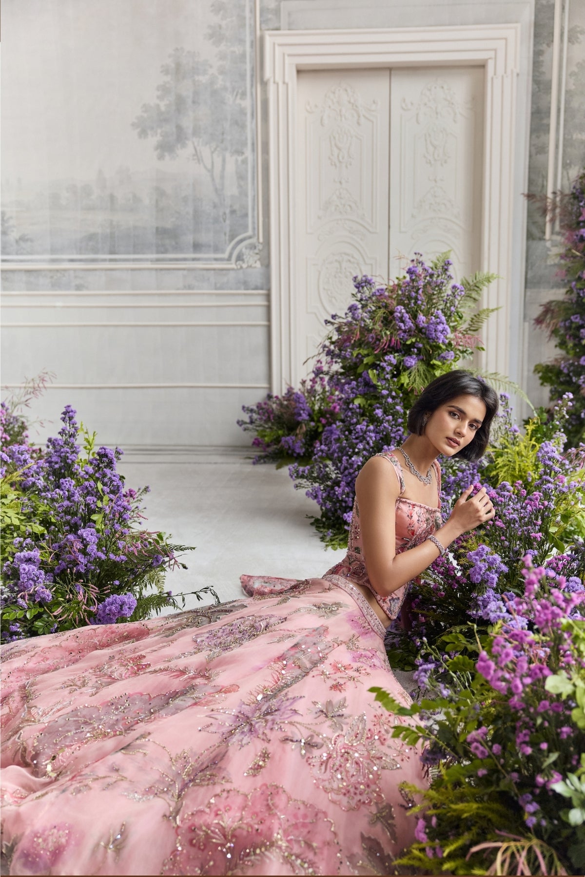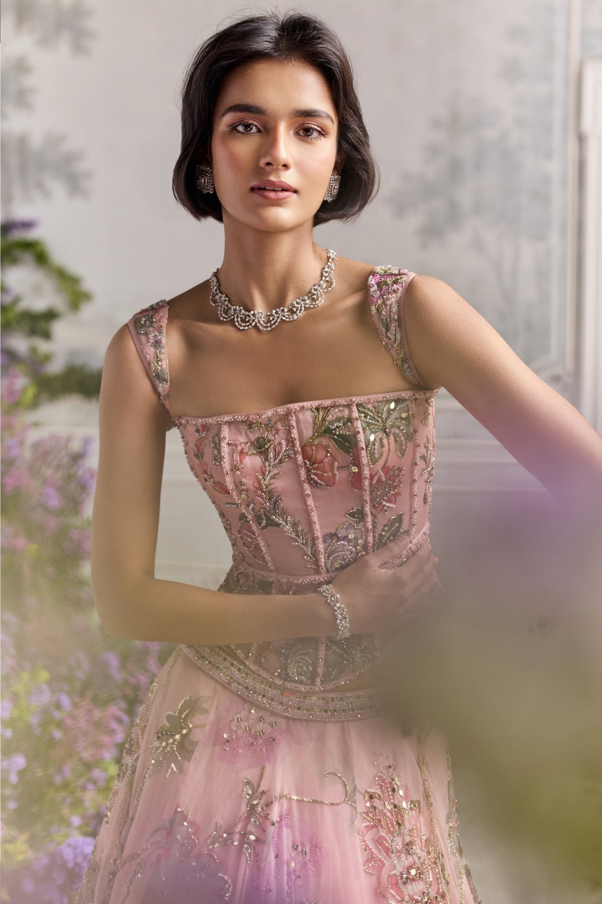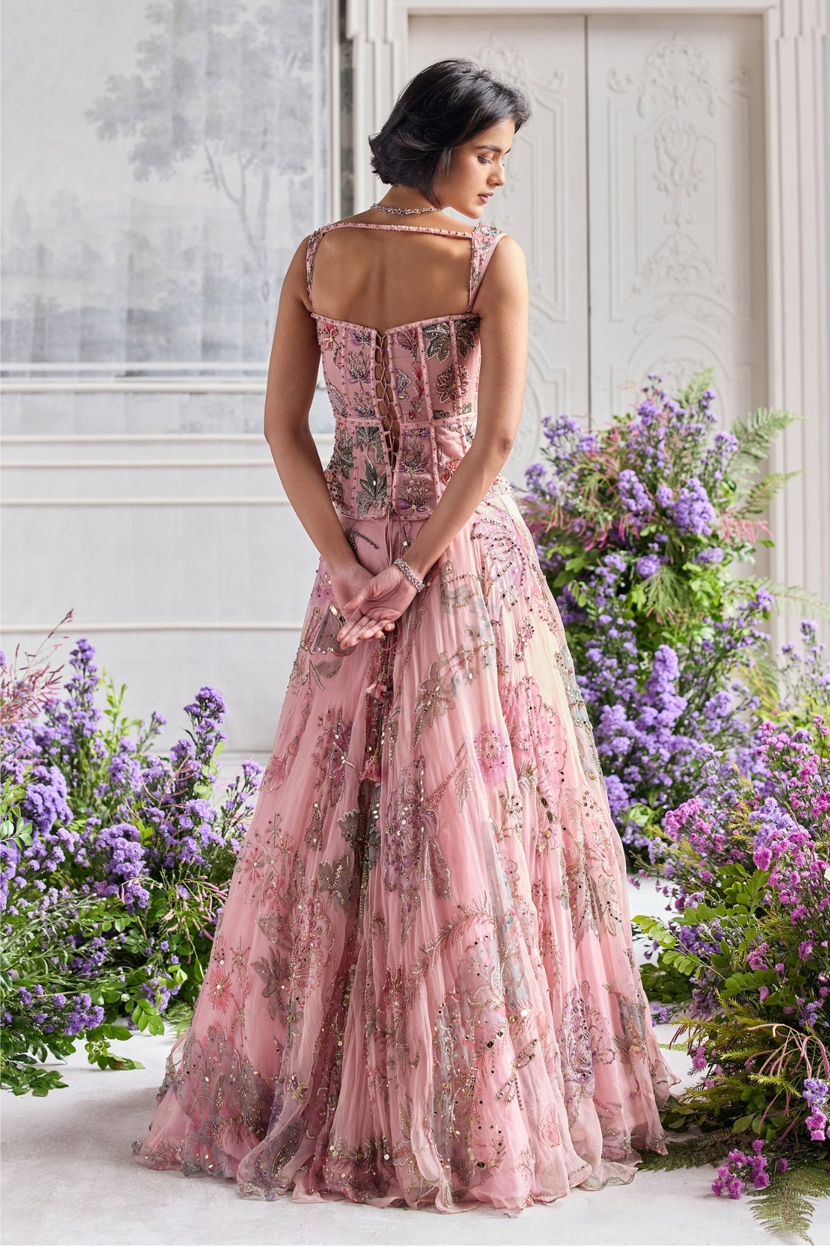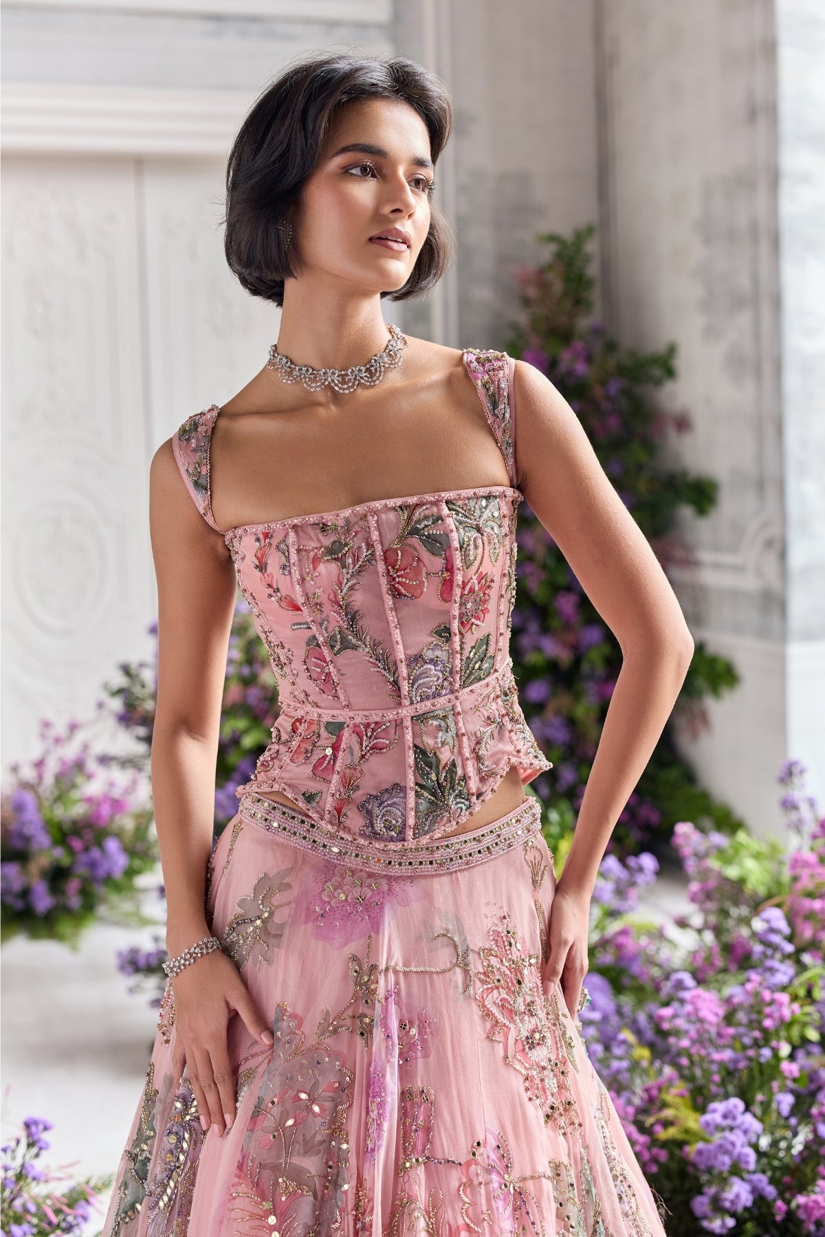 Hand Embroidered Corset Top Featuring Detachable Strap And Embroidered Lehenga Paired With Dupatta
