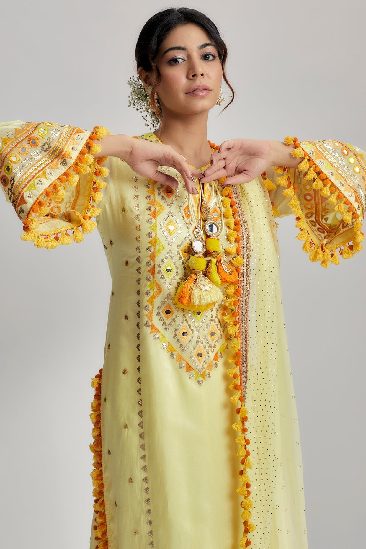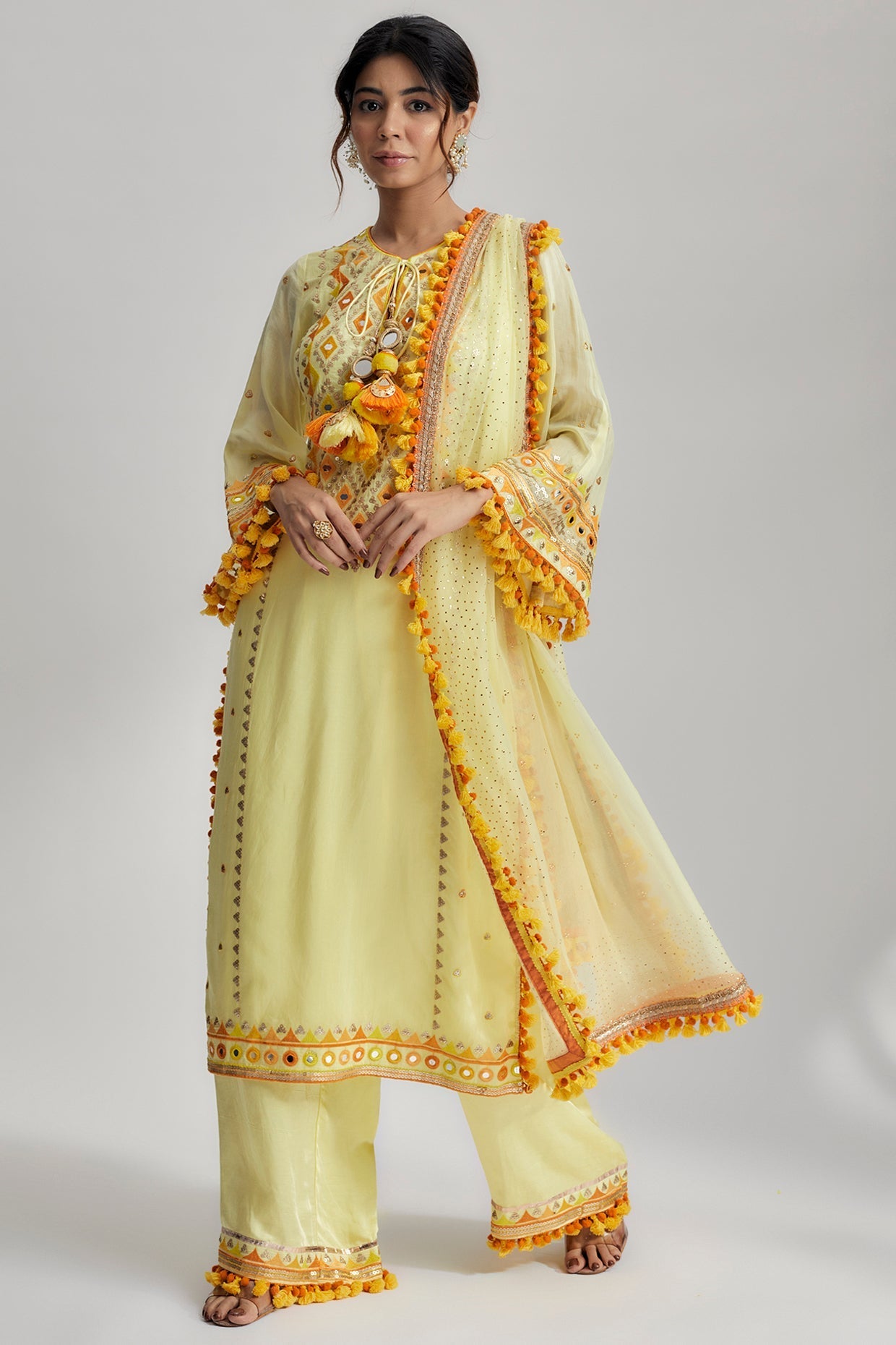 Fabric Composition:Long Kurta - Cotton silk Palazo - Linen Satin Dupatta - Chiffon