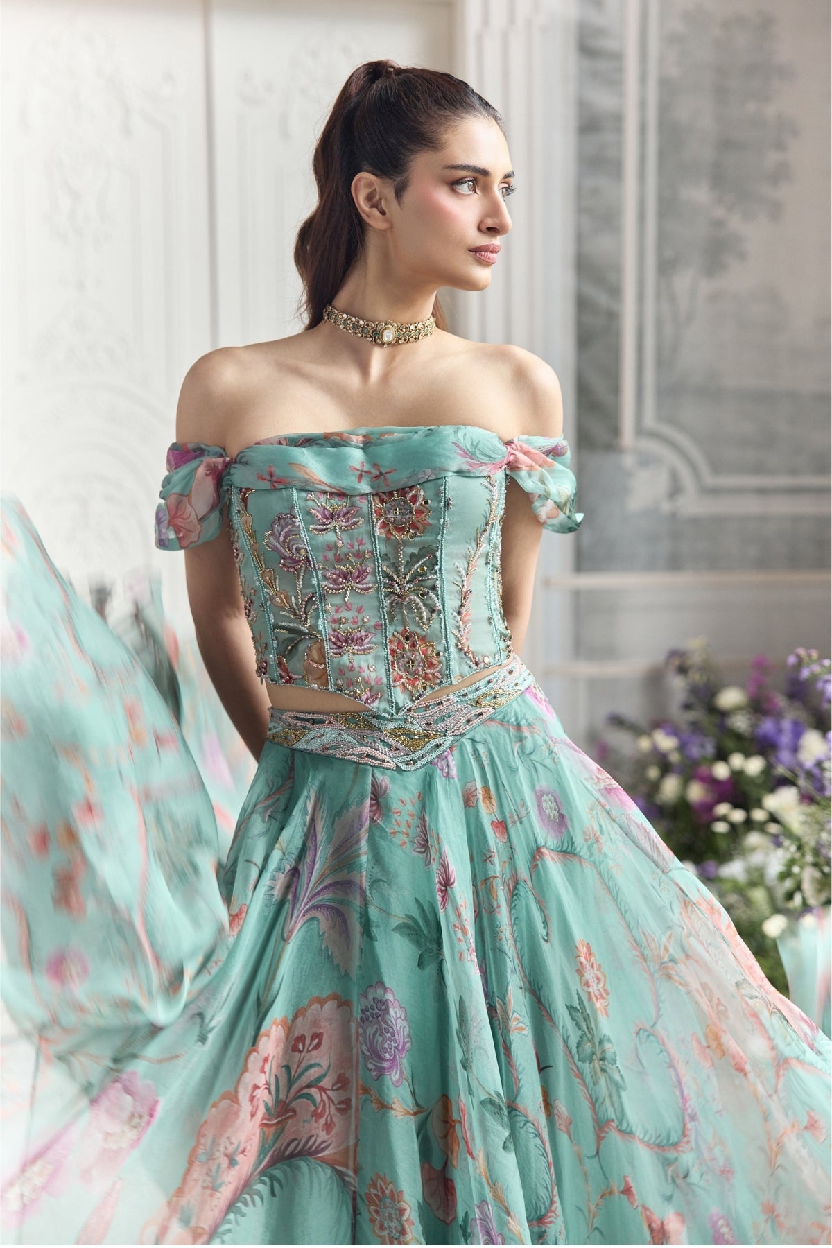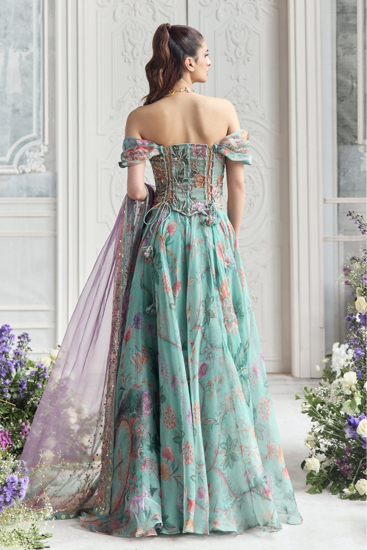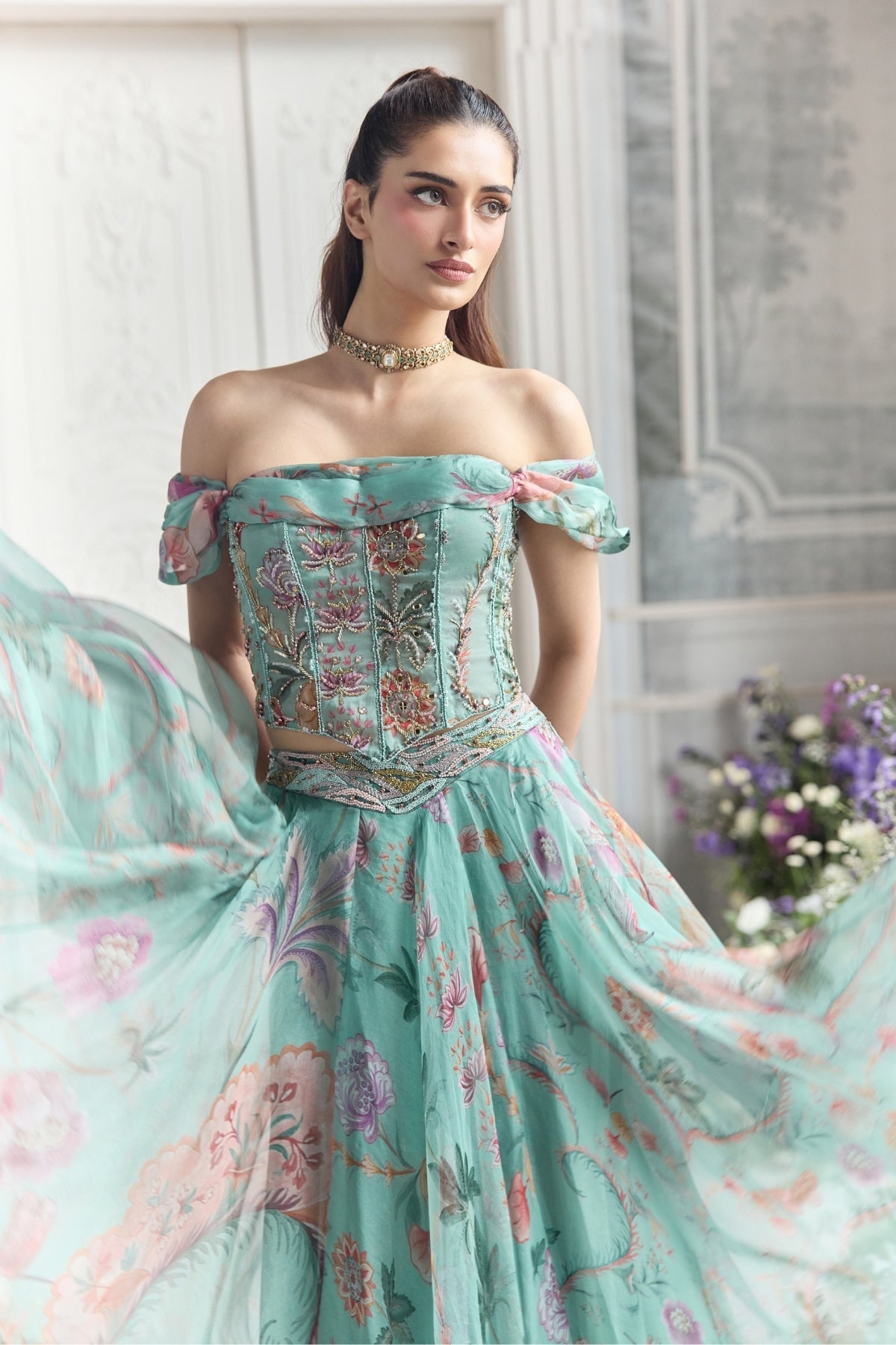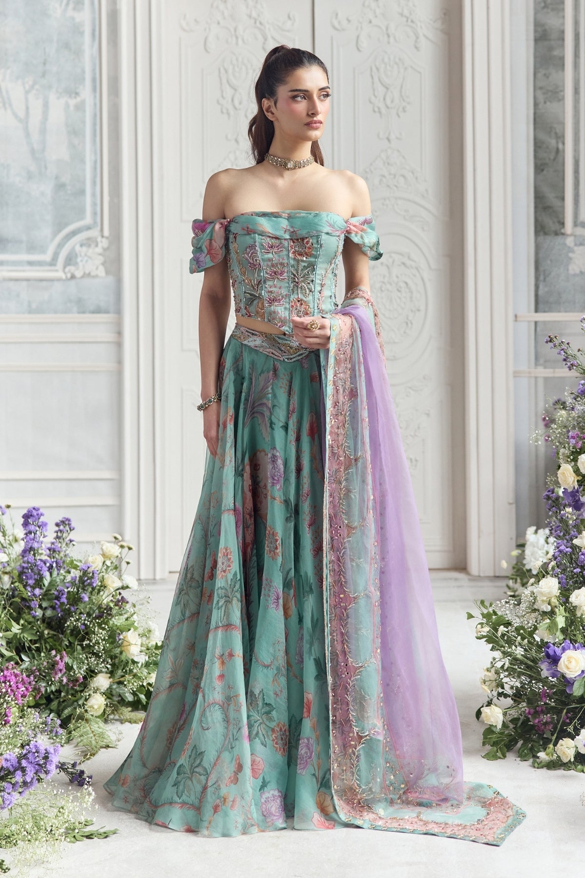 Embroidered Off Shoulder Corset Top Paired With Embroidered Dupatta And Floral Lehenga