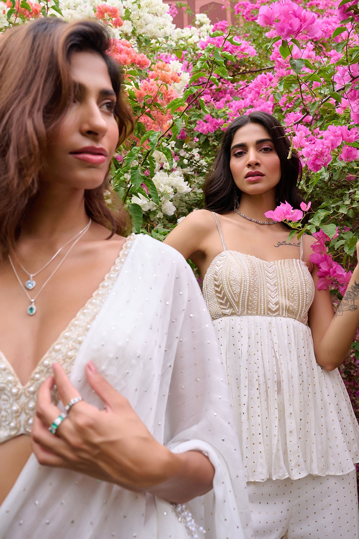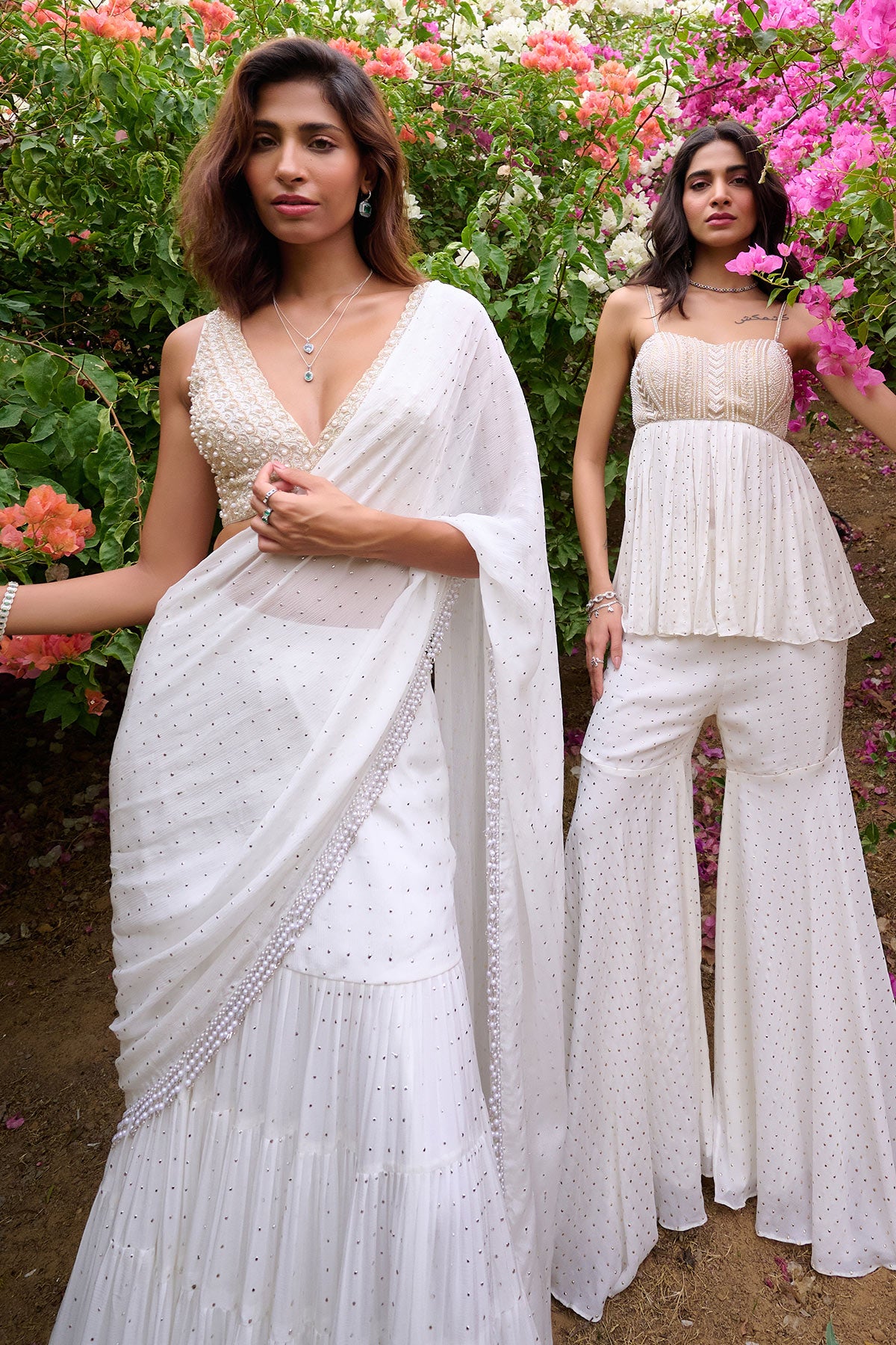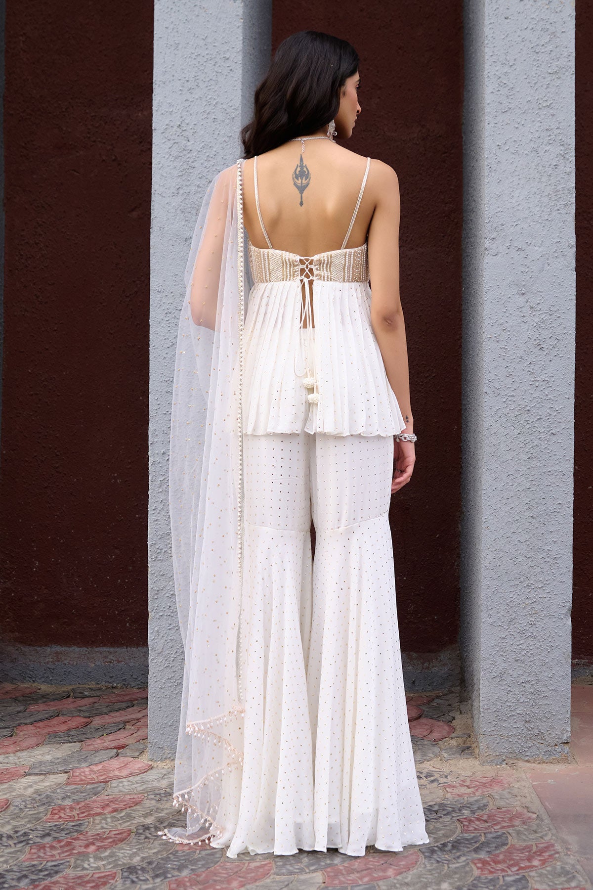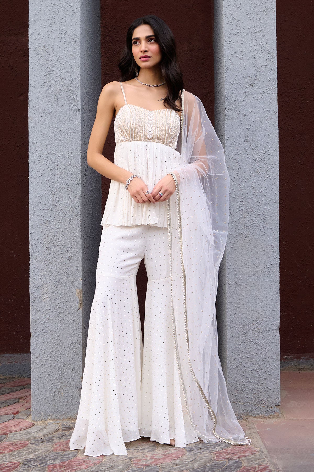 Ivory georgette sharara paired with ivory pearl embellished spaghetti peplum top and tulle dupatta