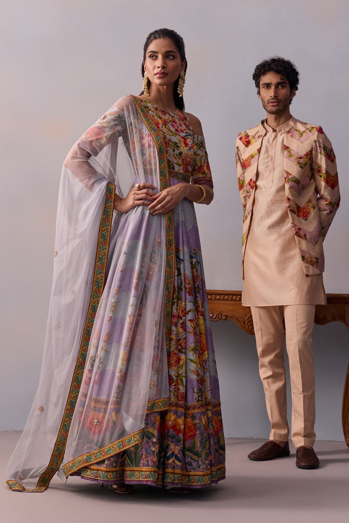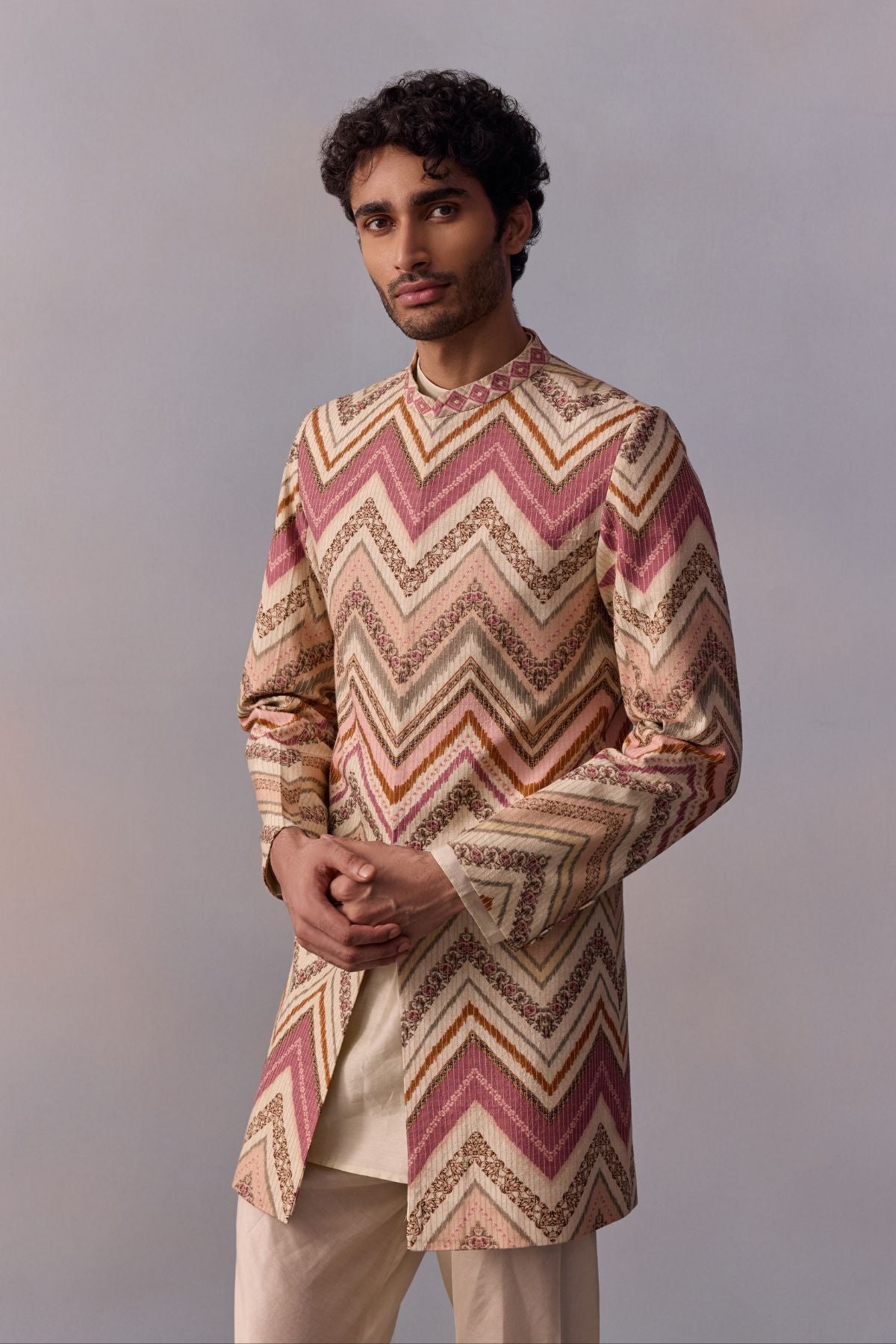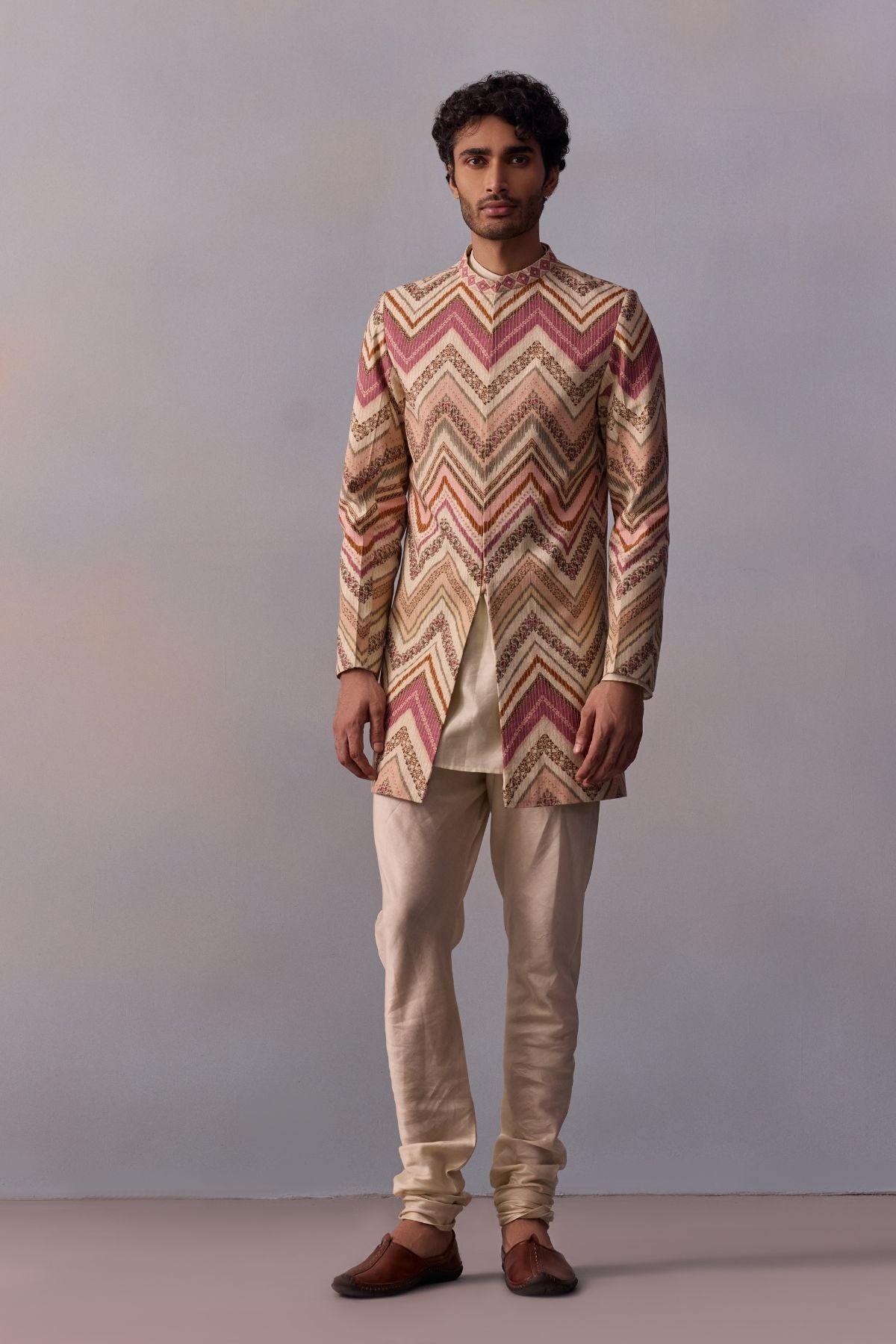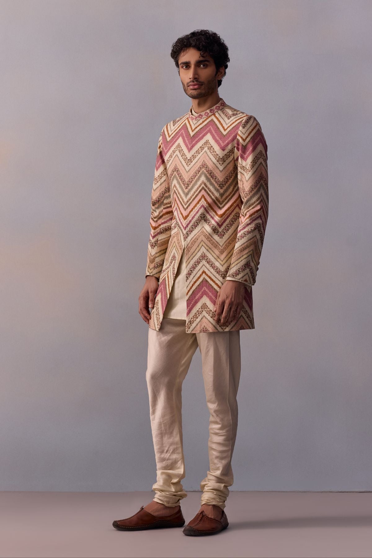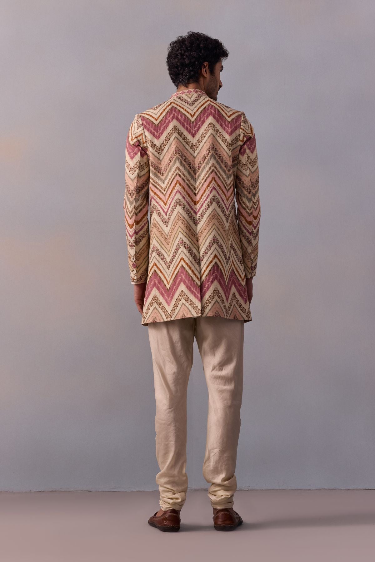 Take your festive style up notch higher in our unique aztec print Achkan set highlighted with textured threadwork, paired with complementing churidar.