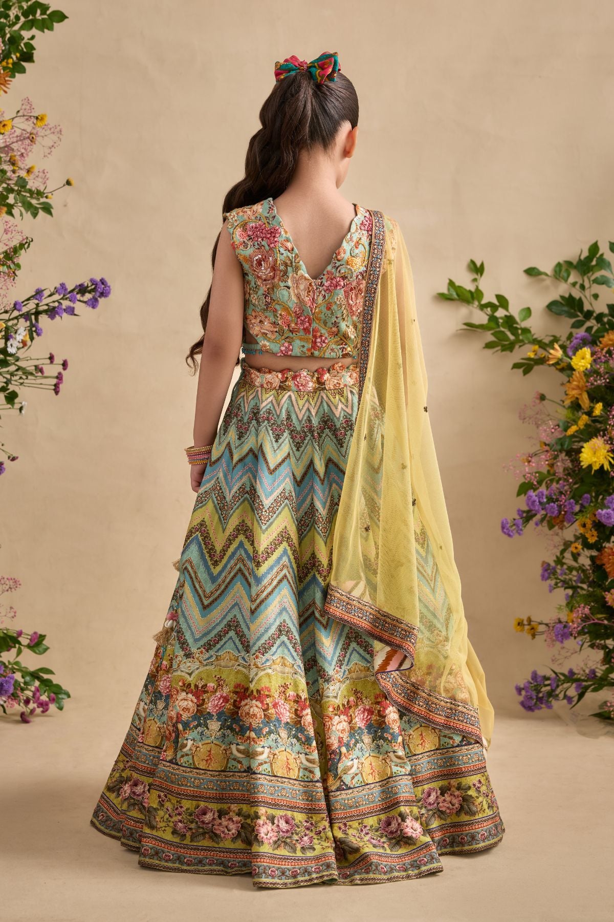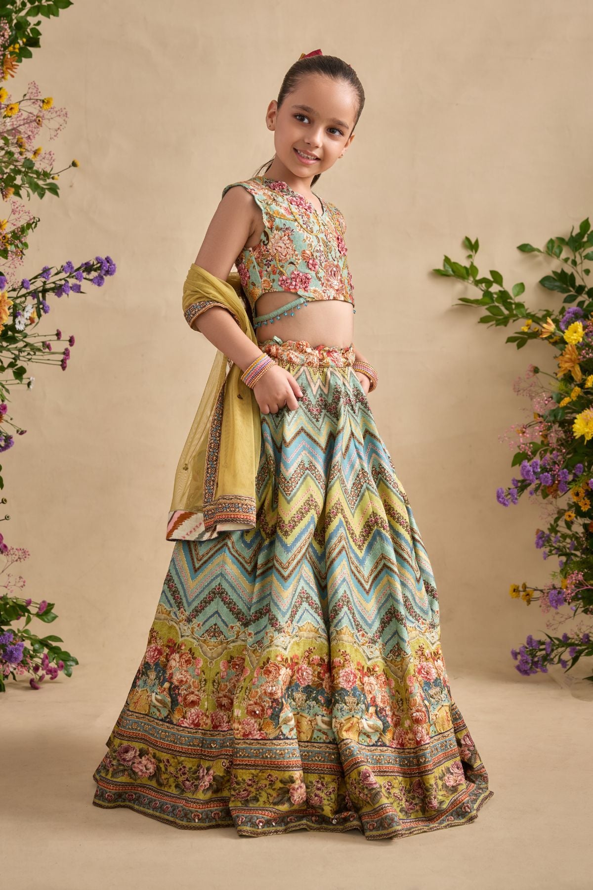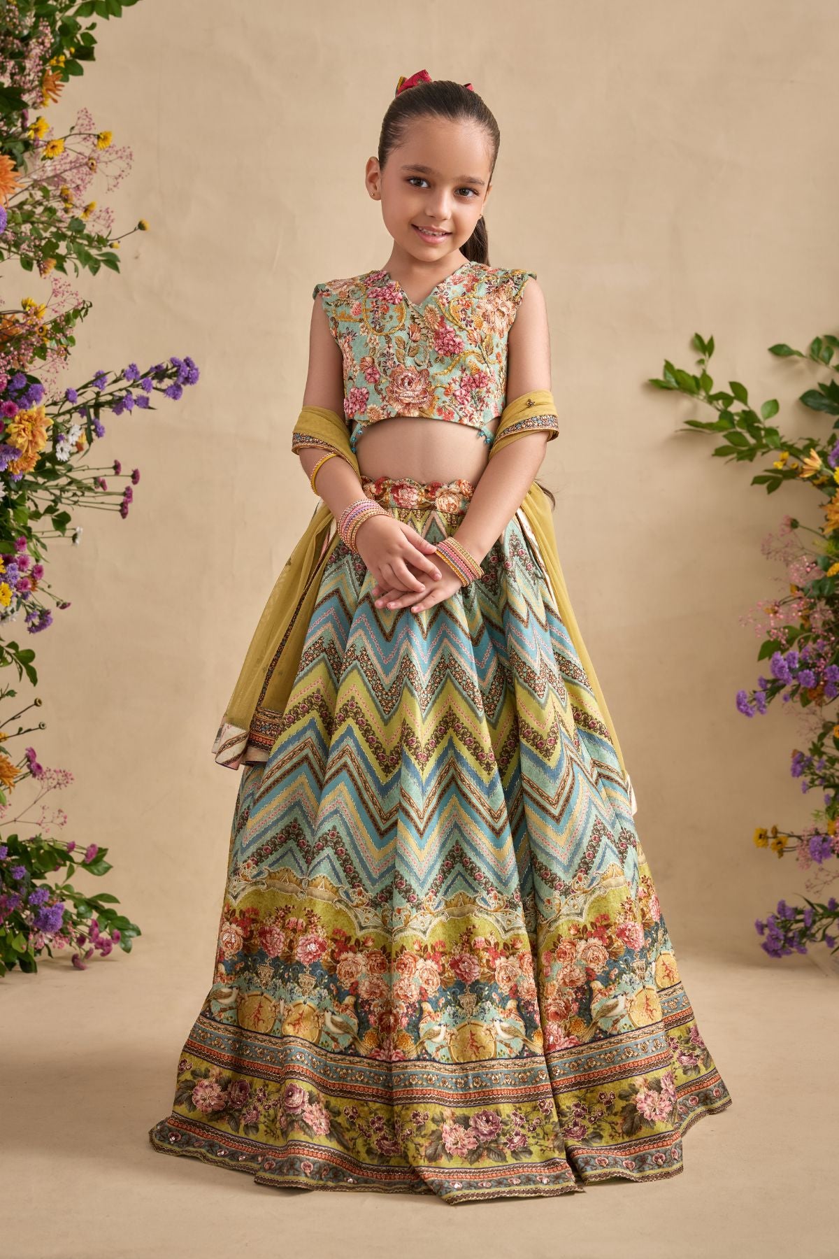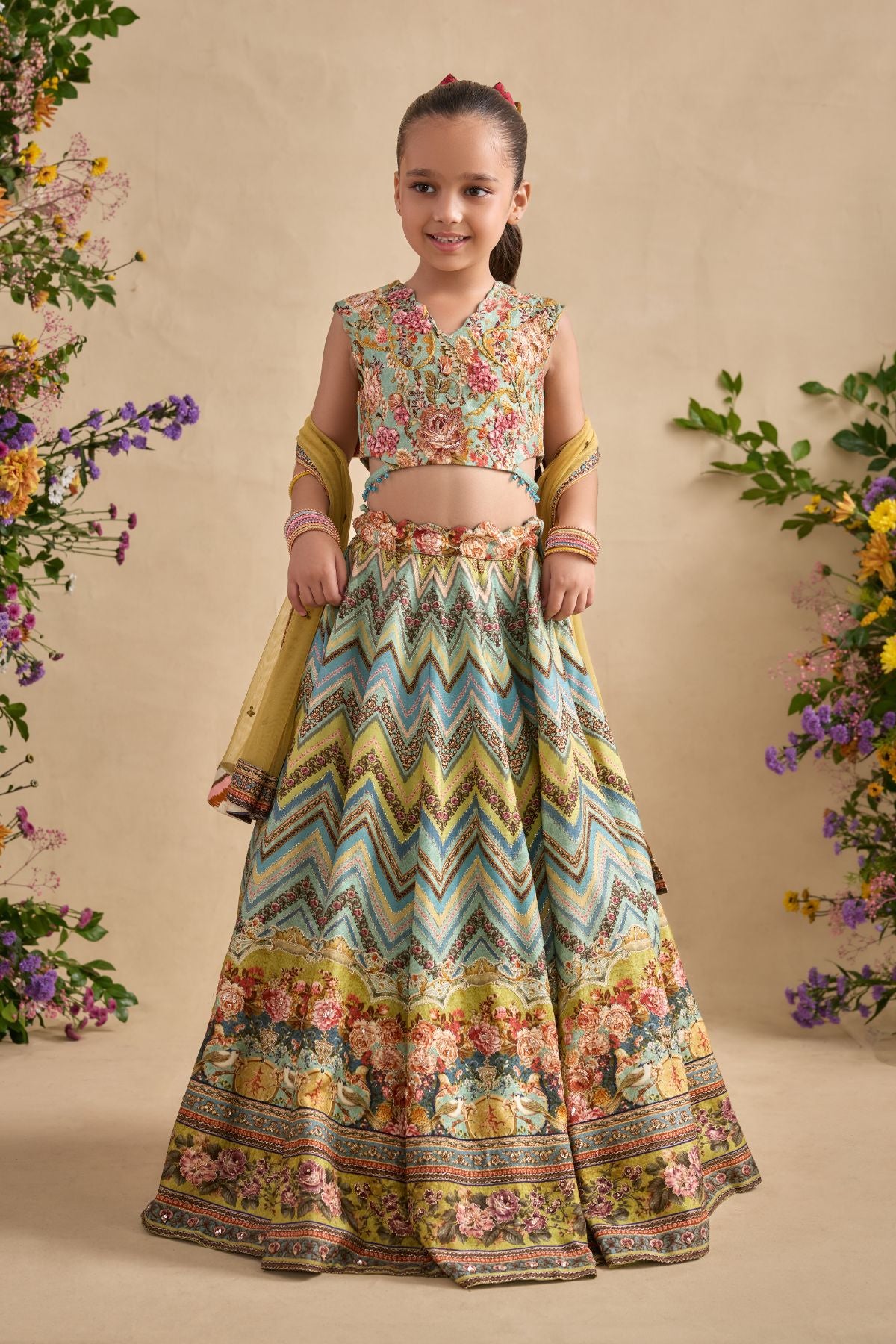 Adorn your sugarbun with our pretty Pavika lehenga set. Paired With A Meticulously Embroidered Blouse And Styled With A Co-Ordinated Dupatta. Perfect to carry on wedding occasions.