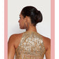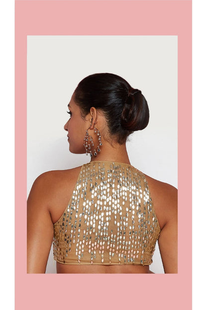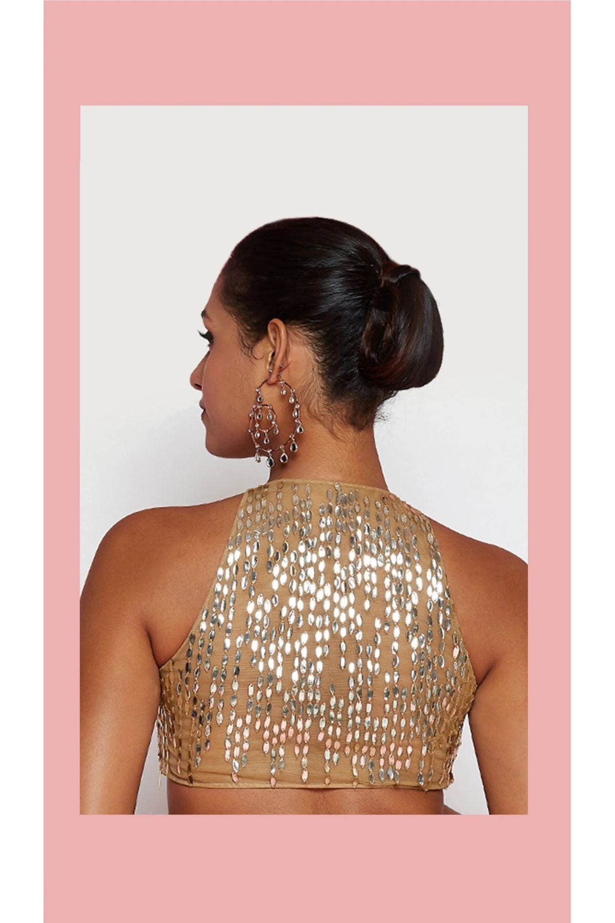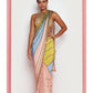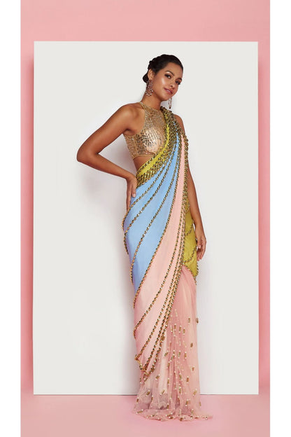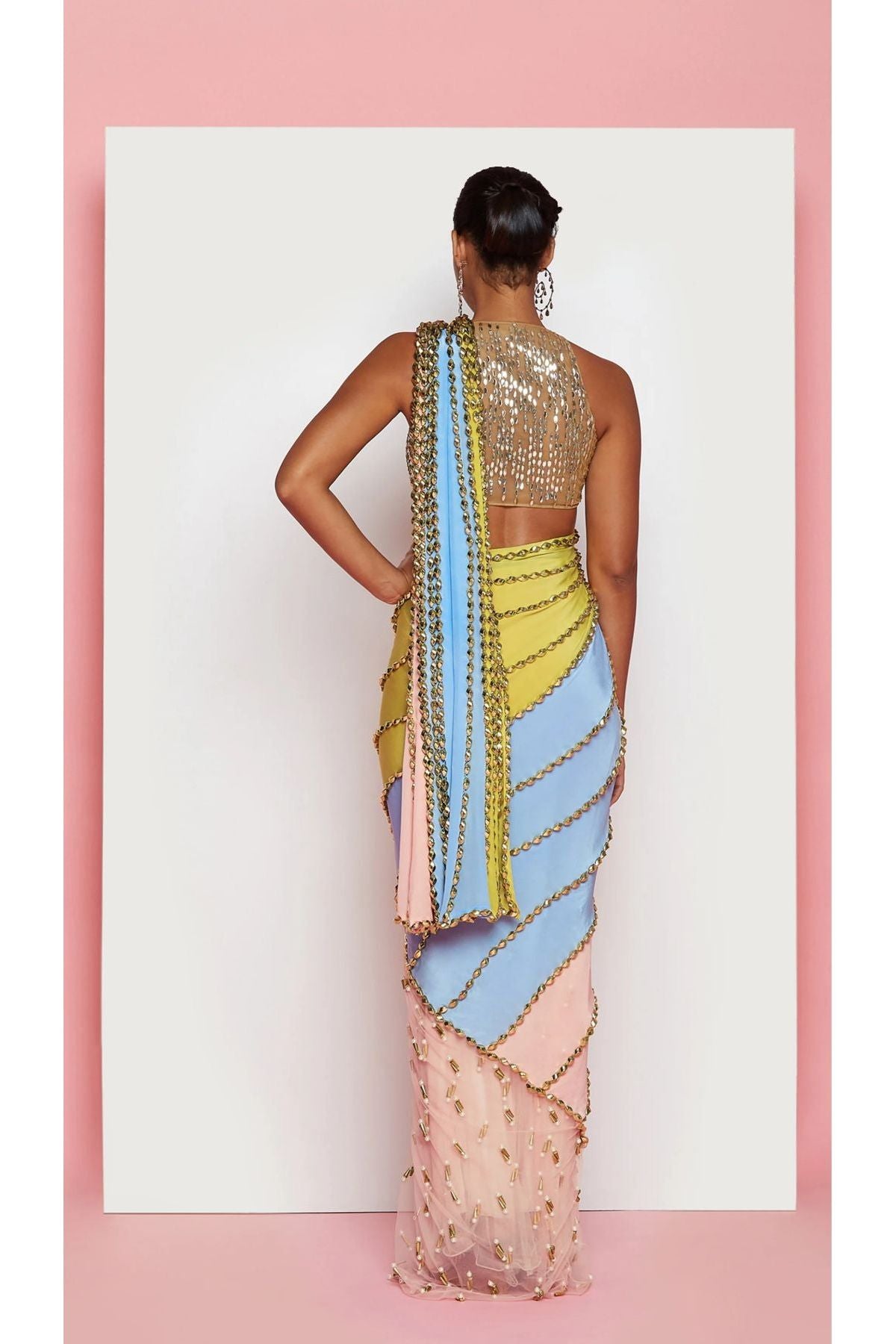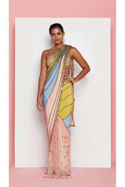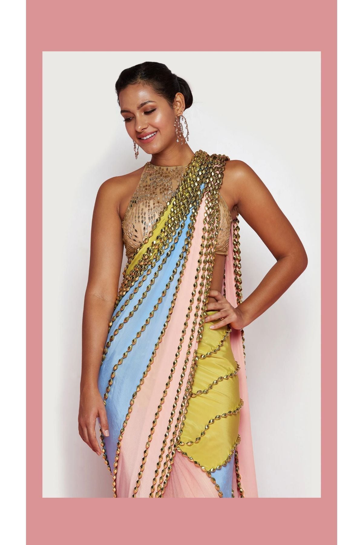 A Tri-colored pre-stitched saree paired with a gold snakeskin embroidered halter neck blouse. The set doesn't include a stitched petticoat . Only petticoat fabric is provided. Incase you would like to get a stitched petticoat with the set, you can connect with Us
